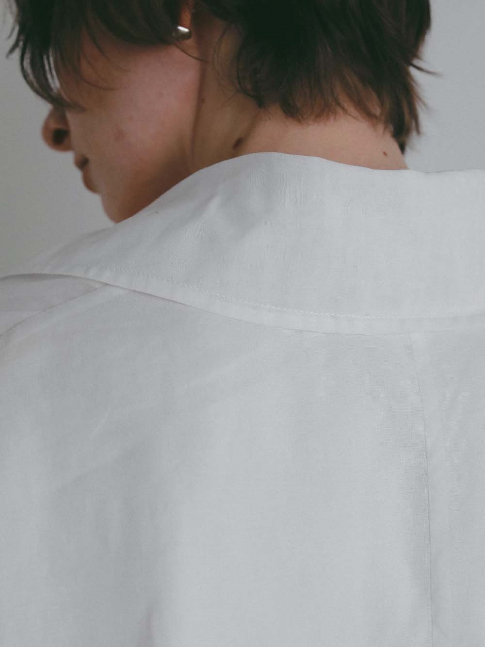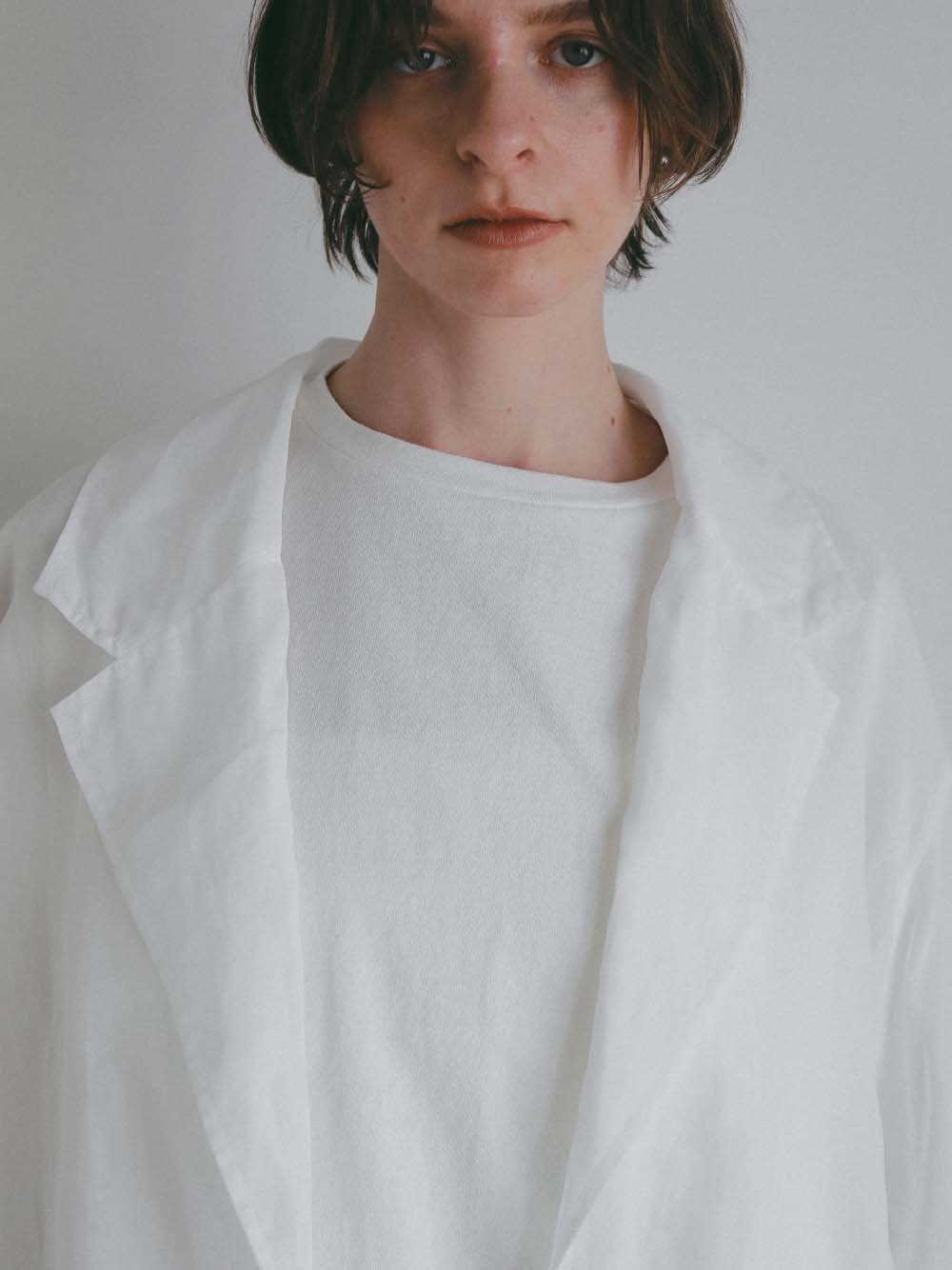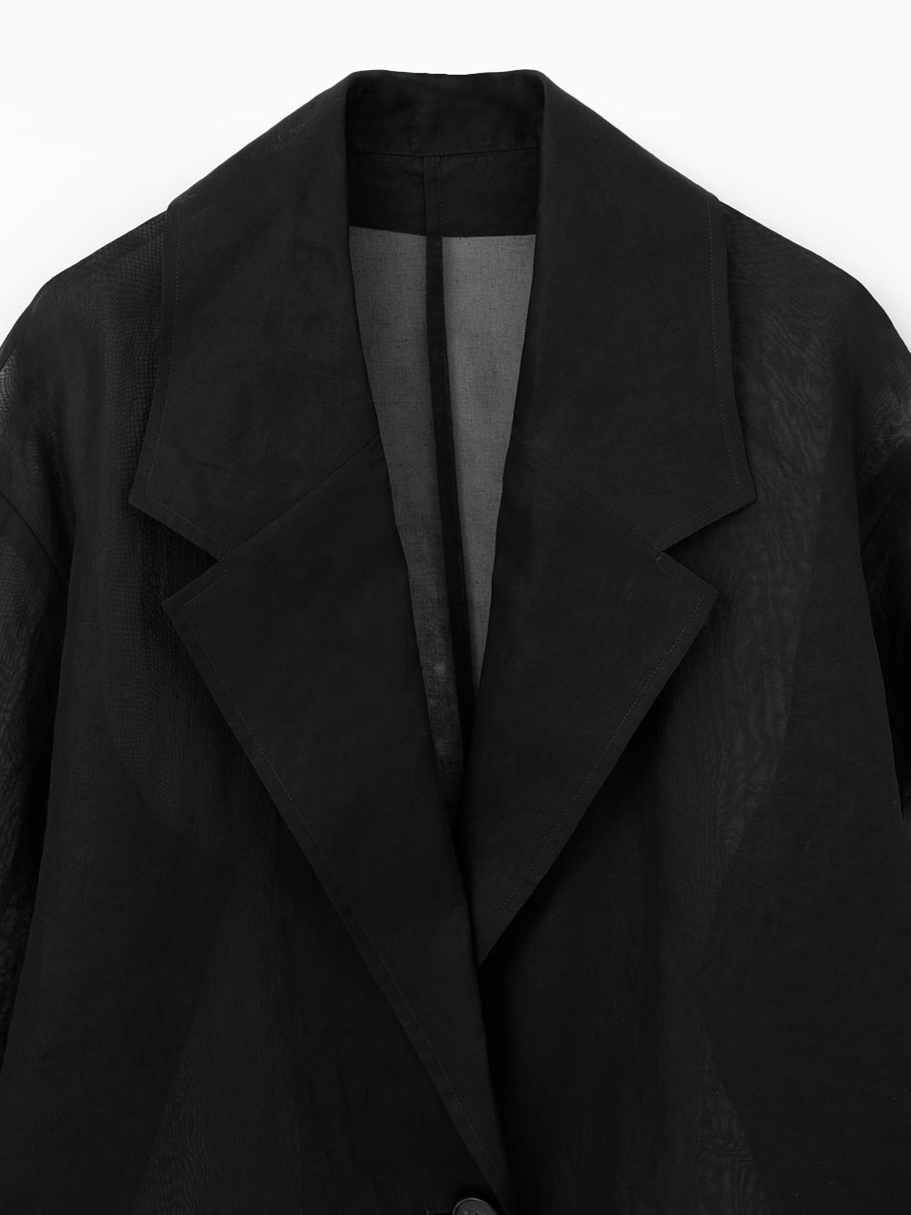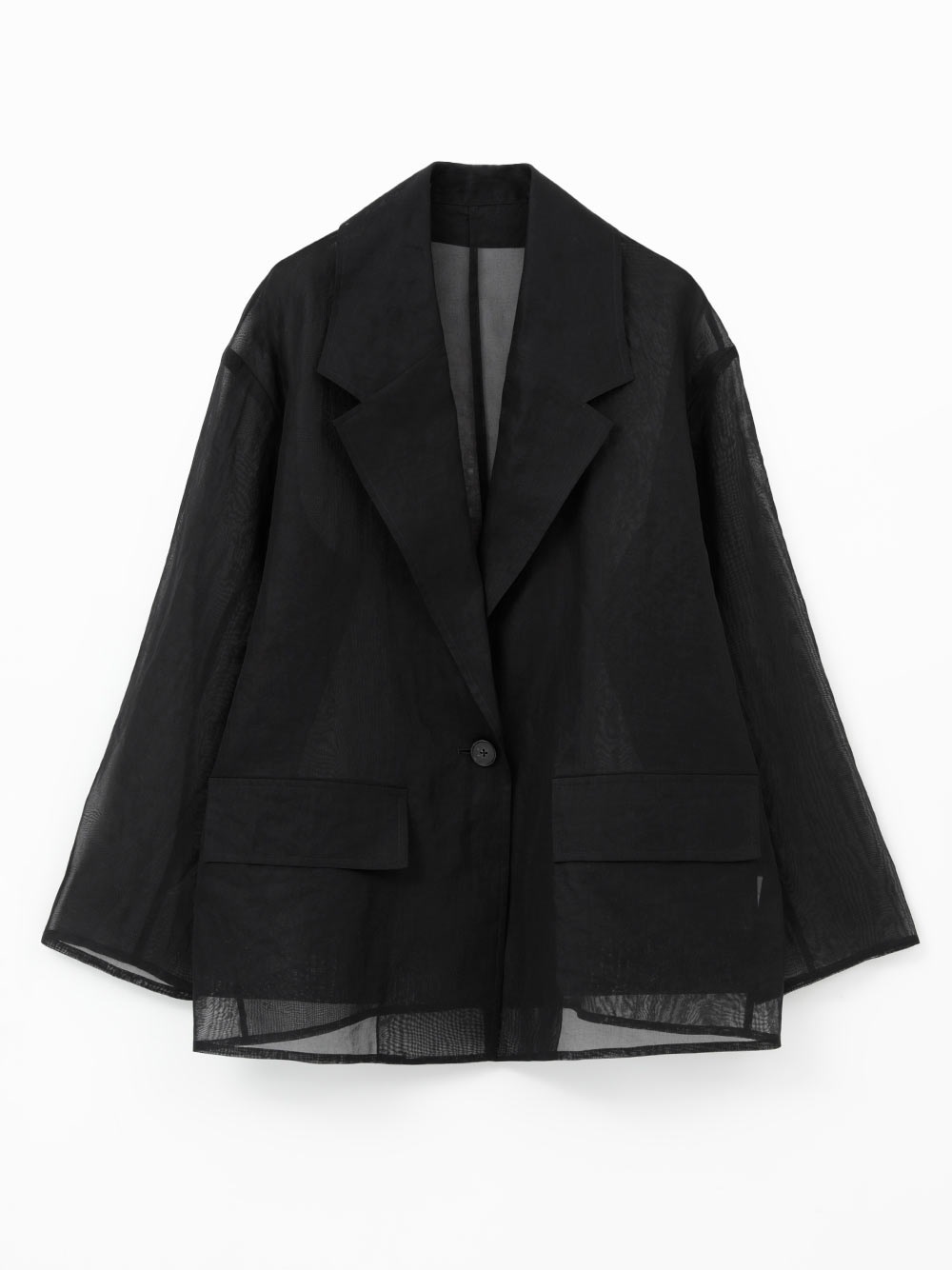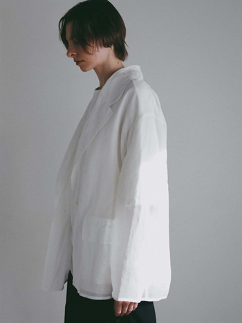 オーバーサイズのボディに大き目のラペルが目を引く1枚。適度な透けを活かしたモードな雰囲気のアイテム。