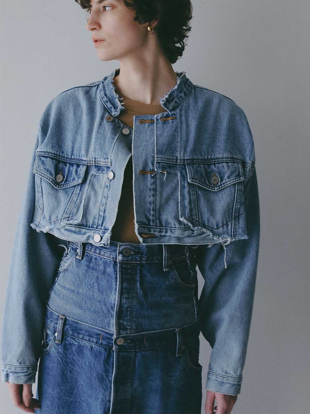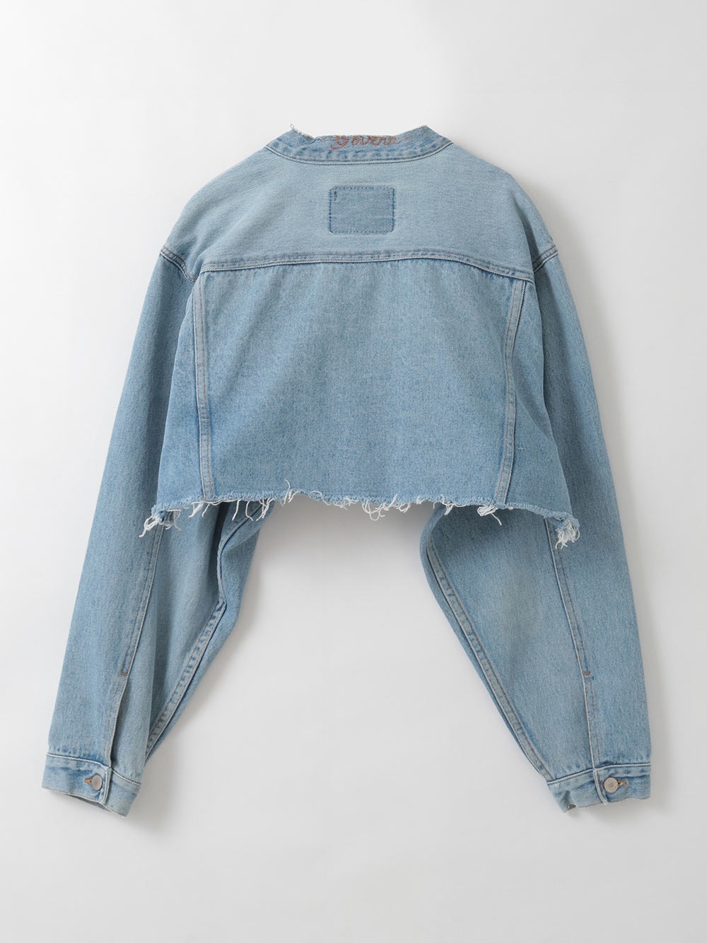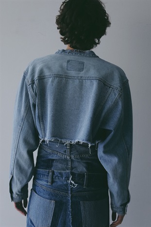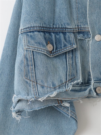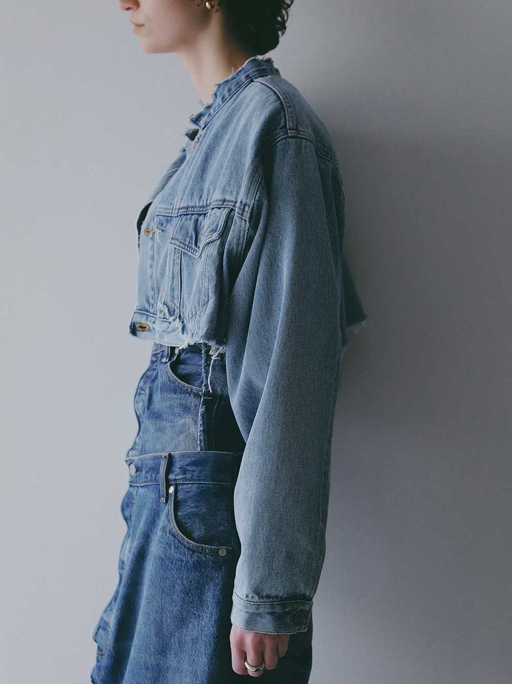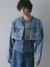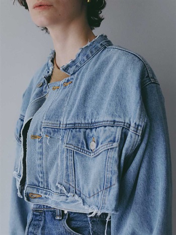 元々ややオーバーサイズのGジャンをベースにカットし、前立て部分にディテールを加えてリフォルムした、胸下丈の超ショートデニムジャケット。