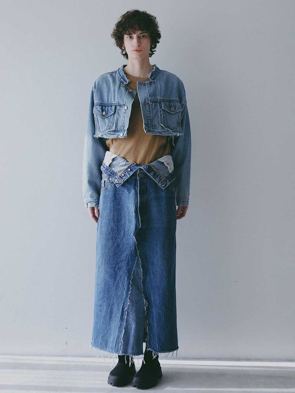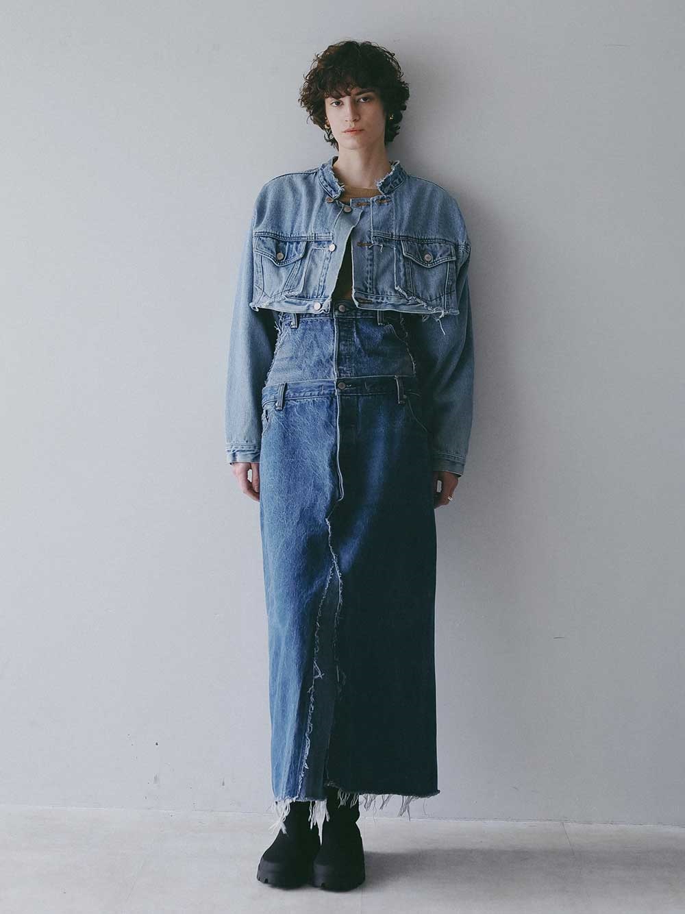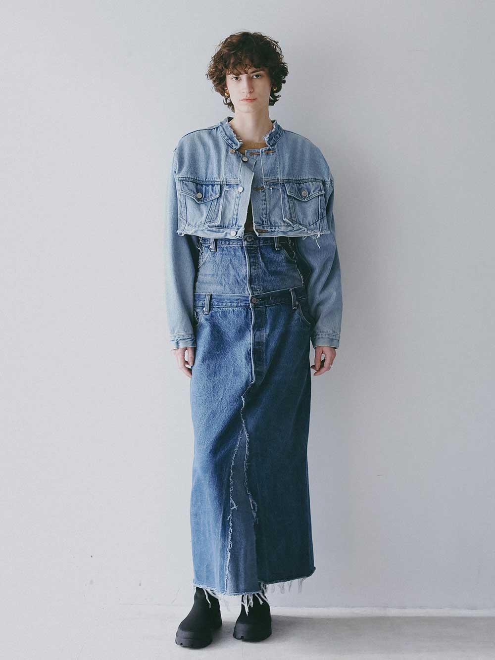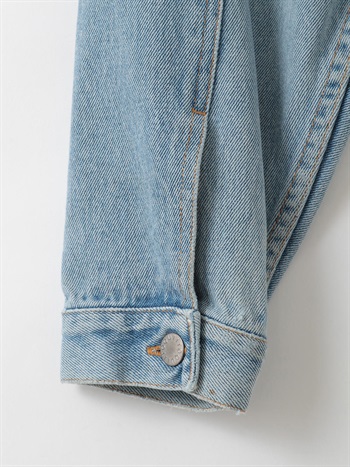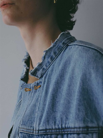 元々ややオーバーサイズのGジャンをベースにカットし、前立て部分にディテールを加えてリフォルムした、胸下丈の超ショートデニムジャケット。