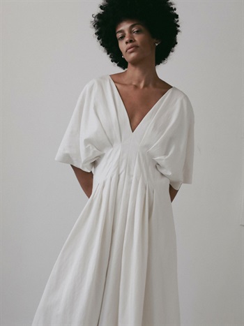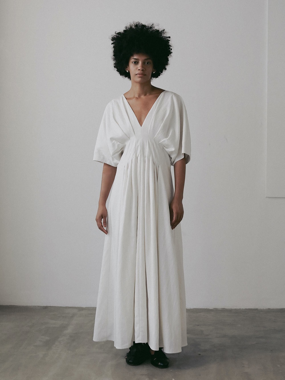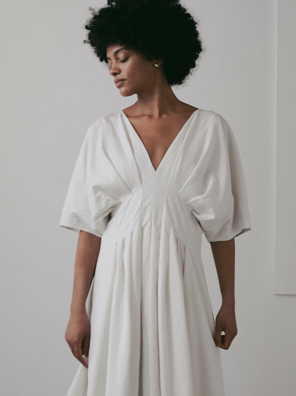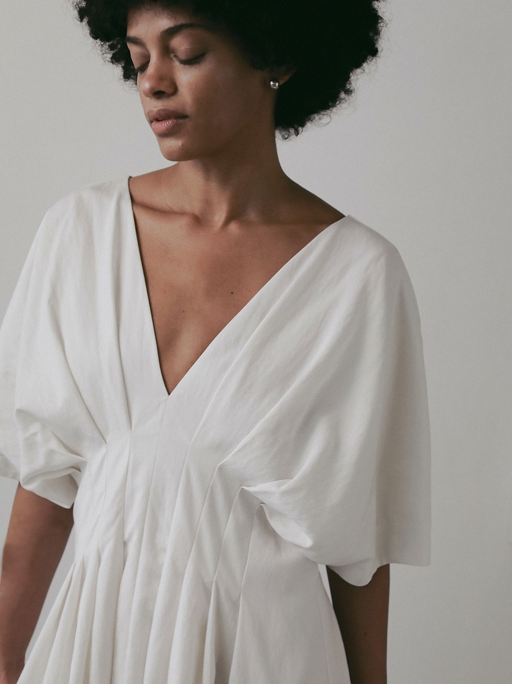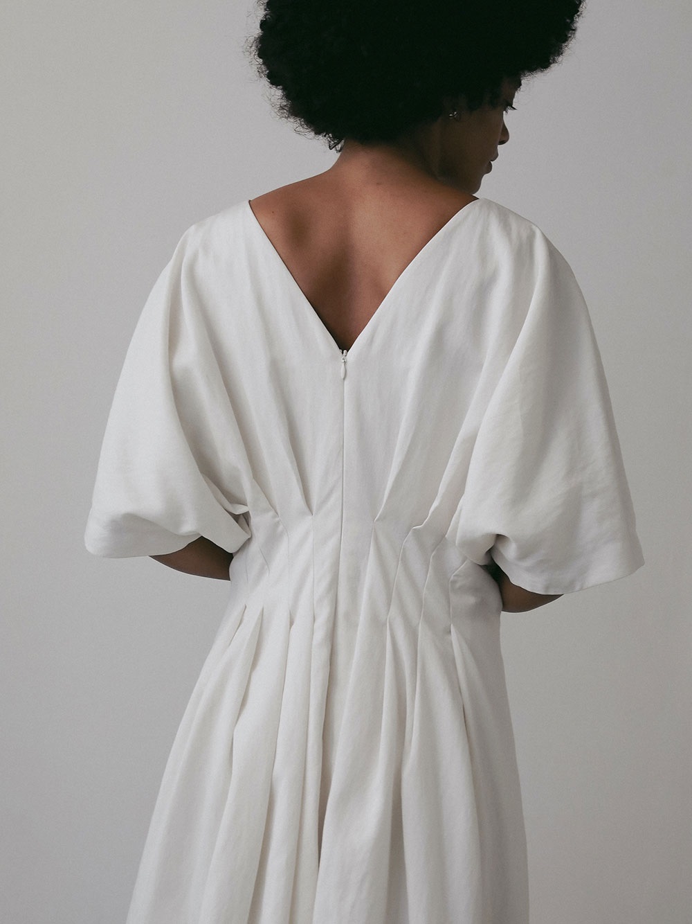 ウエストにタックを取りフィット&フレアのシルエットに仕上げたワンピース。たっぷりと生地を使ったボリューム感も華やかさを演出します。メリハリのあるシルエットでシンプルながら存在感のあるアイテム。深めに開いた衿元もヘルシーな抜け感を感じさせるポイントに。