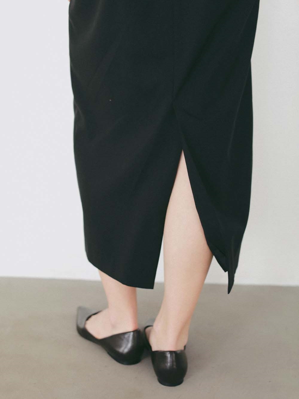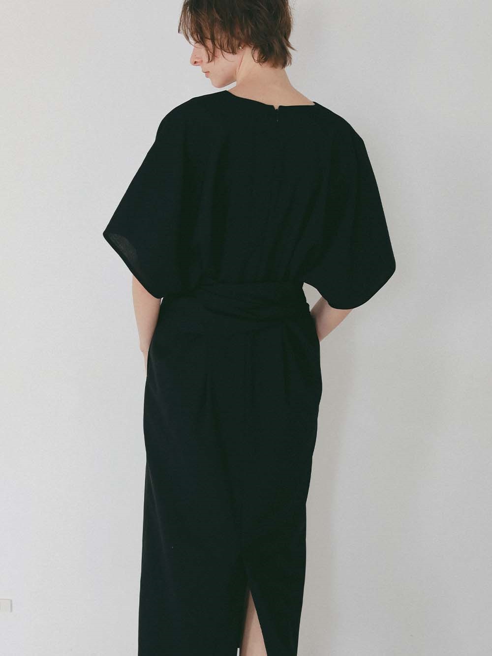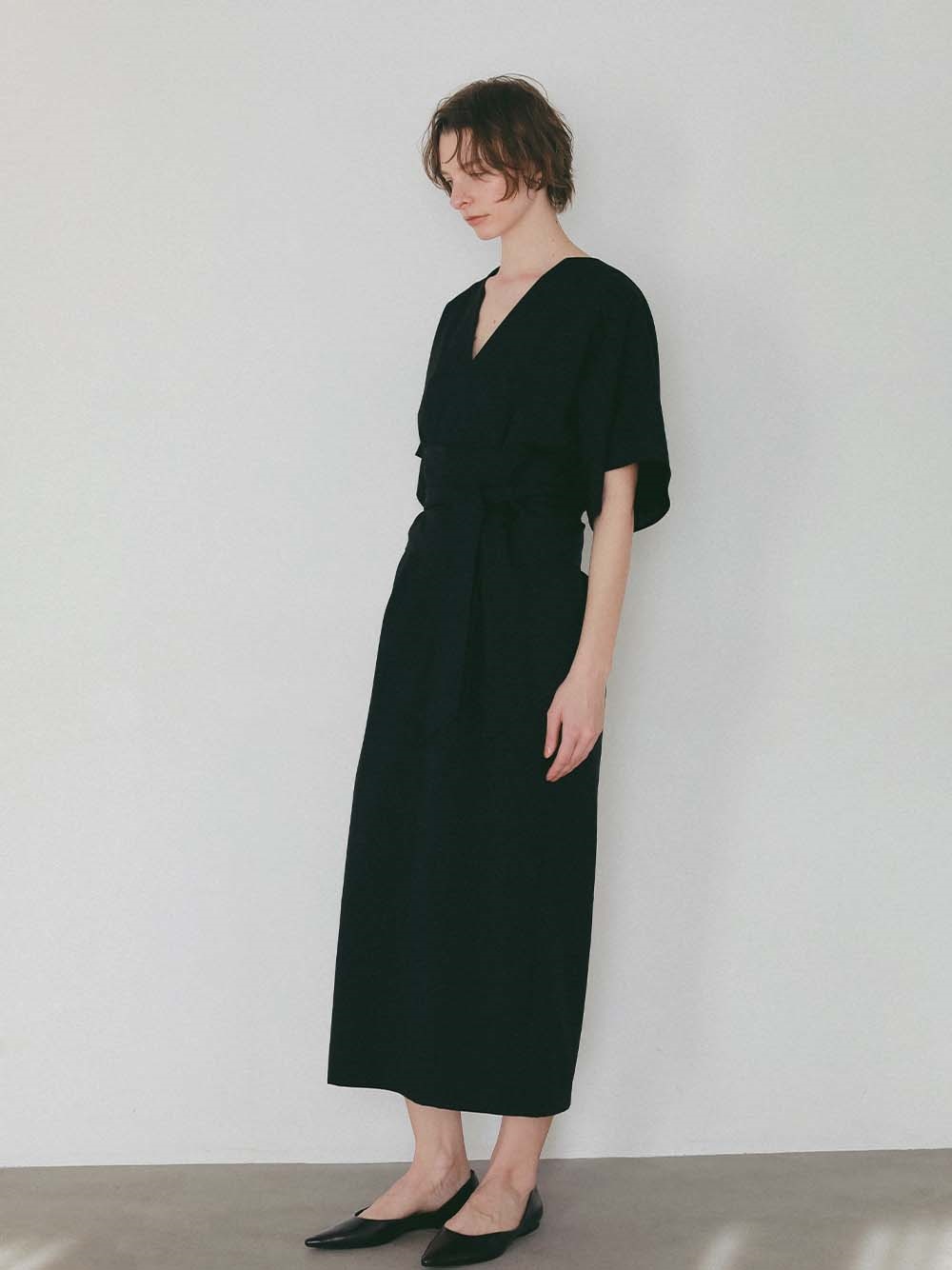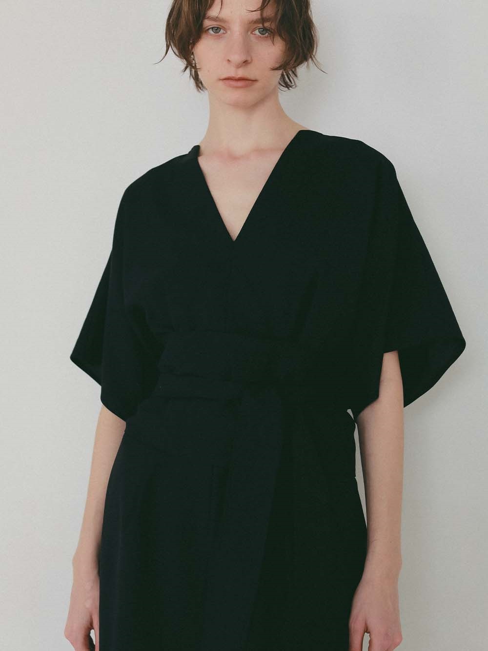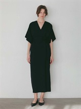 ウエストのタックと綺麗なVネックがスッキリ見せてくれる1枚。