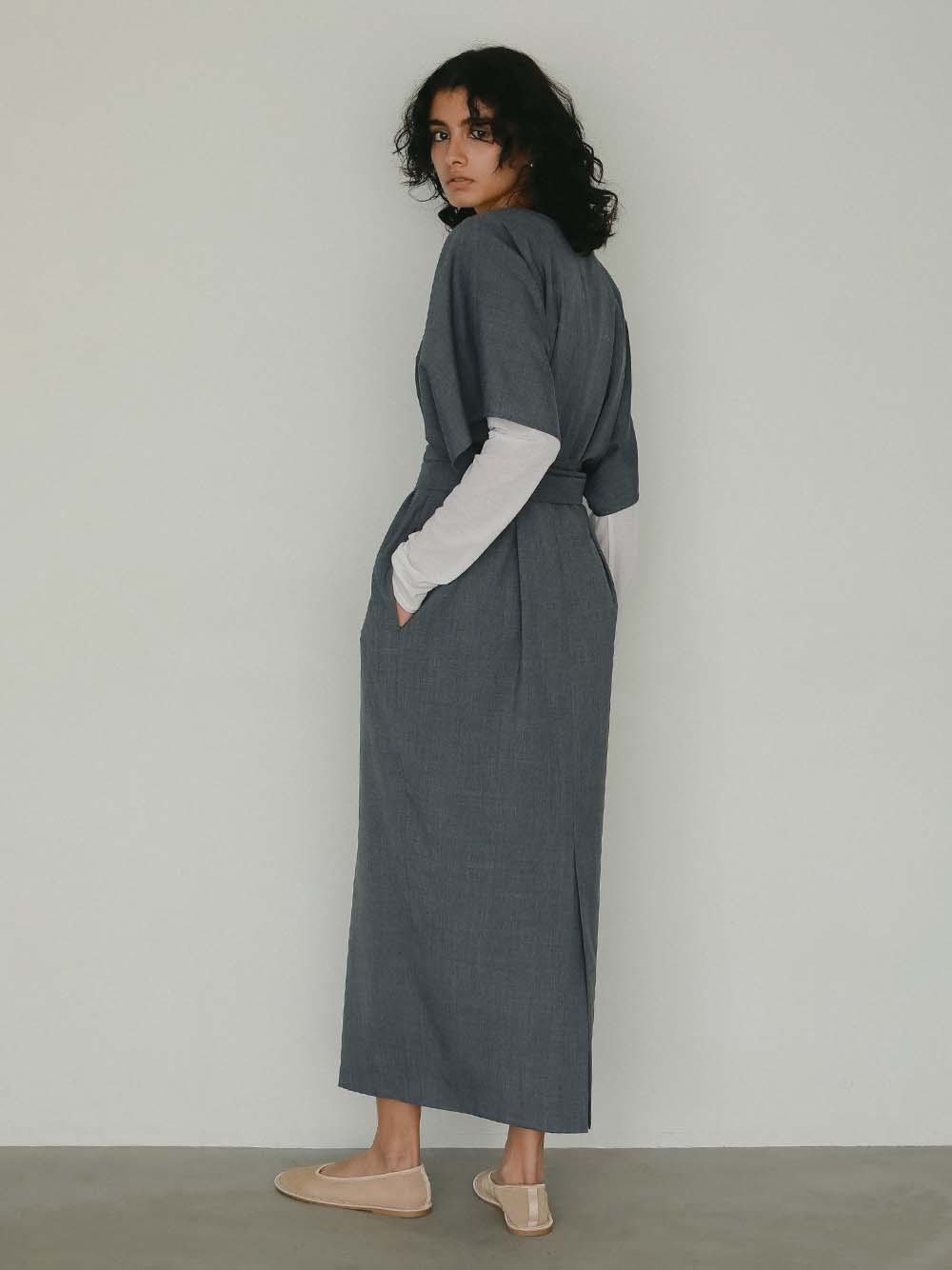 付属の共布ベルトは太さがイレギュラーなデザインでウエストマークした時にワンポイントになります。