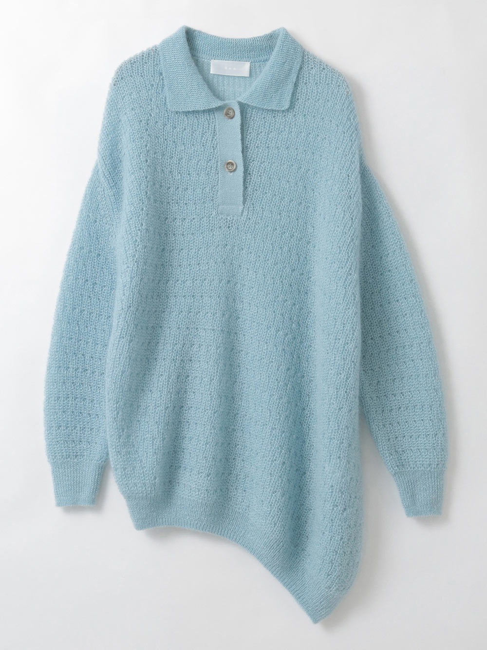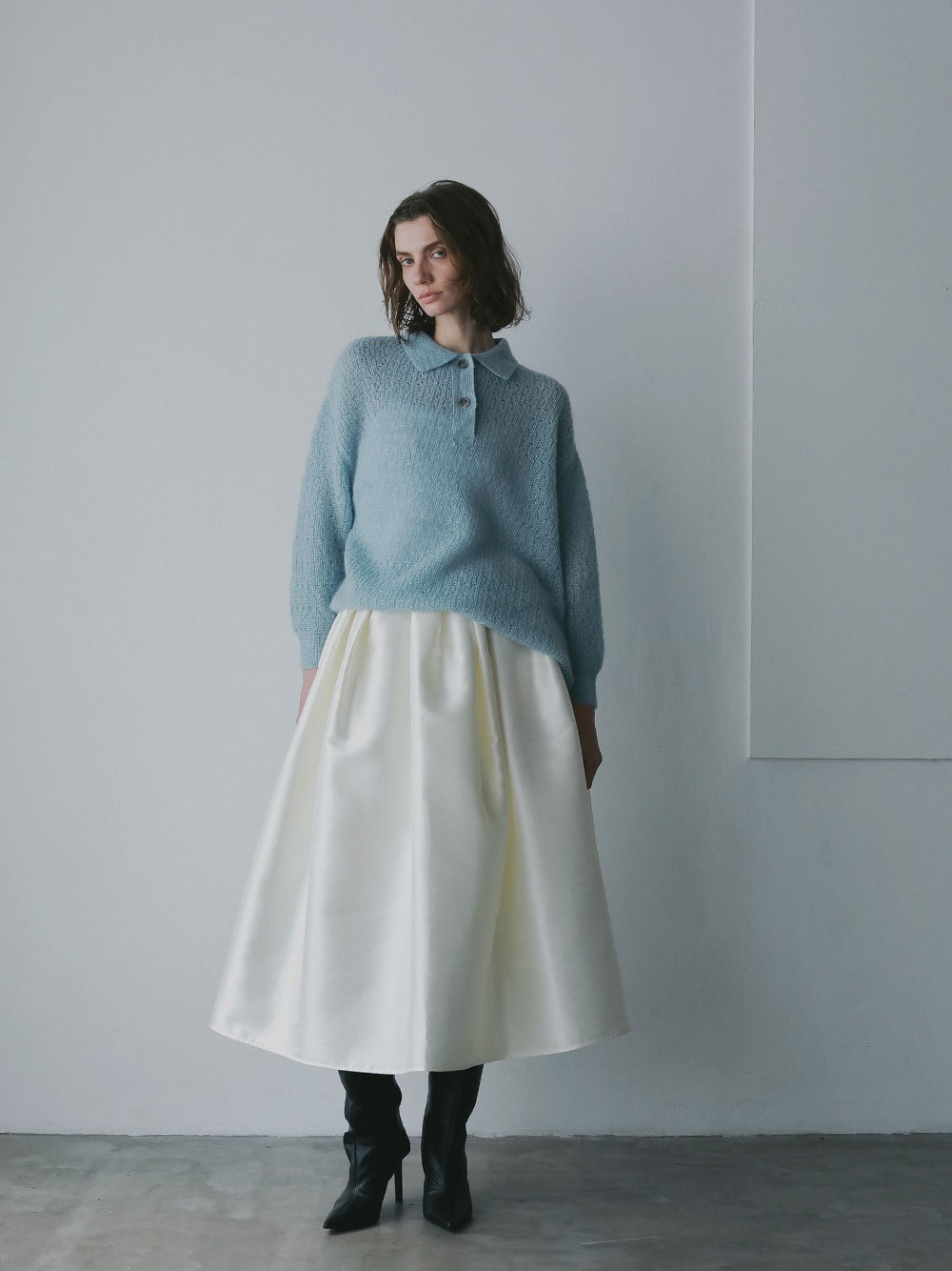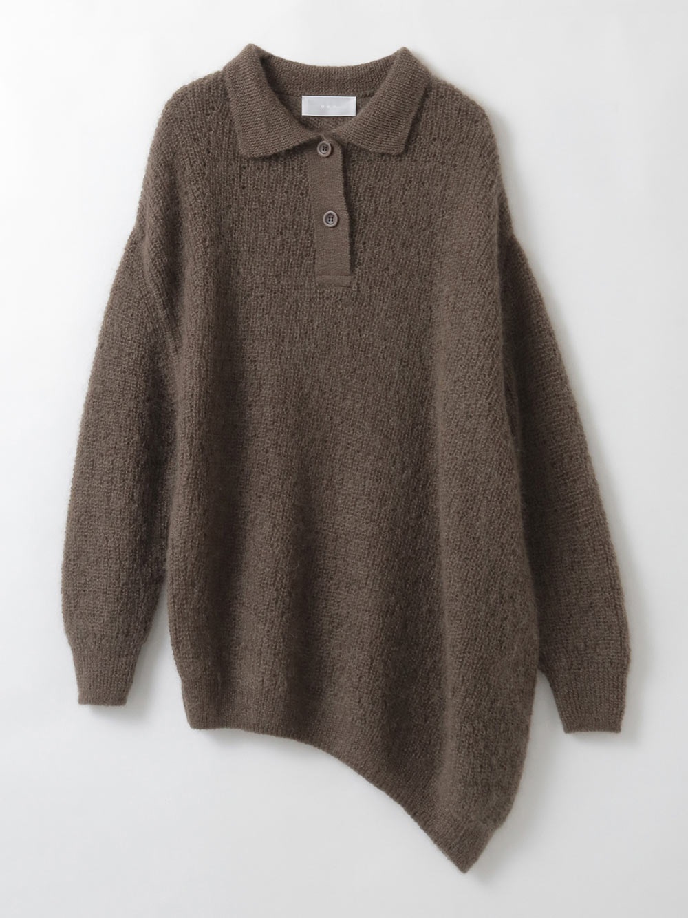 裾がアシンメトリーになっており、着用した際に見え方が変化する面白さがあります。