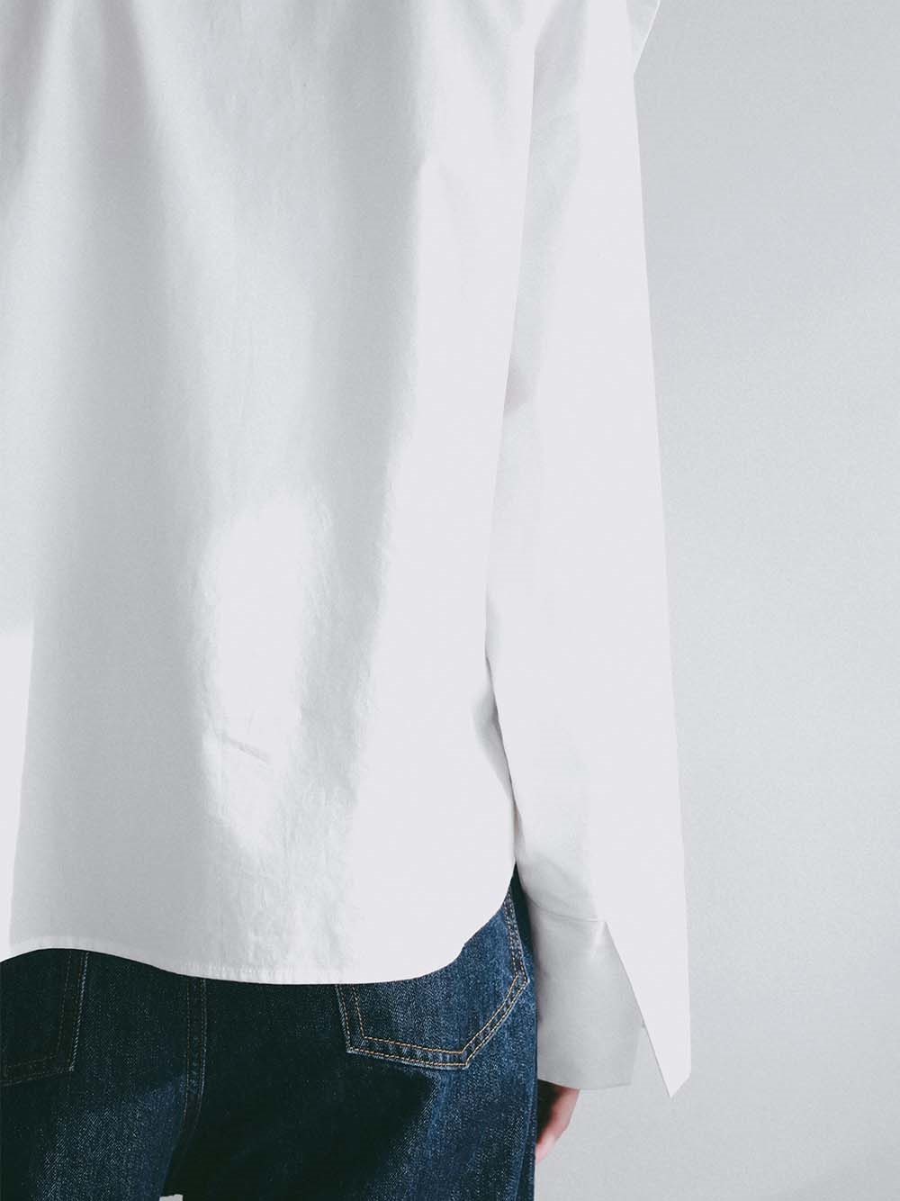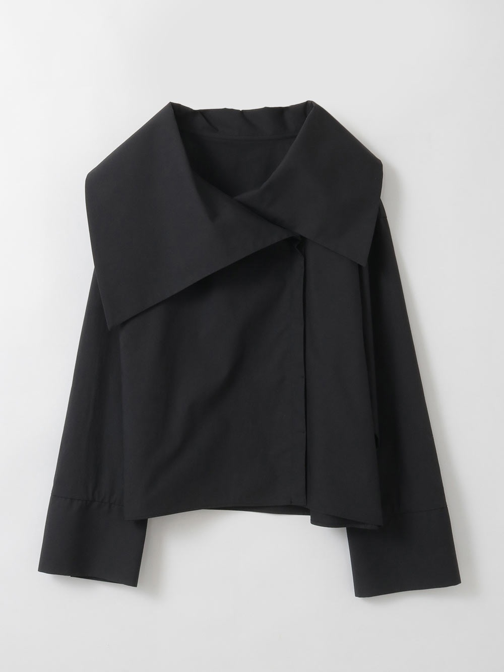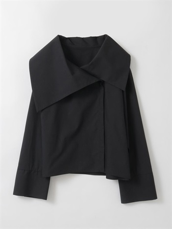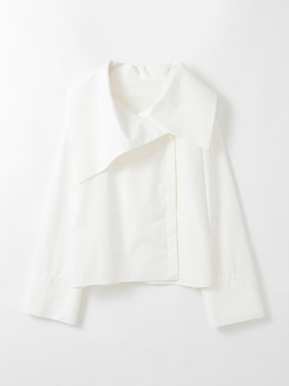 お顔回りを華やかに演出するアシンメトリーデザインの大きな衿が印象的なブラウス。