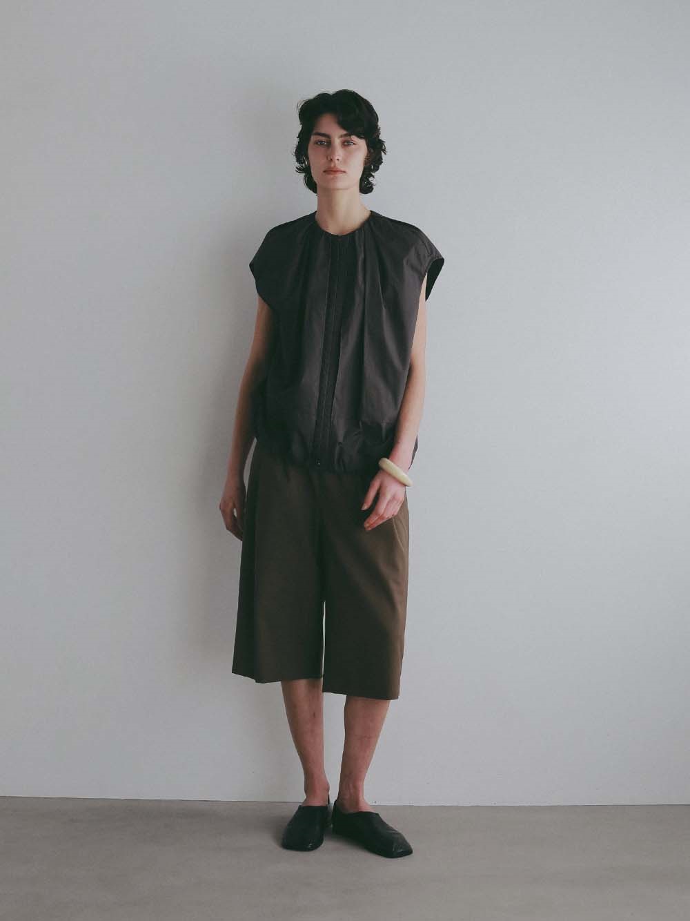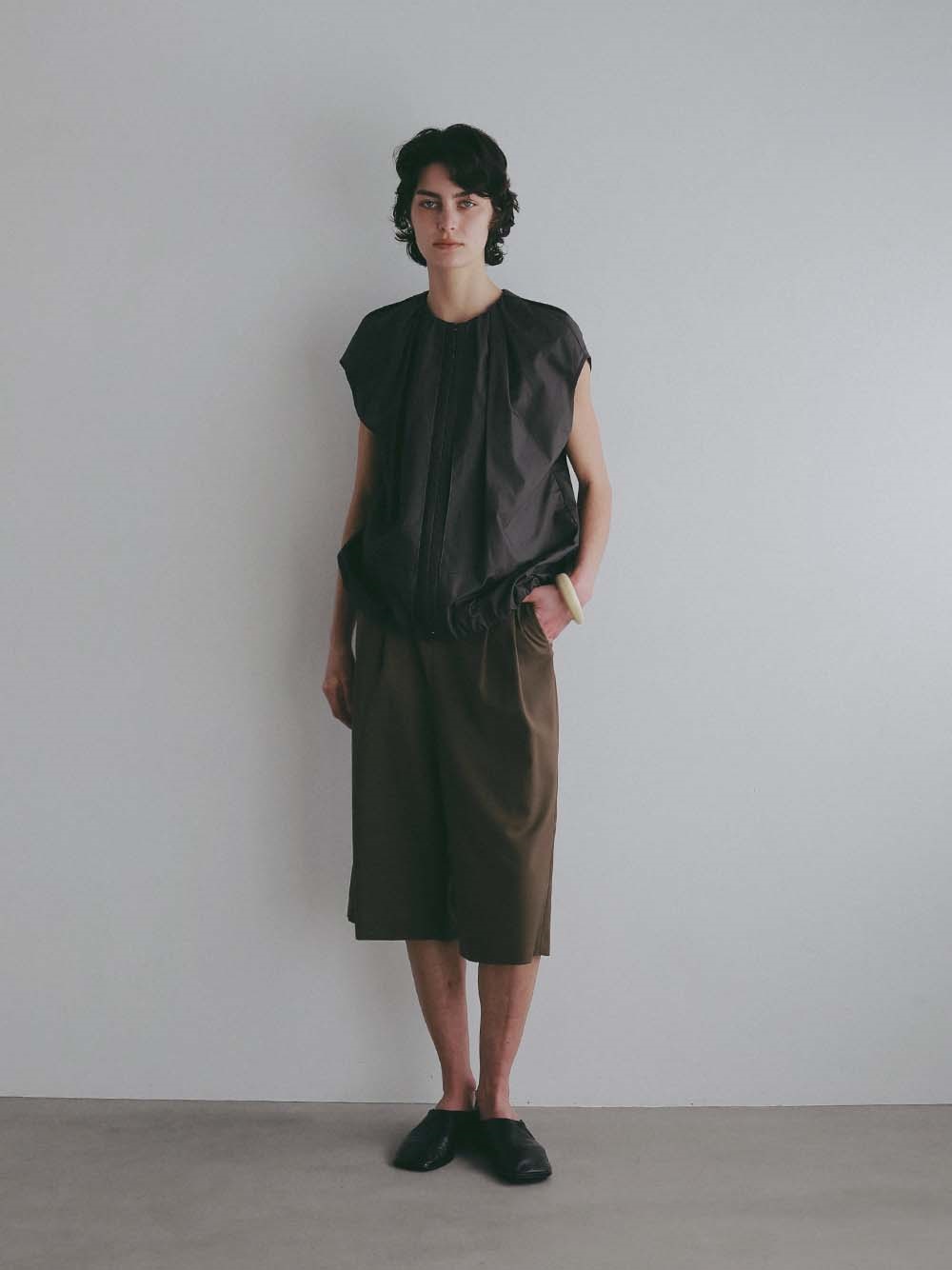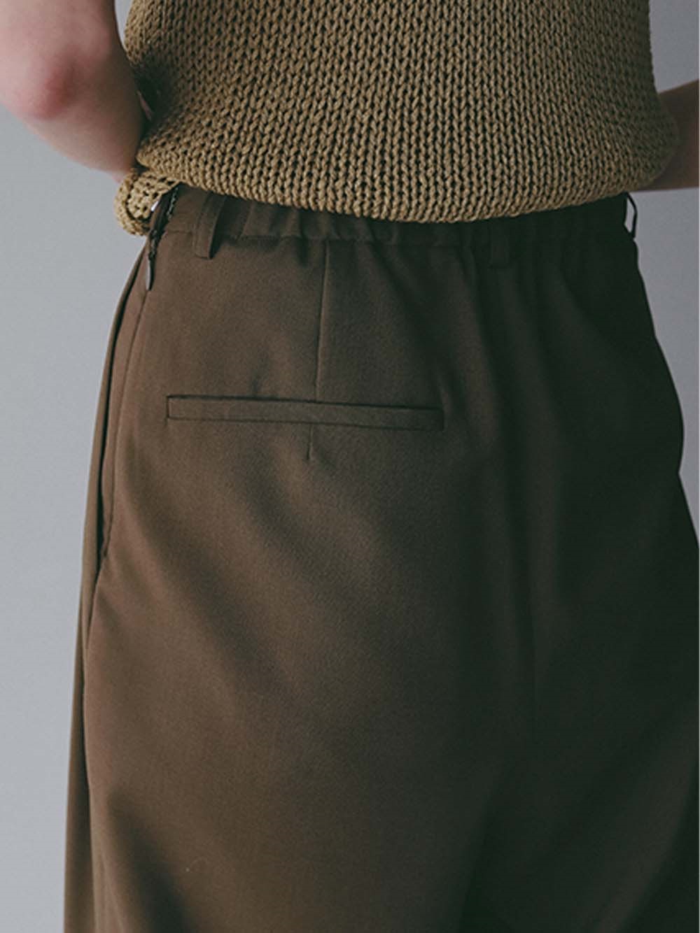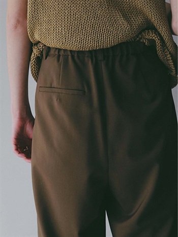 後ろのゴム仕様と、サイドのファスナー開きで着用もシンプルにリラックス。