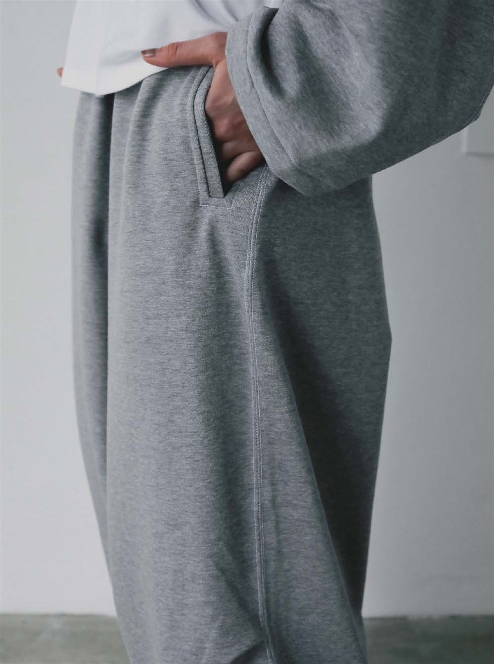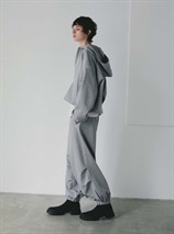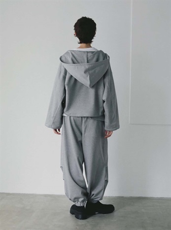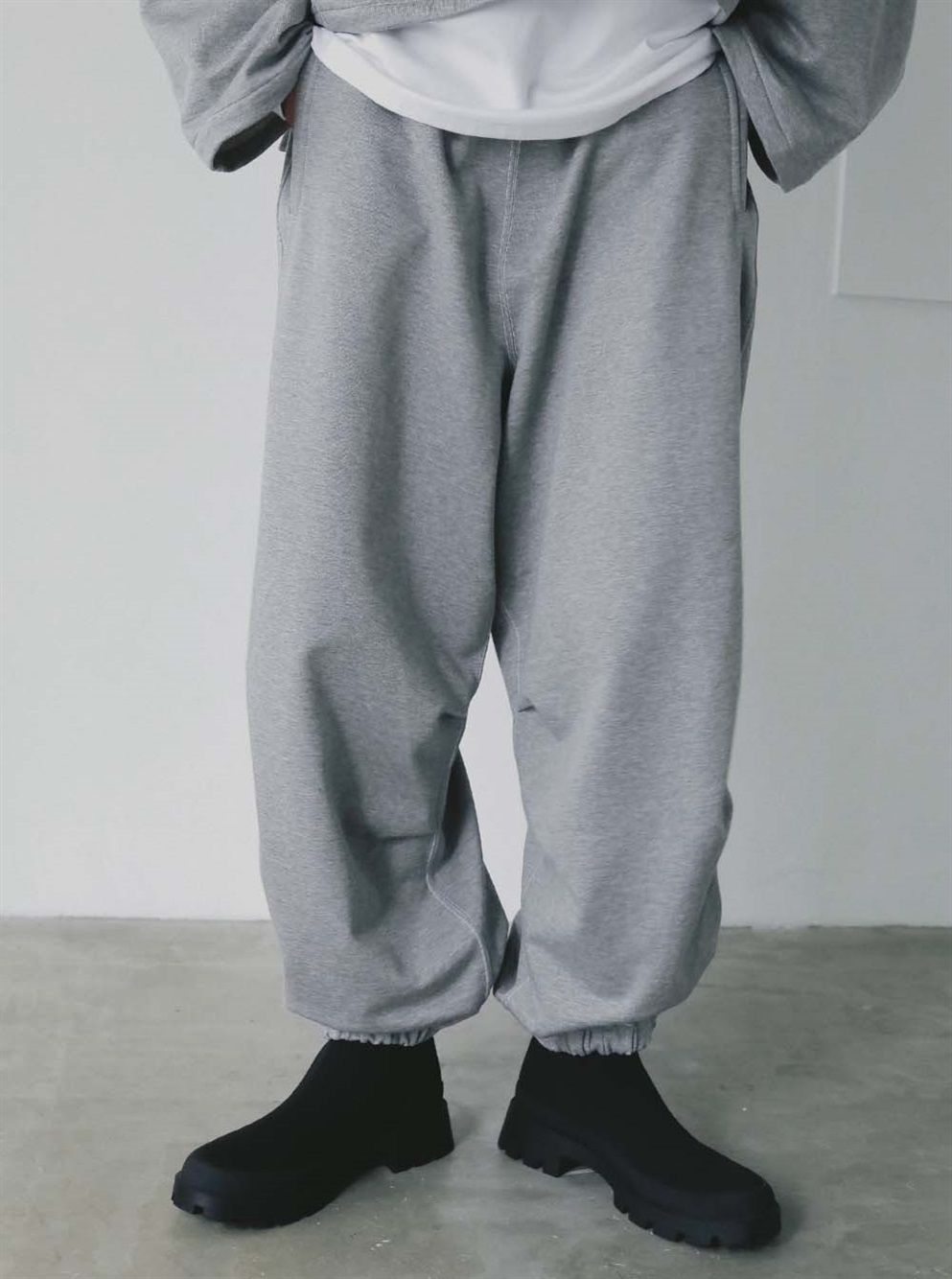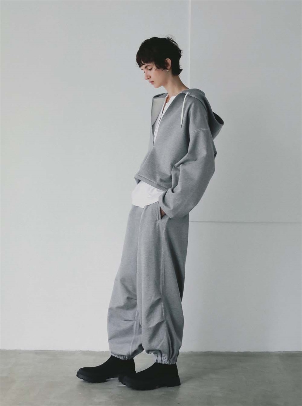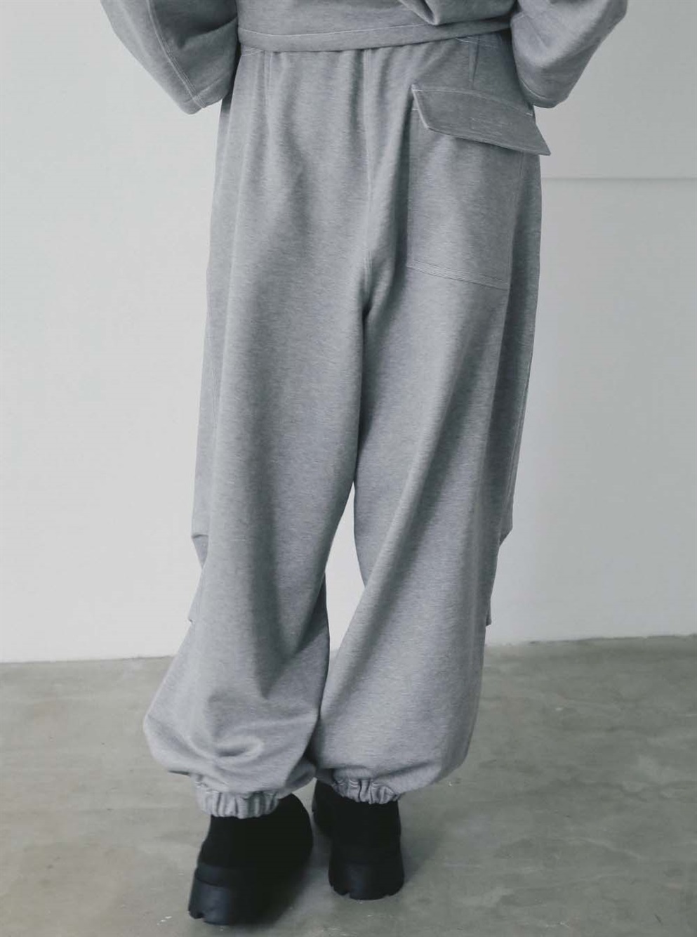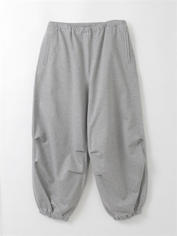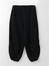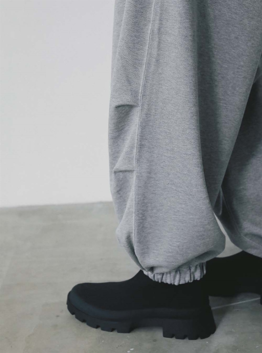 ウエストと裾はゴム仕様でスポーティな作りになっており、膝には深いプリーツを入れたワイドシルエットに仕上げています。