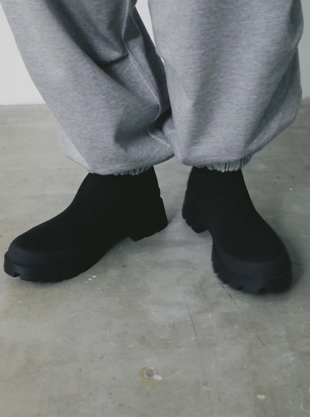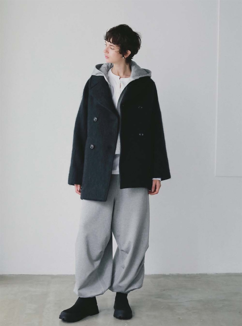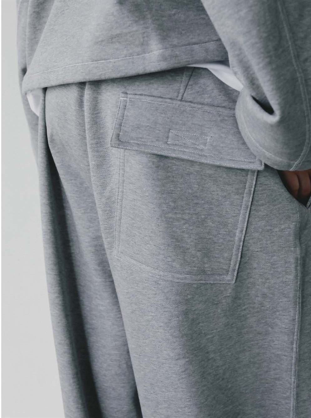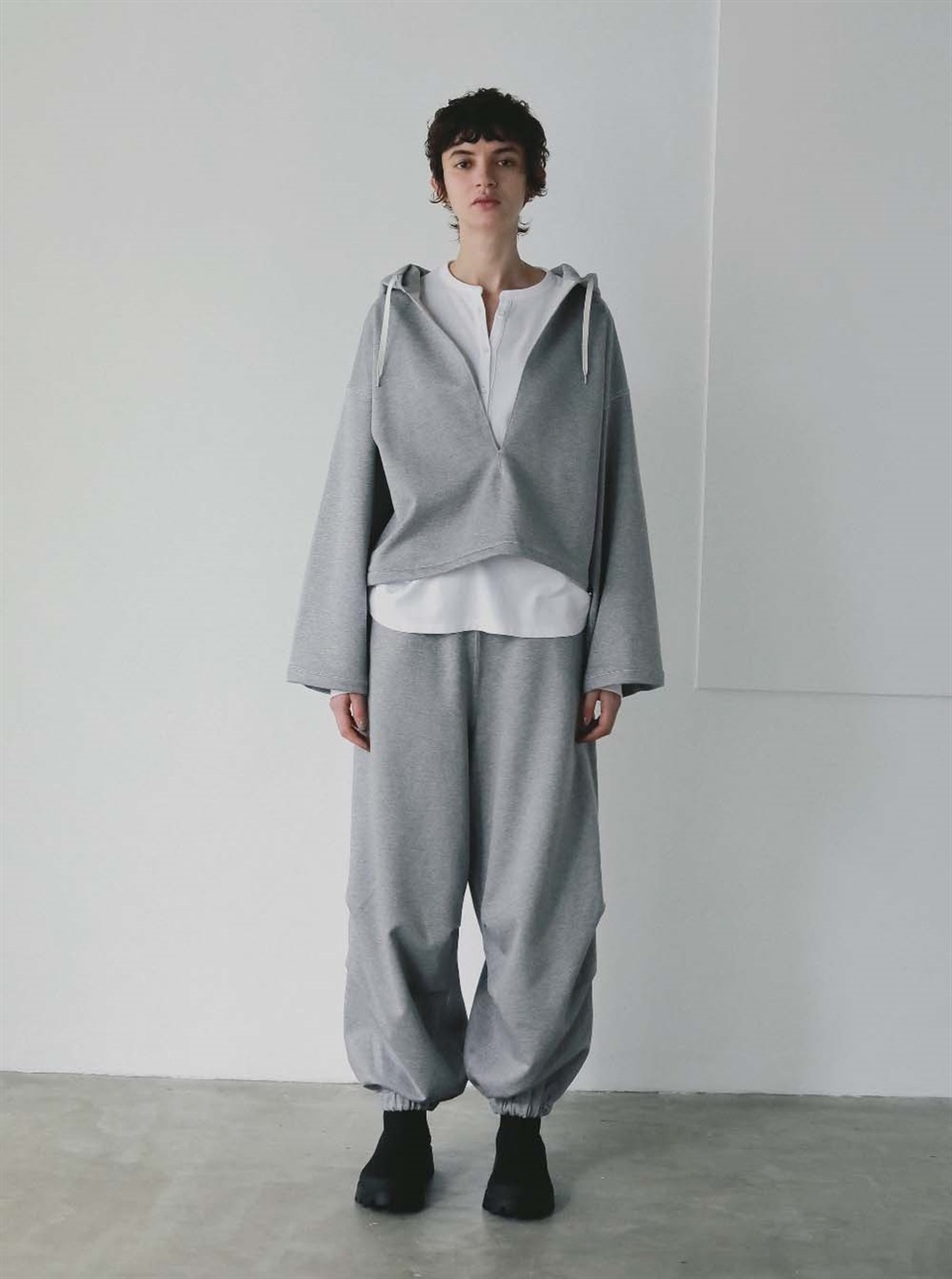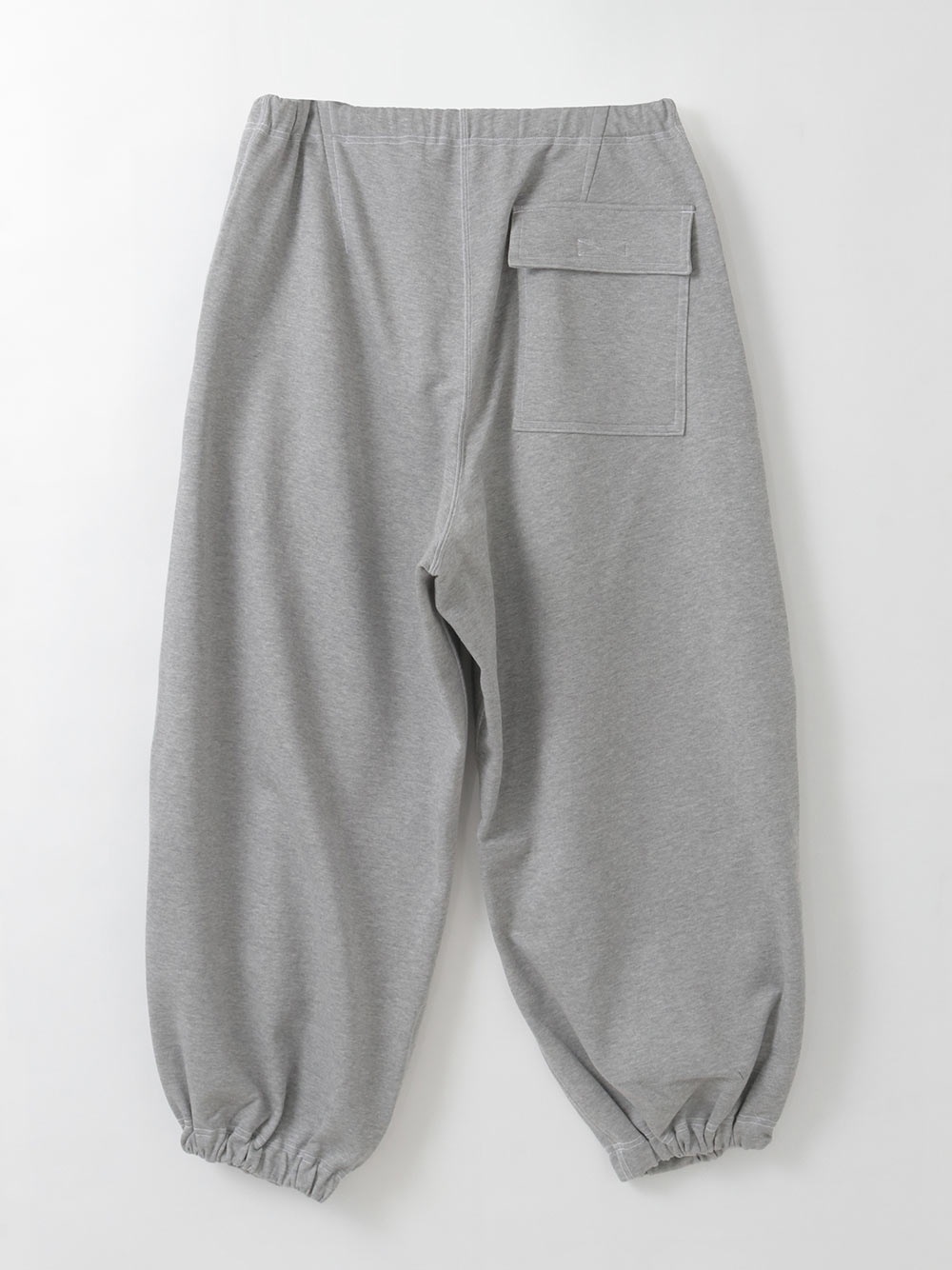 ウエストと裾はゴム仕様でスポーティな作りになっており、膝には深いプリーツを入れたワイドシルエットに仕上げています。