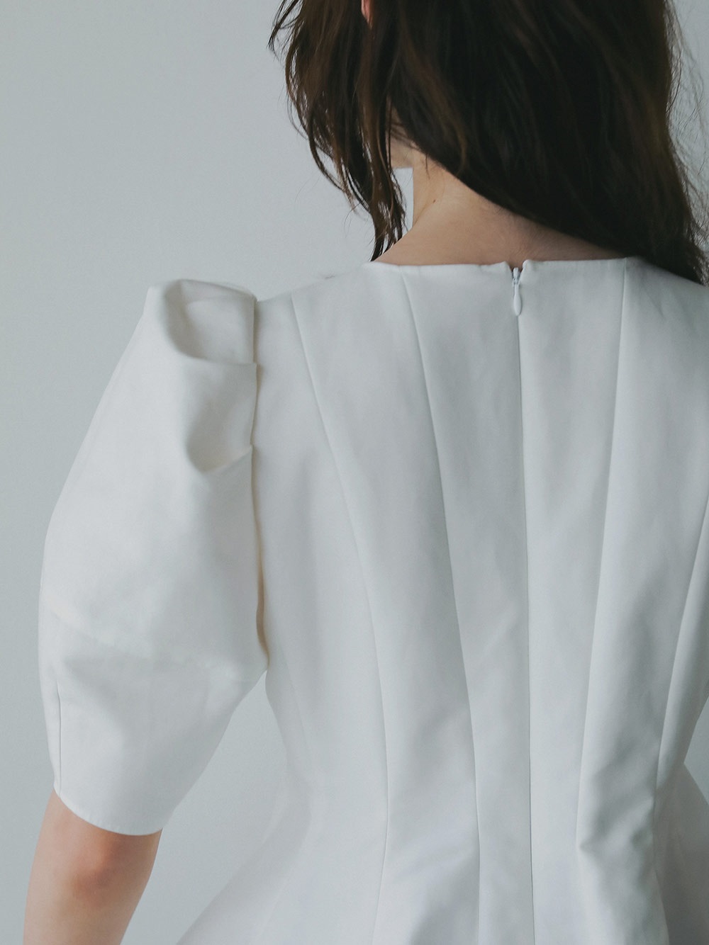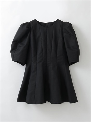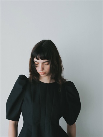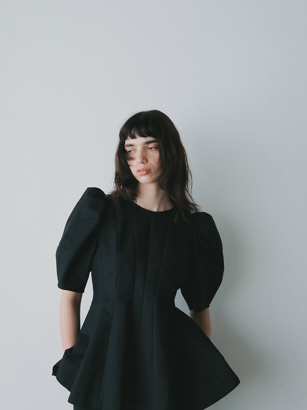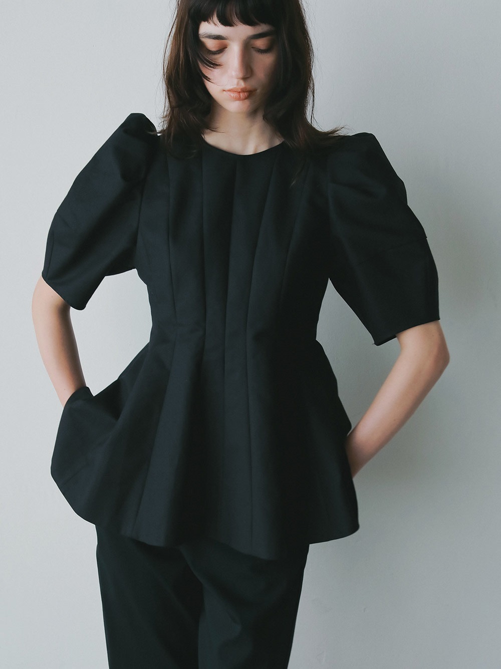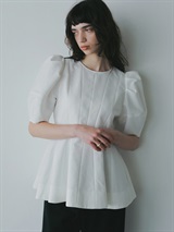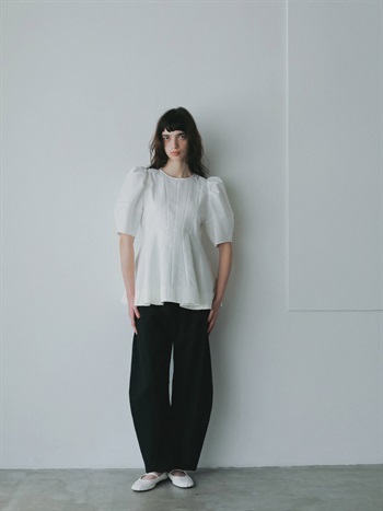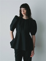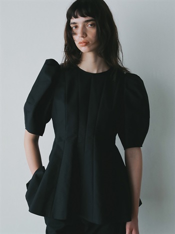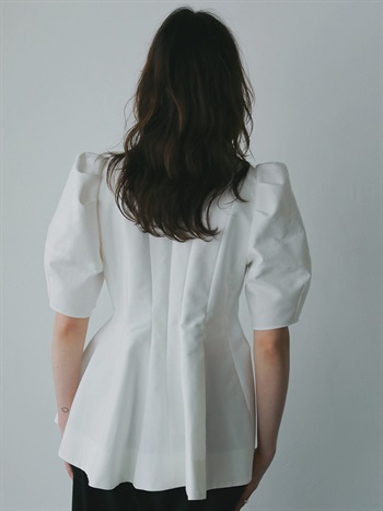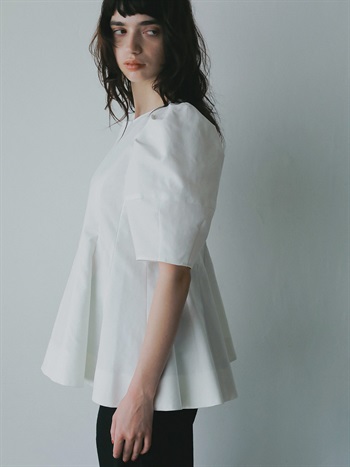 高密度なコットンの二重織を使用したデザインブラウス。素材のハリ感を活かして構築的なペプラムシルエットが出るようにデザイン線を入れました。ランタンスリーブのフォルムもしっかりと出たデザインコンシャスな1枚。