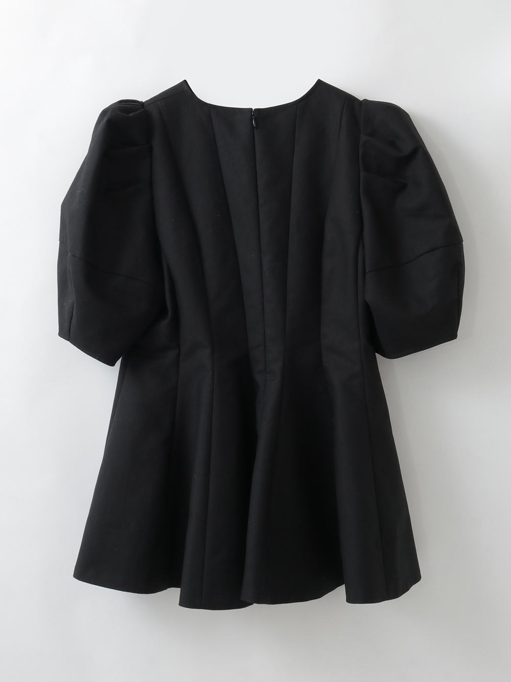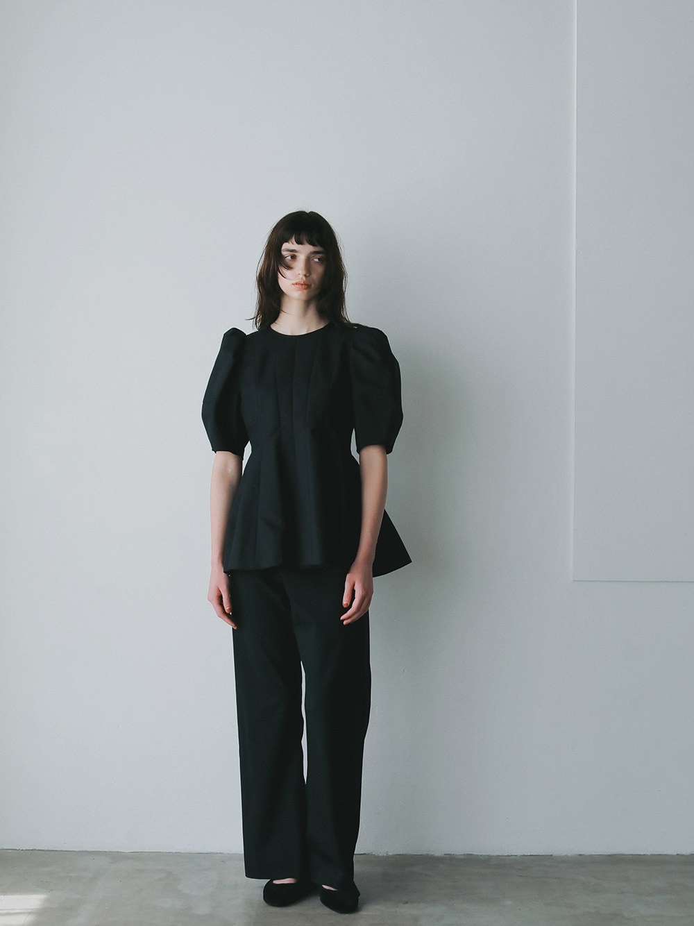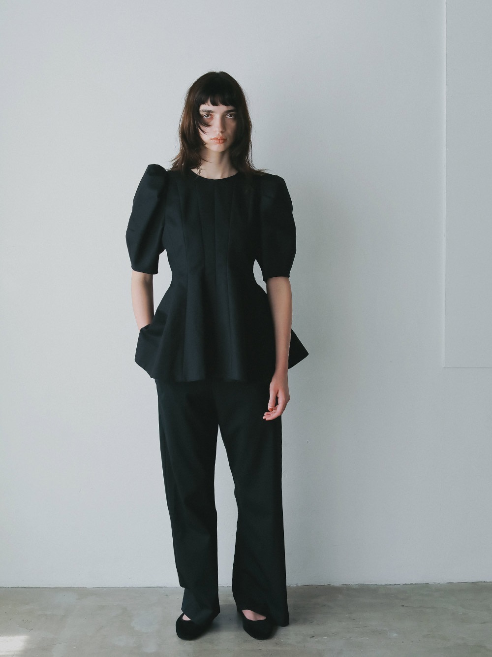 高密度なコットンの二重織を使用したデザインブラウス。素材のハリ感を活かして構築的なペプラムシルエットが出るようにデザイン線を入れました。ランタンスリーブのフォルムもしっかりと出たデザインコンシャスな1枚。