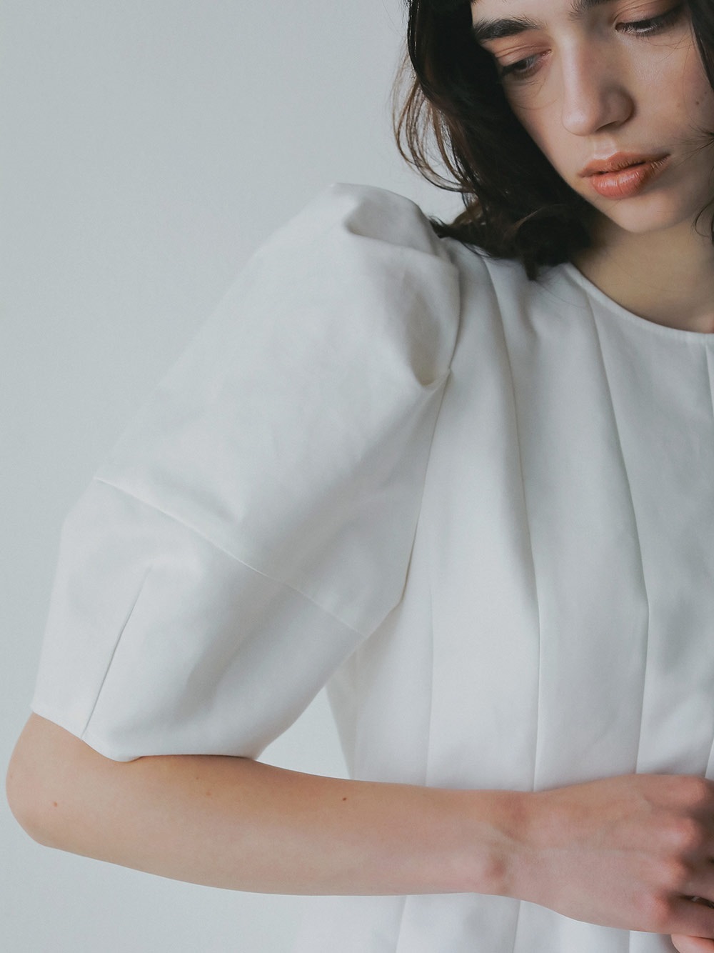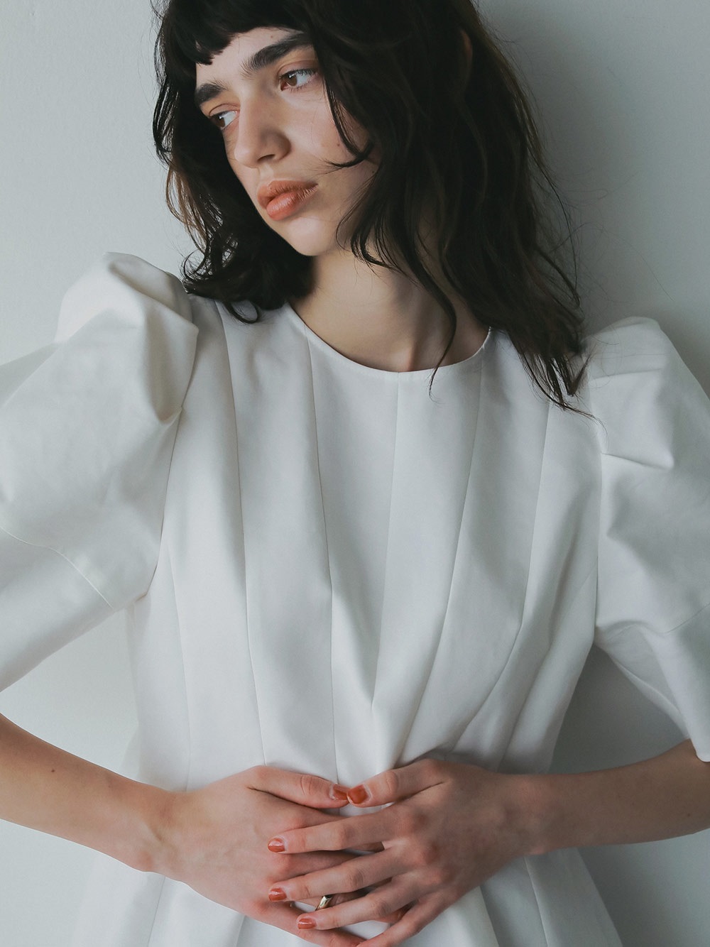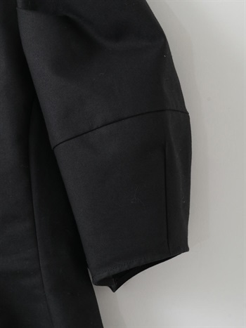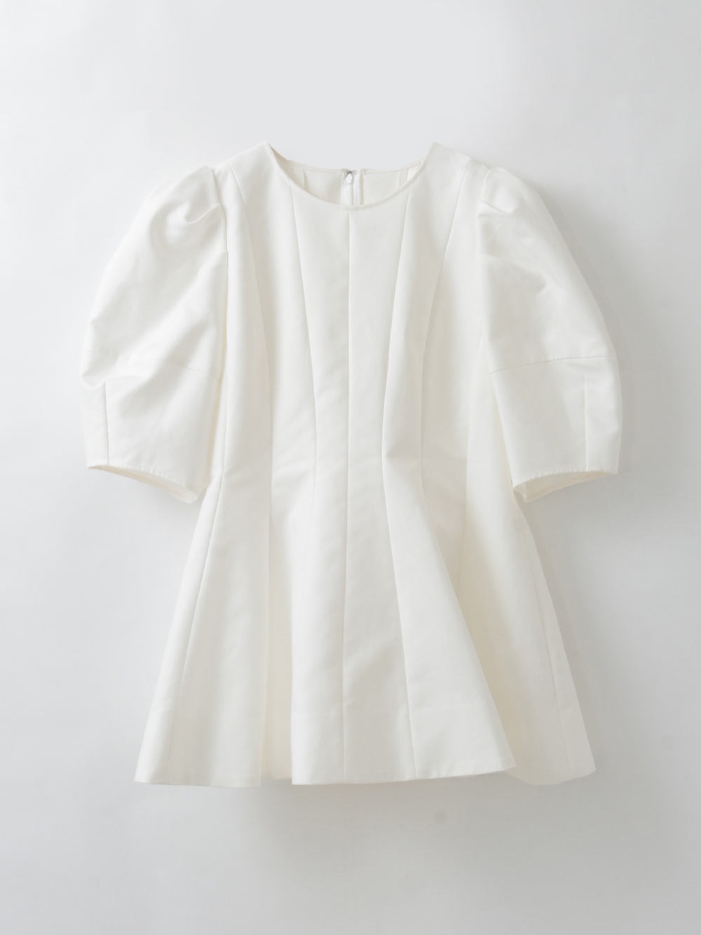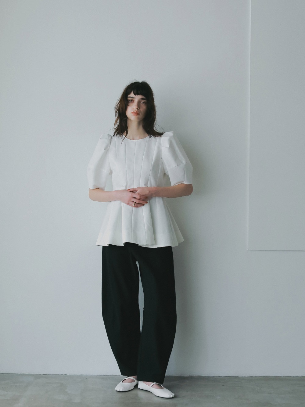 高密度なコットンの二重織を使用したデザインブラウス。素材のハリ感を活かして構築的なペプラムシルエットが出るようにデザイン線を入れました。ランタンスリーブのフォルムもしっかりと出たデザインコンシャスな1枚。