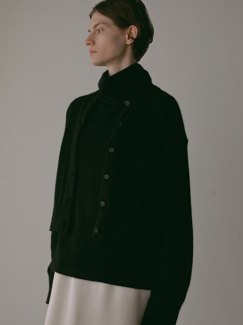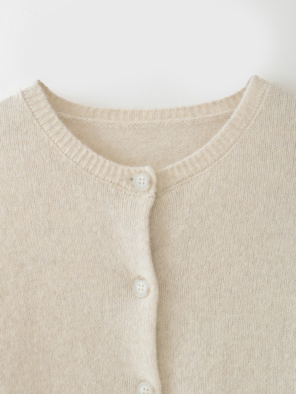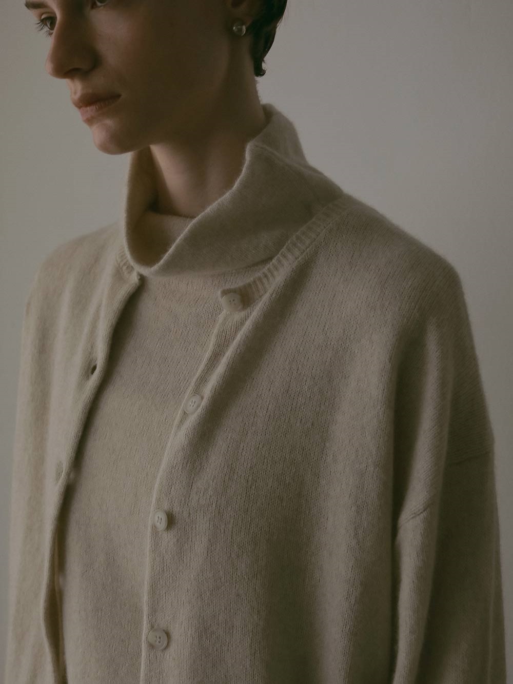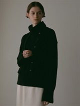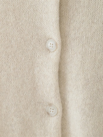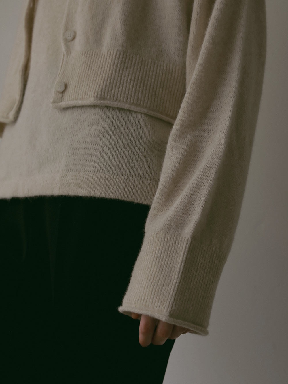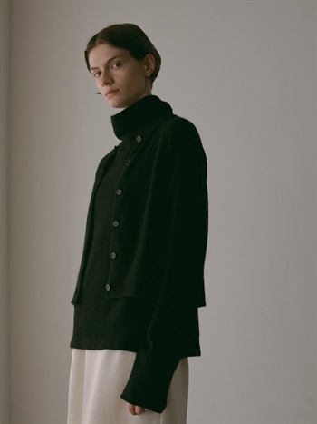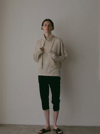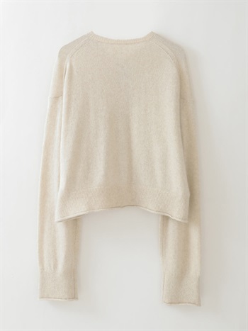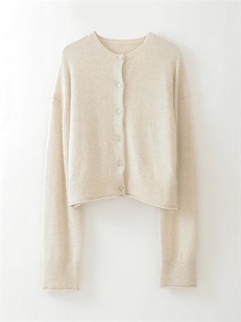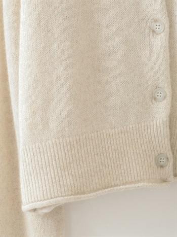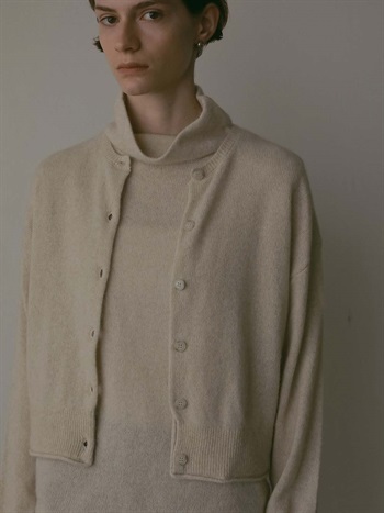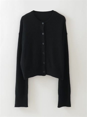 適度に起毛した編地が特徴的なFOXブレンドのニットカーディガン。ボディはクロップト丈で袖をやや太めにしてポイントにしました。プルオーバーのようにボタンを留めて着ても1枚でサマになるデザインに仕上げました。