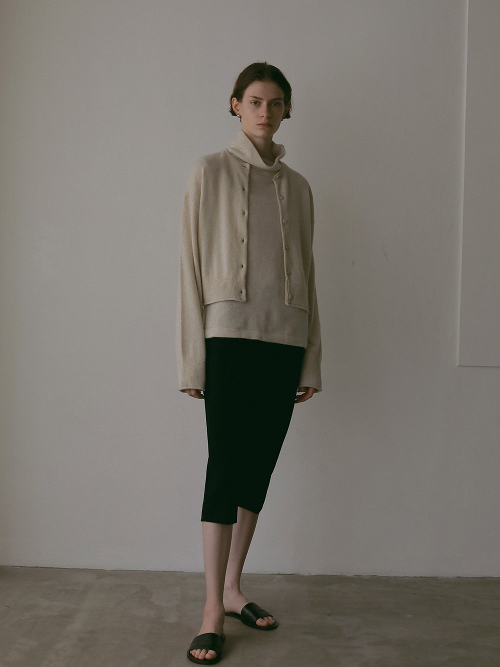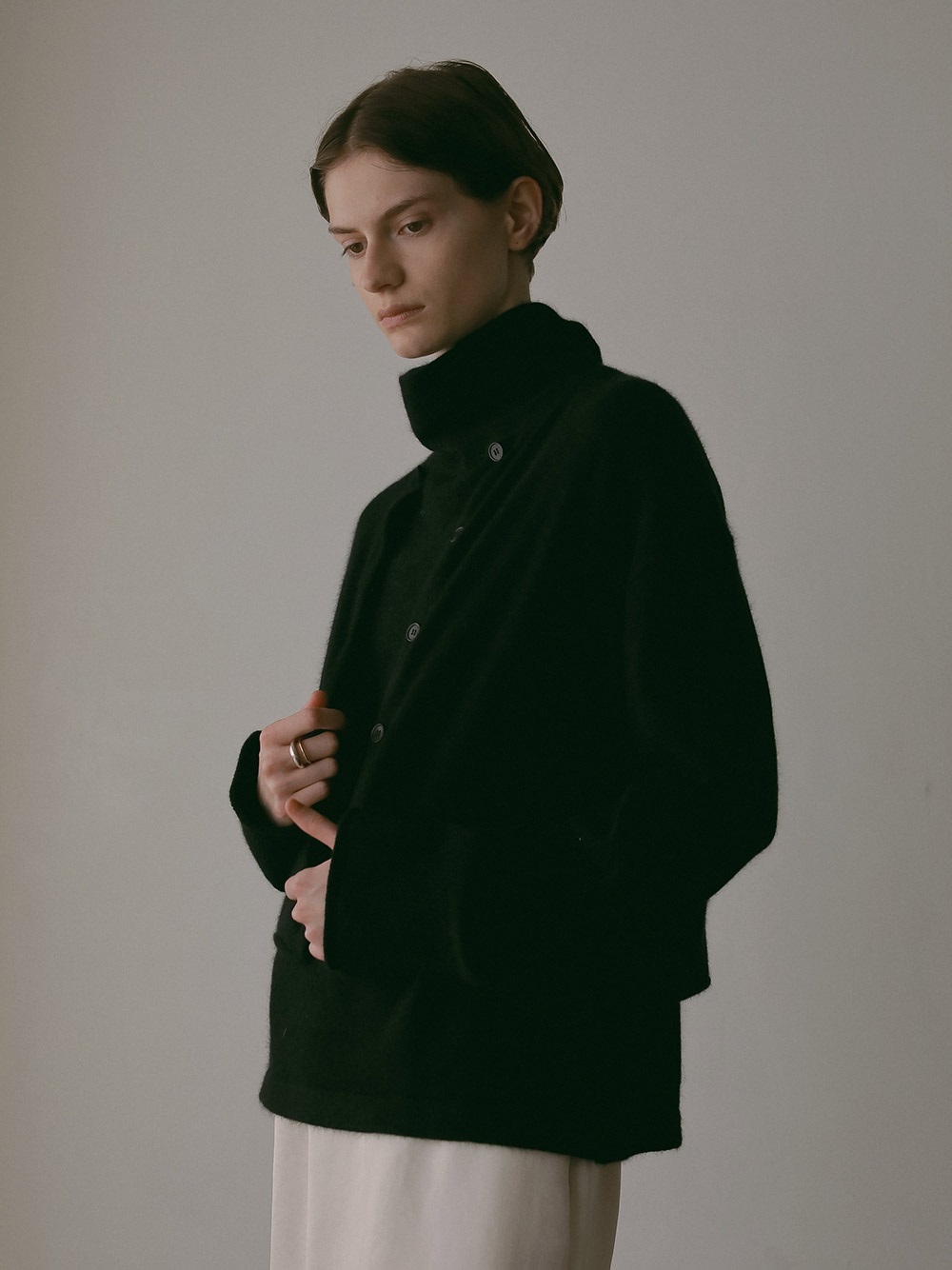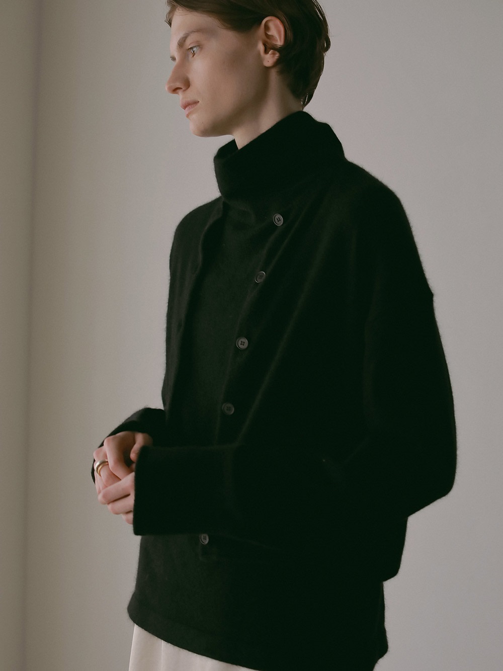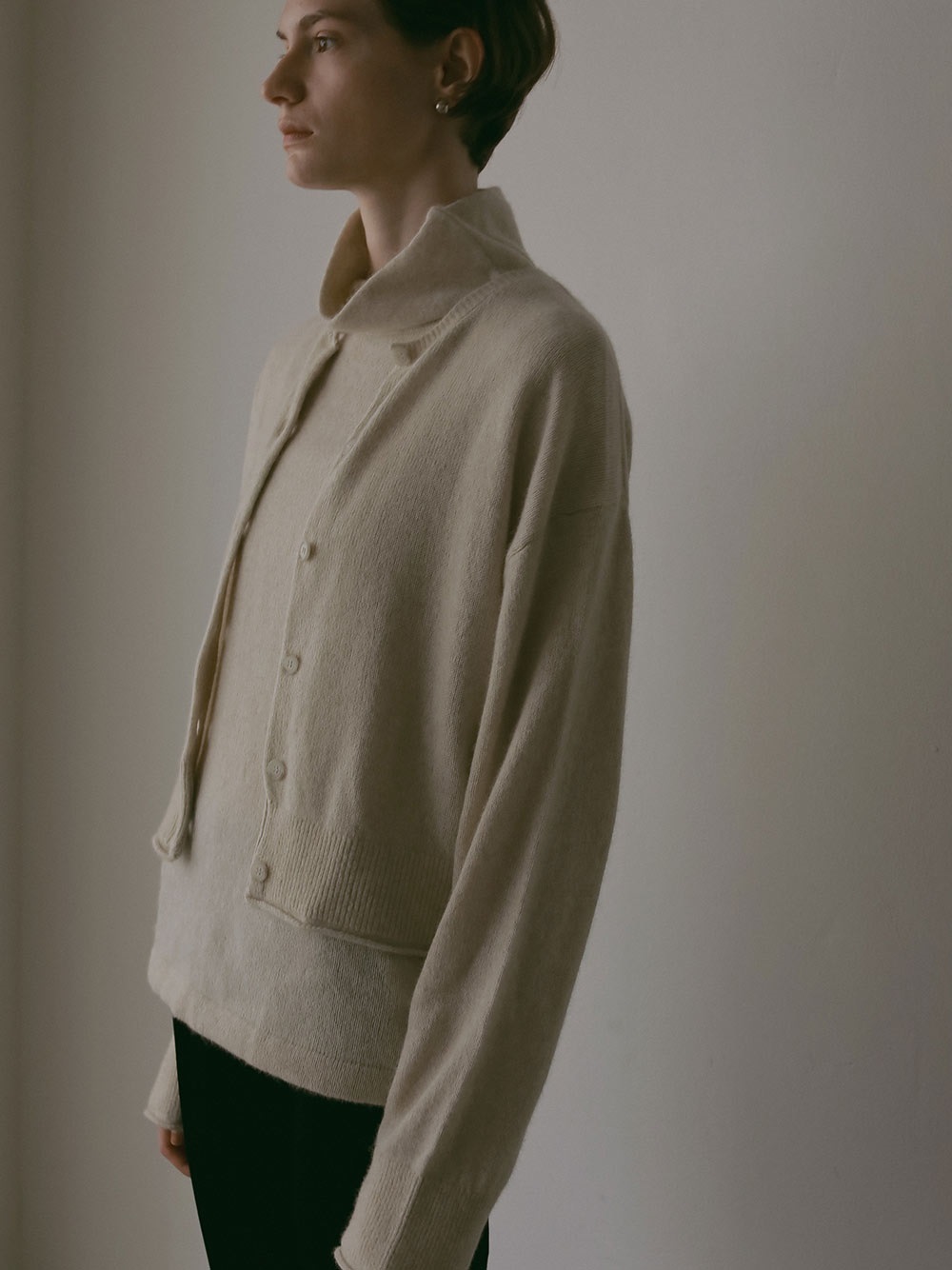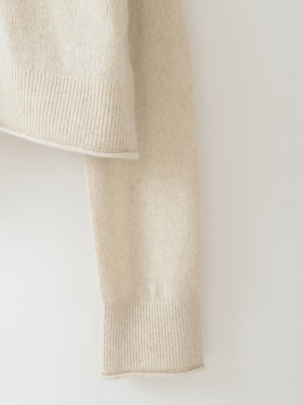 適度に起毛した編地が特徴的なFOXブレンドのニットカーディガン。ボディはクロップト丈で袖をやや太めにしてポイントにしました。プルオーバーのようにボタンを留めて着ても1枚でサマになるデザインに仕上げました。