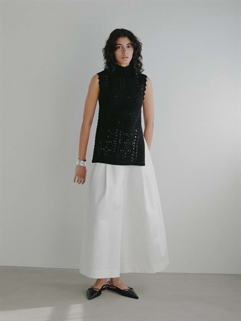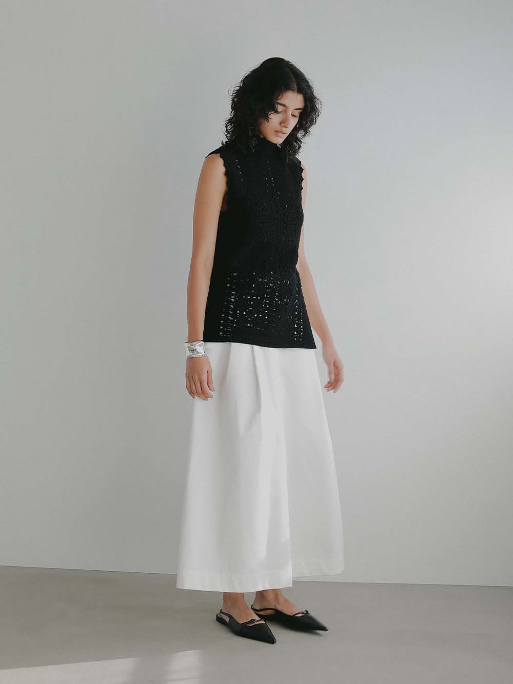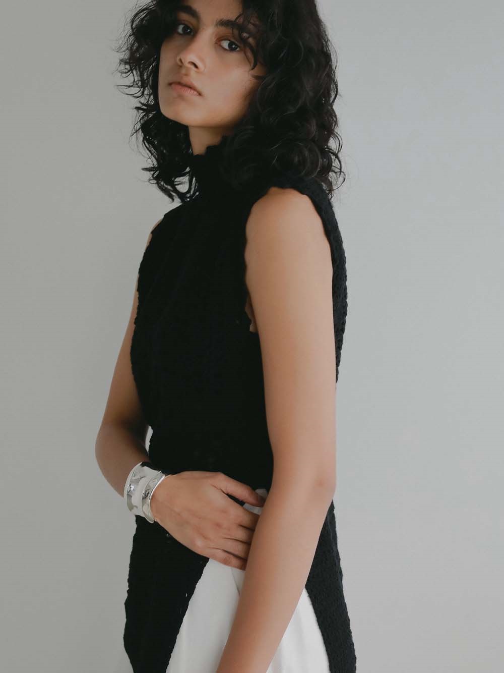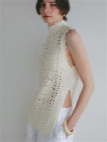 甘くなりがちな手編みニットですが 縦長なシルエットでスッキリ見えサイドスリットで抜け感を演出。