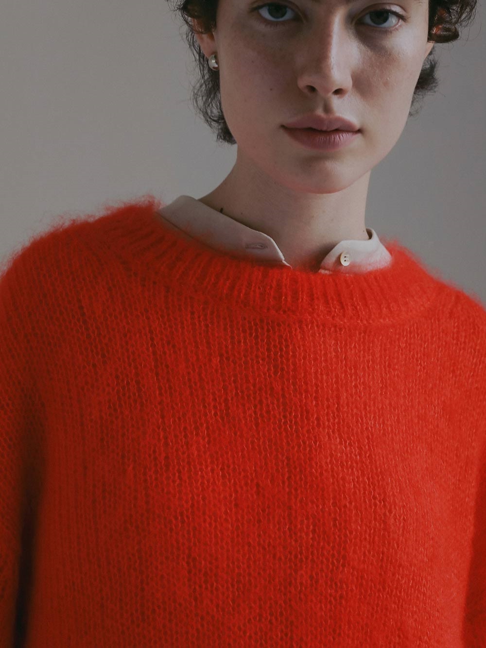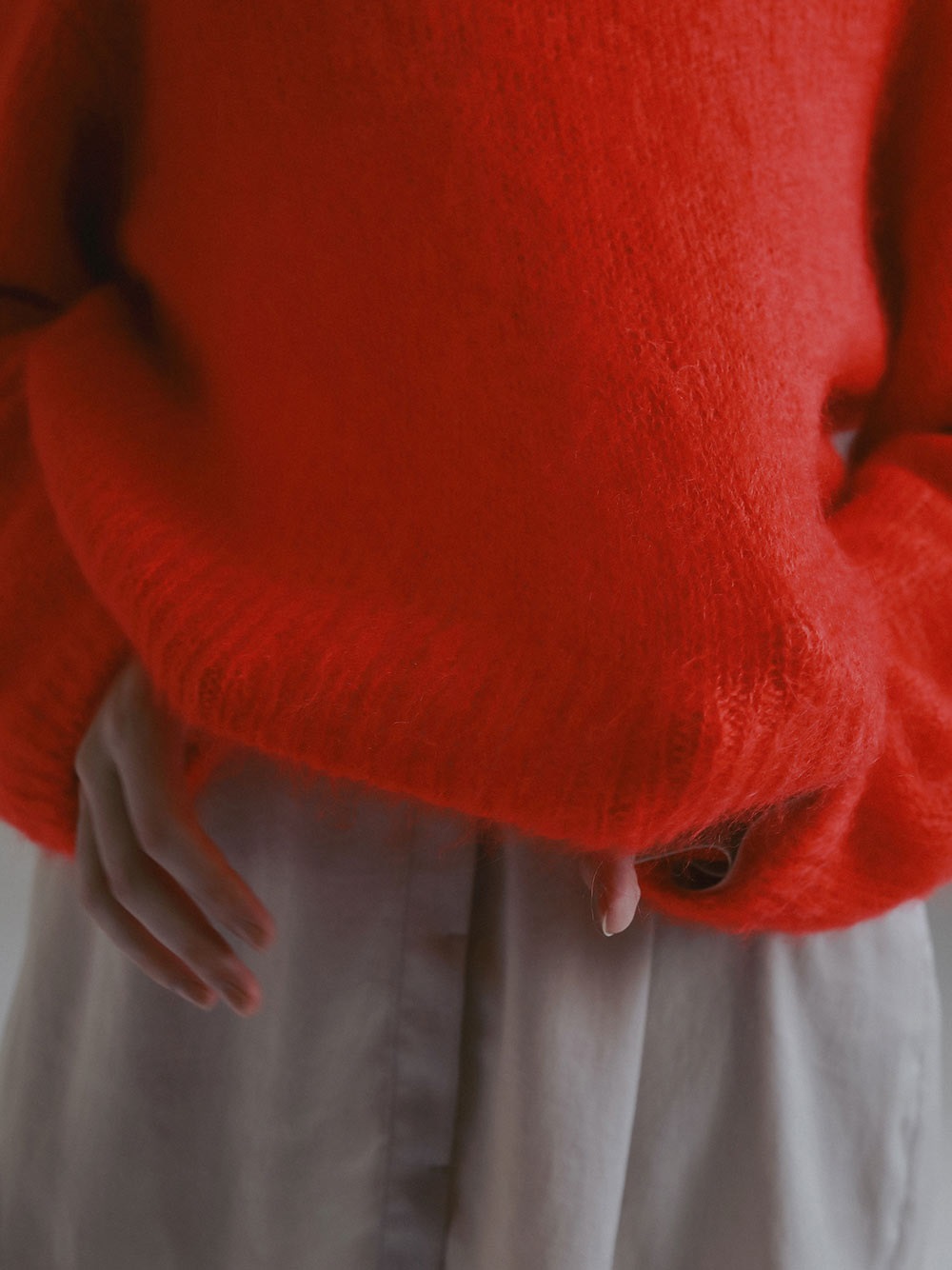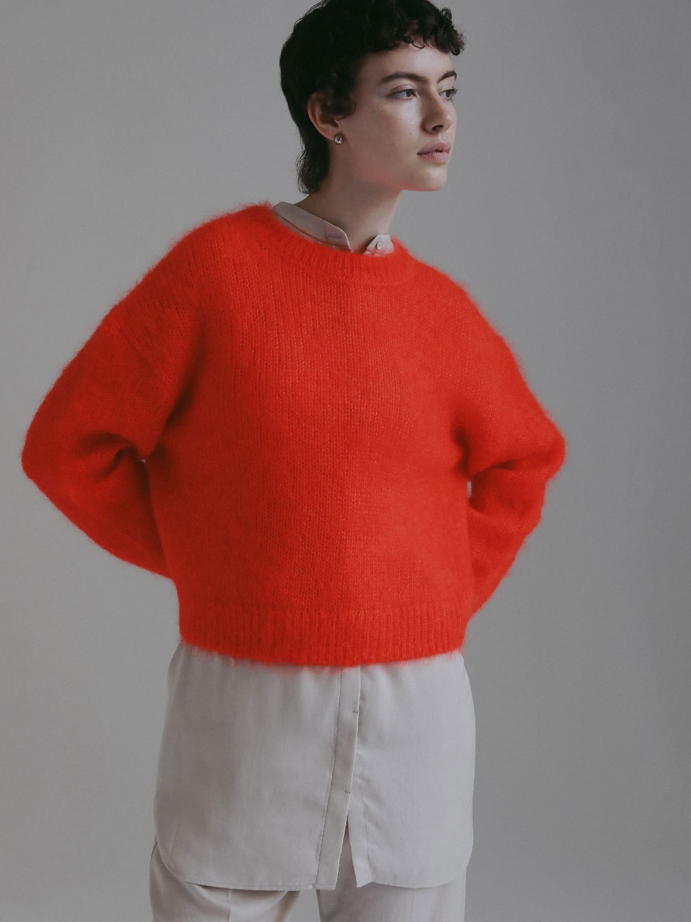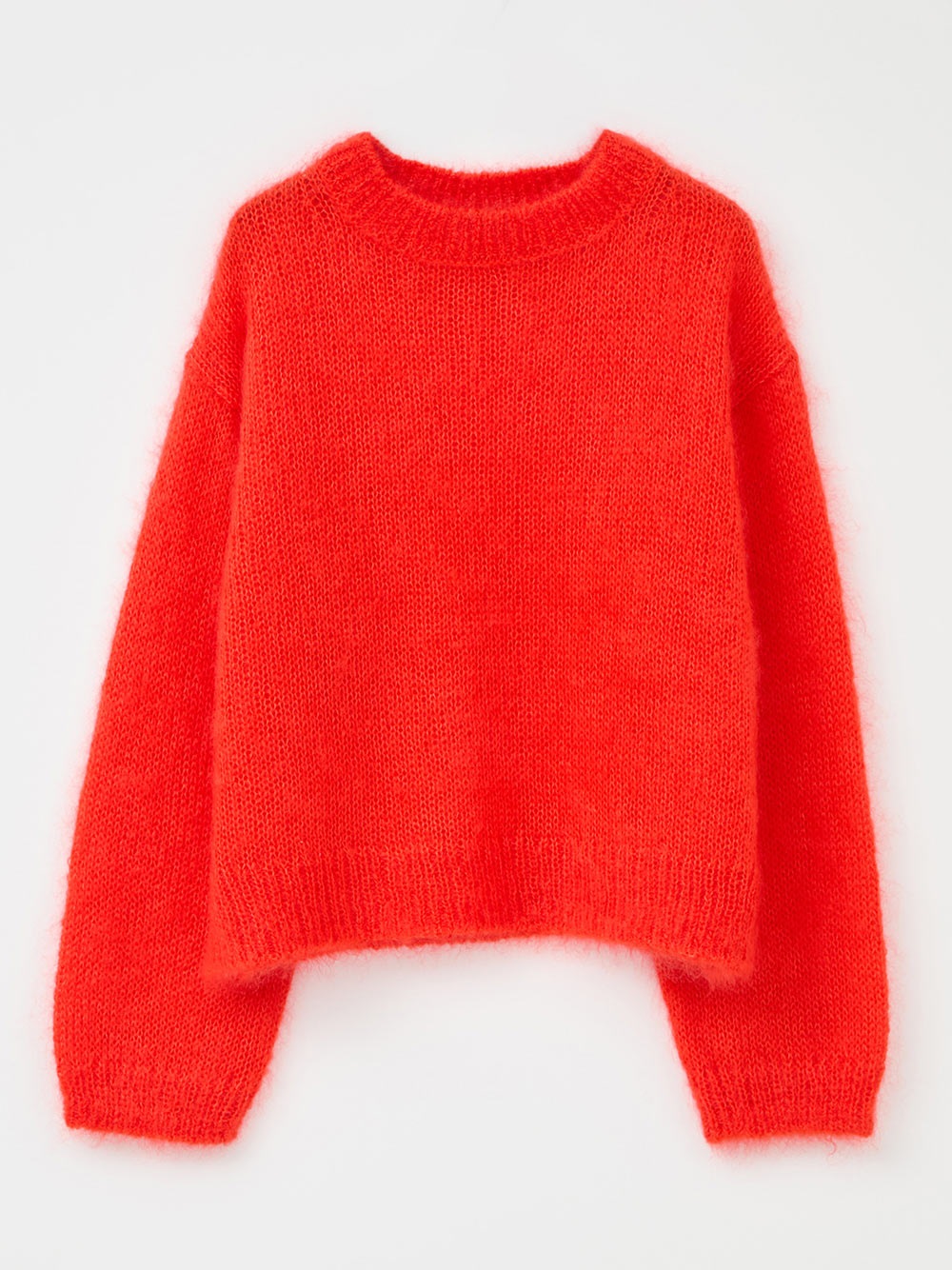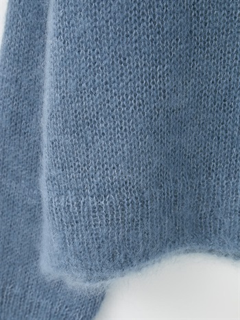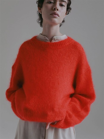 キッドモヘアとシルクが織り成す信じられないほどの柔らかさと、繊維の自然な風合いが最も愛らしい側面をエレガントに表現したものです。あえてリブにしまりを持たせずエフォートレスなムードに仕上げたニットプルオーバー。