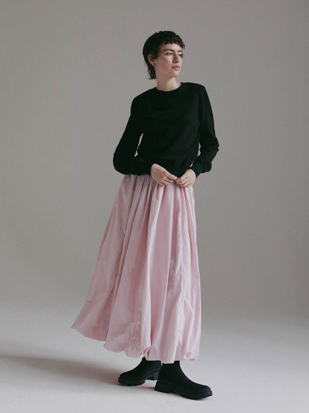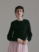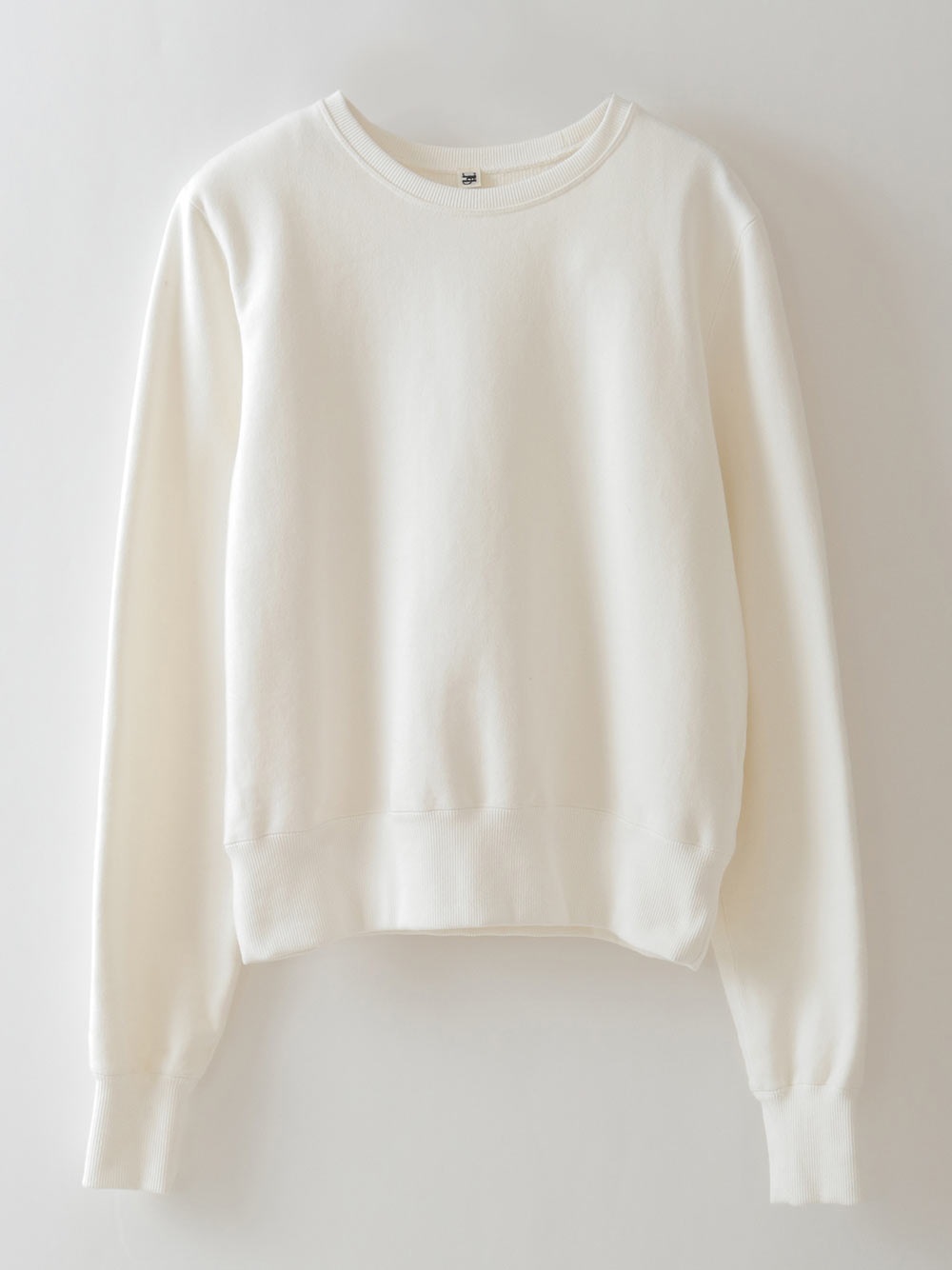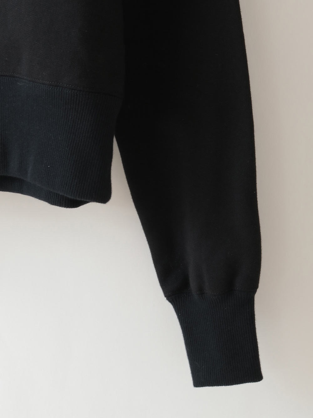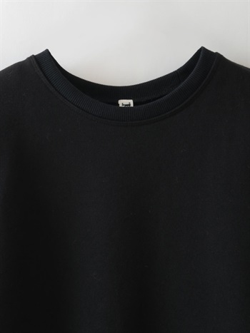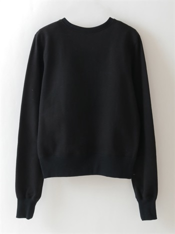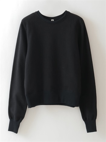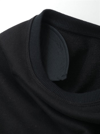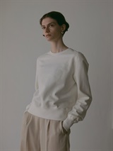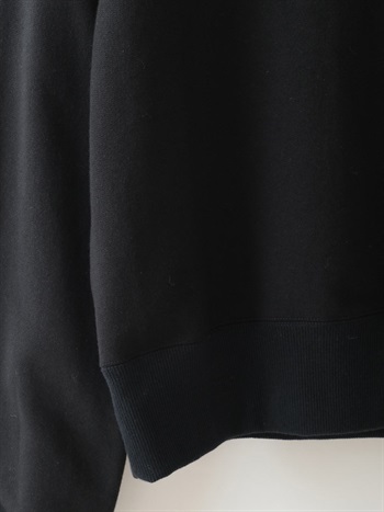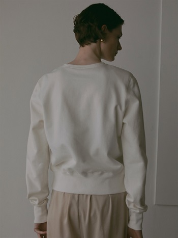 中肉のドライタッチな裏毛を使用したスウェット。コンパクトなサイズ感で品良く着られるデザインにしました。カジュアルな印象になりがちなスウェットですが、取り外し可能な肩パッドを入れてモードな印象に仕上げました。