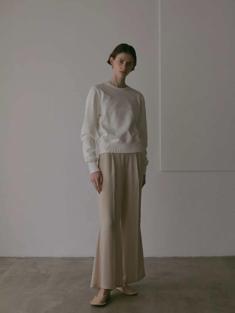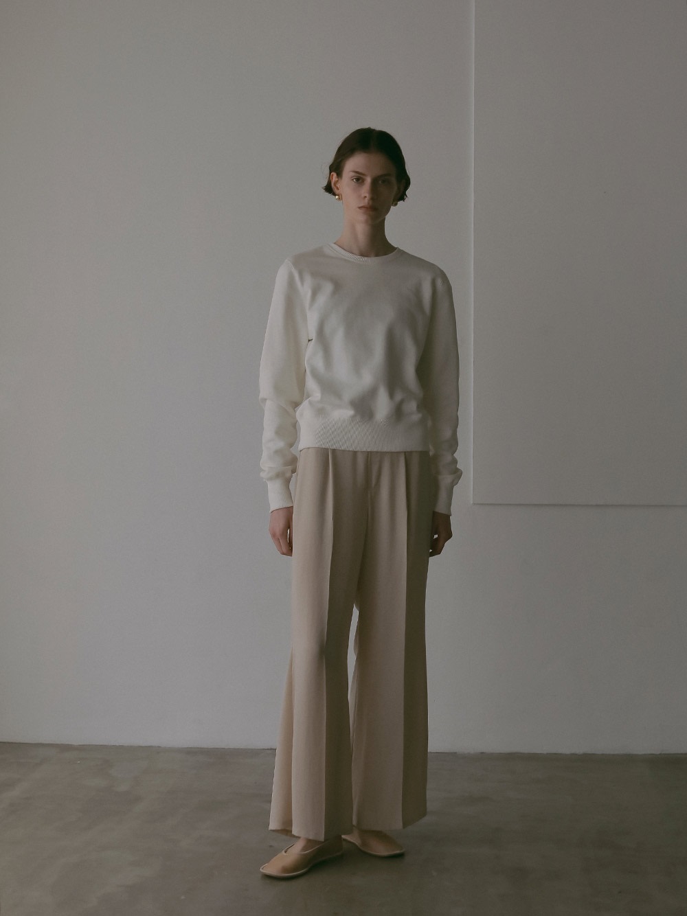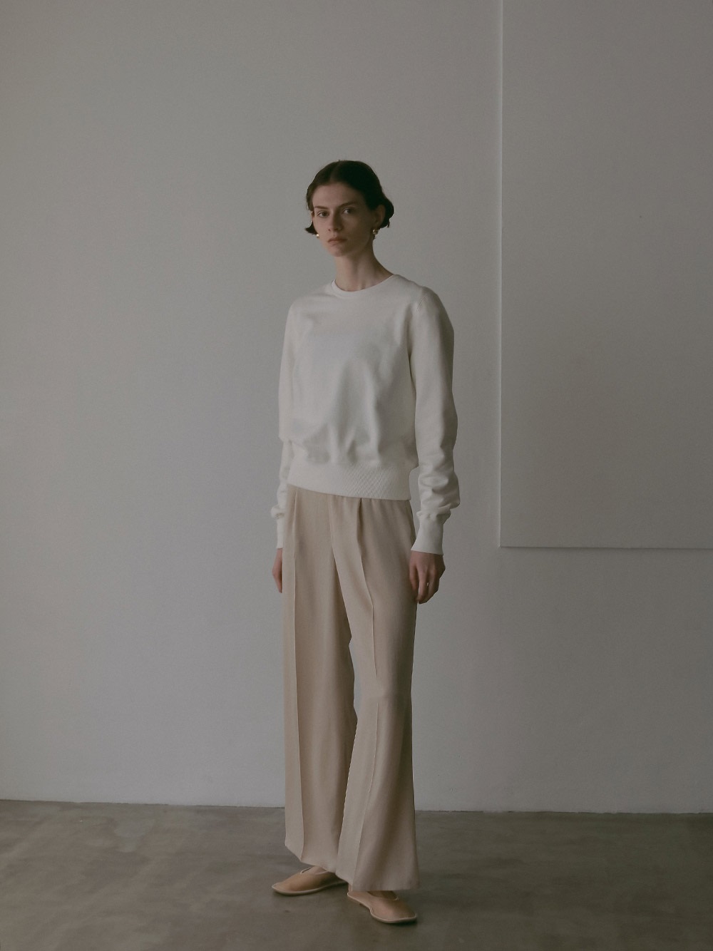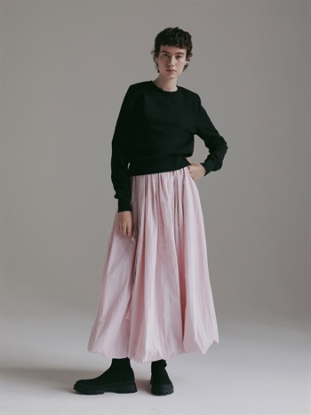 中肉のドライタッチな裏毛を使用したスウェット。コンパクトなサイズ感で品良く着られるデザインにしました。カジュアルな印象になりがちなスウェットですが、取り外し可能な肩パッドを入れてモードな印象に仕上げました。