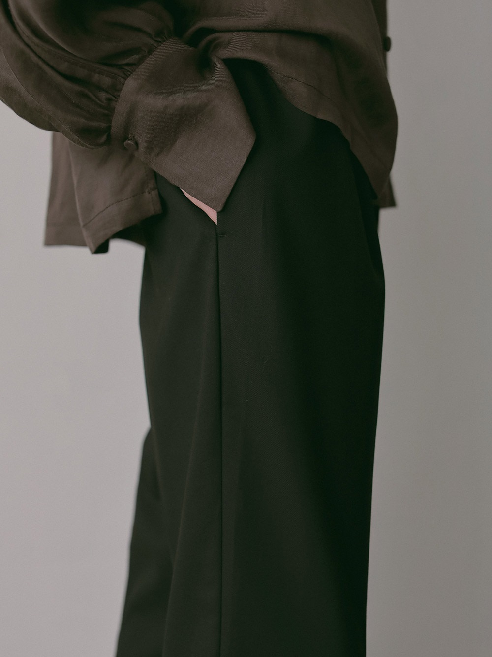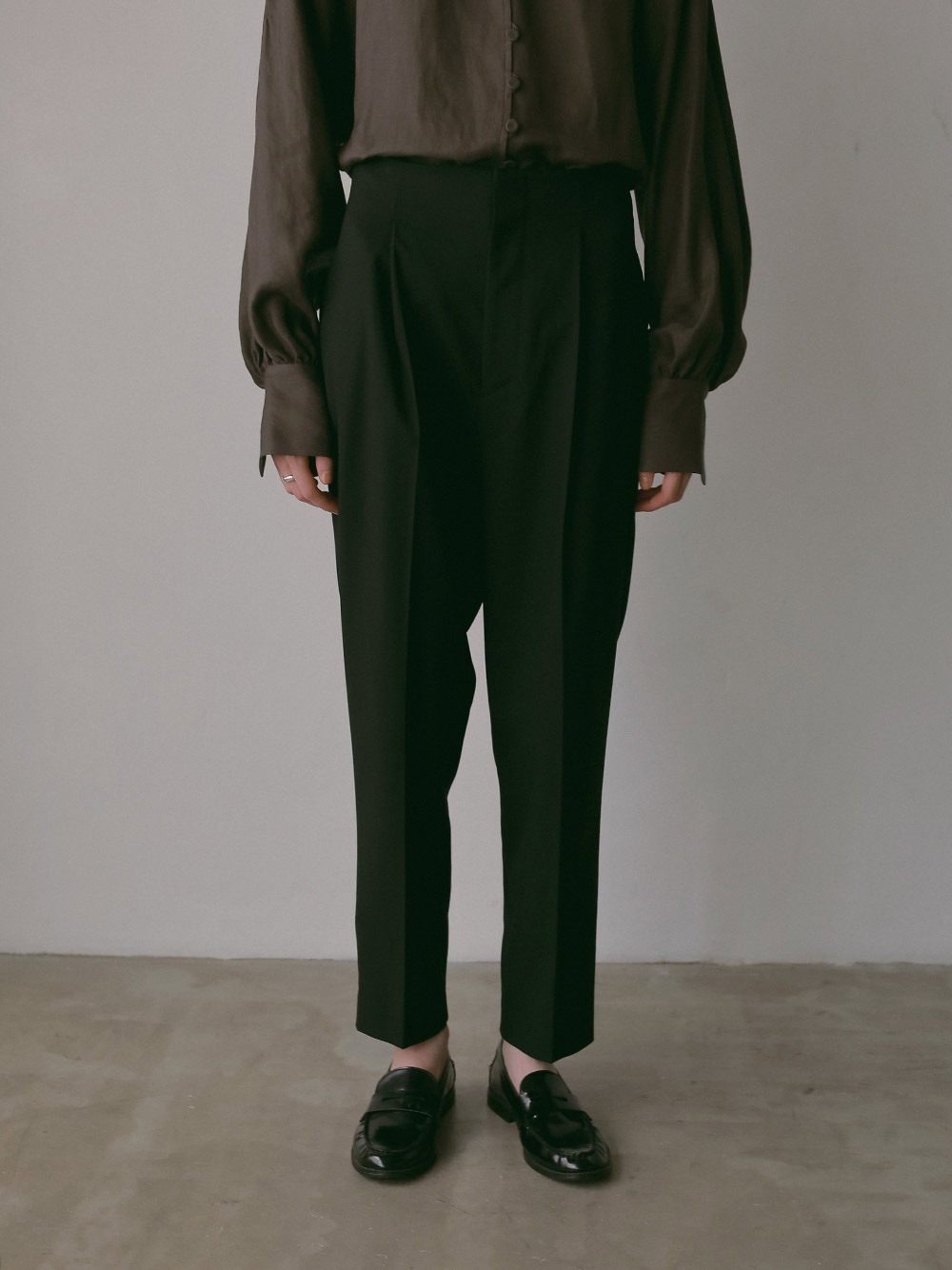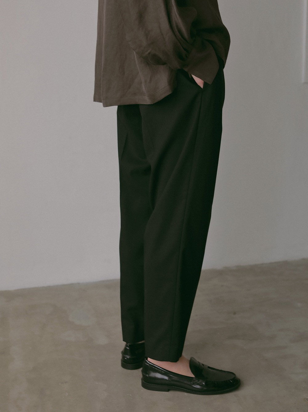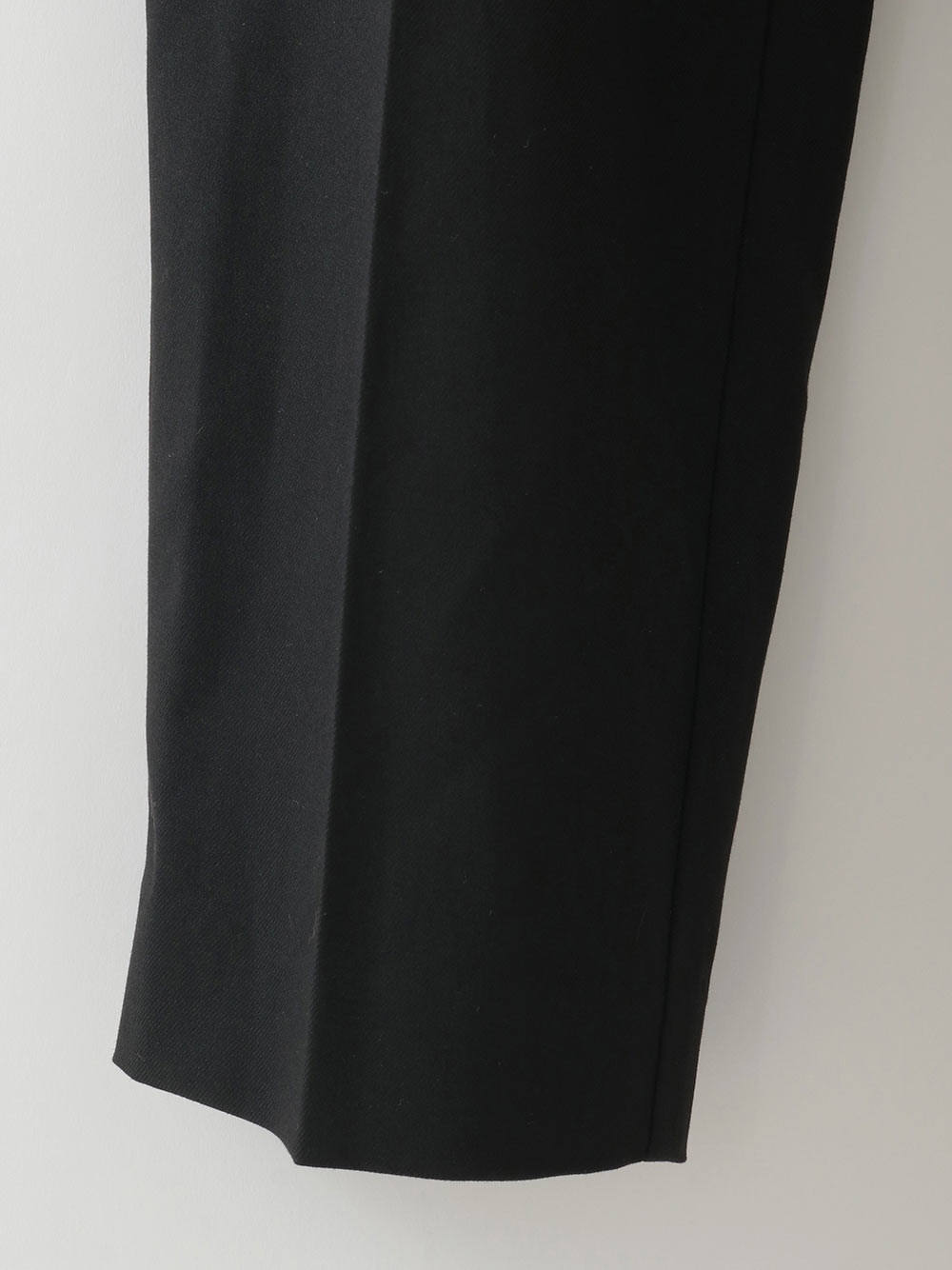 裾にかけてストンと落ちるようなテーパードシルエットのパンツ。ややハイウエストですっきりと仕上げています。ボリュームのあるトップスに合わせていただくとバランスが良くスタイリングをまとめてくれるアイテム。しなやかでやわらかな素材を使用しておりシーズンレスでお使いいただける1枚です。