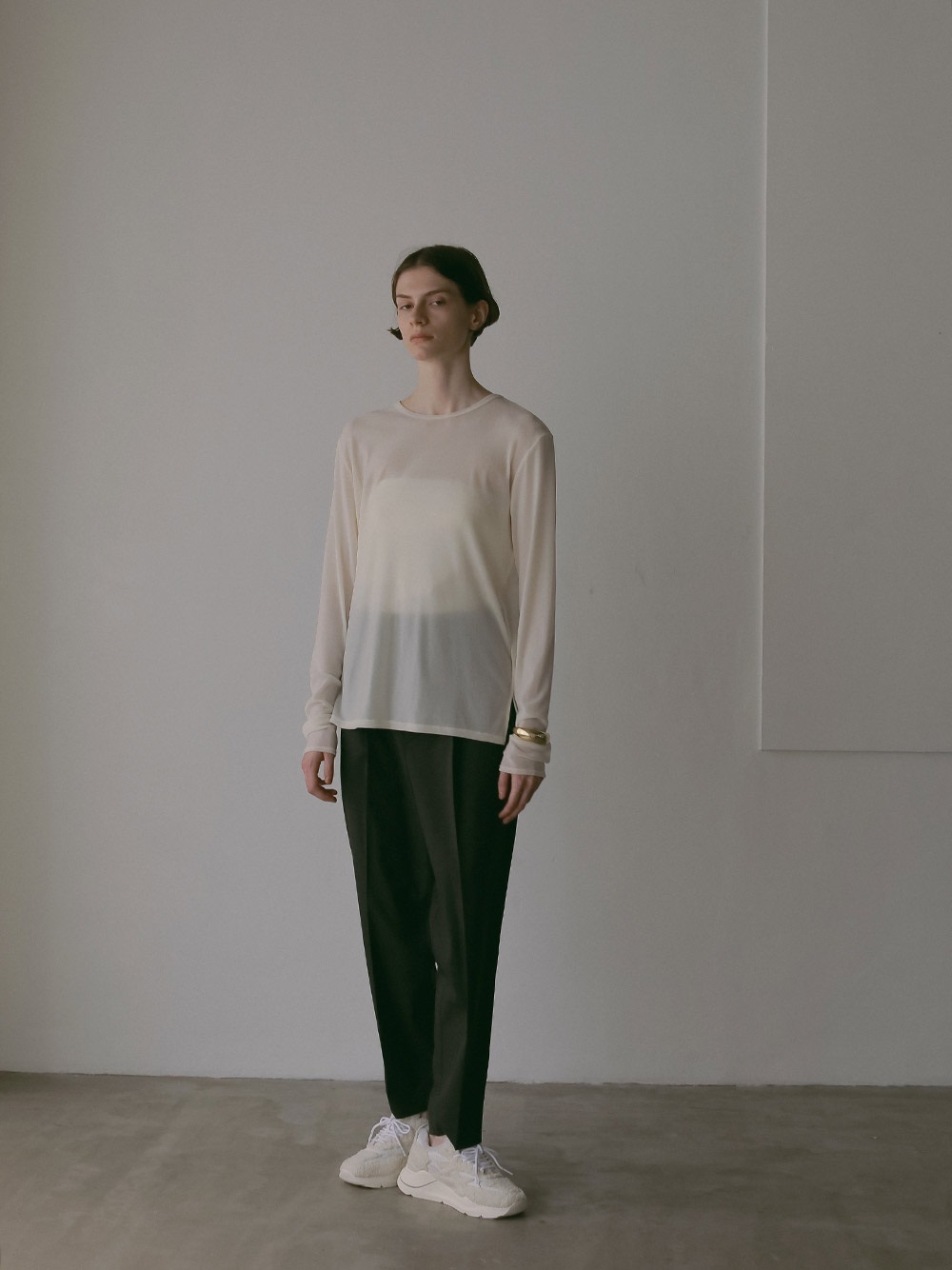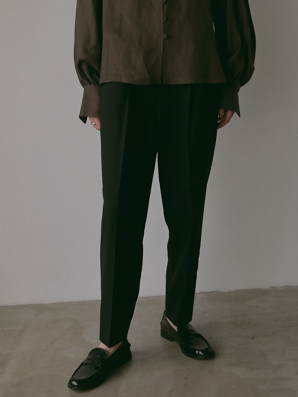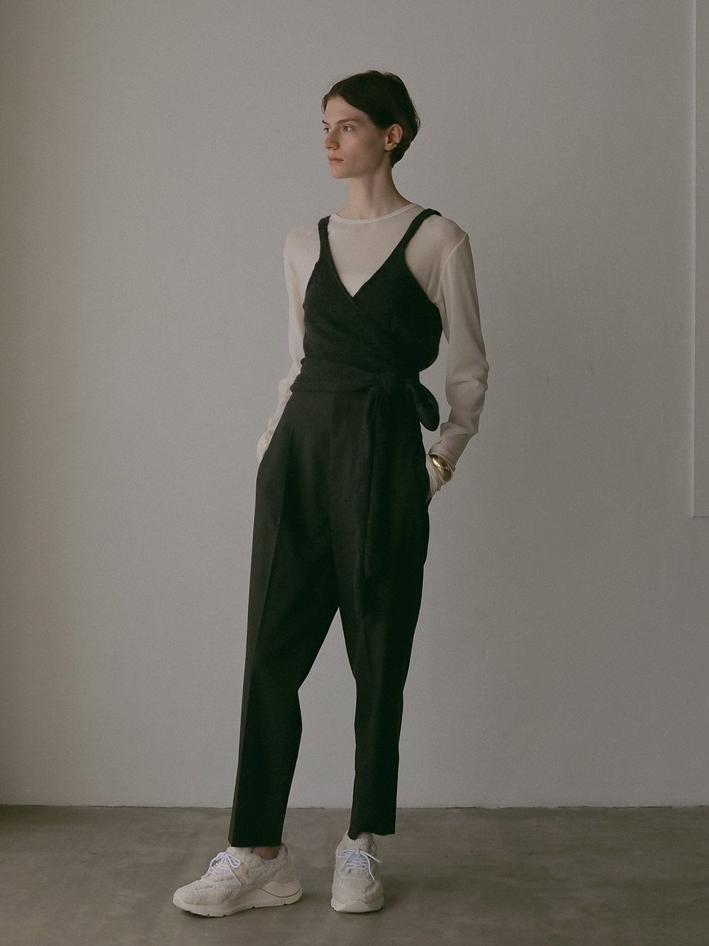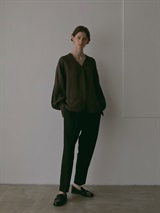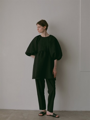 裾にかけてストンと落ちるようなテーパードシルエットのパンツ。ややハイウエストですっきりと仕上げています。ボリュームのあるトップスに合わせていただくとバランスが良くスタイリングをまとめてくれるアイテム。しなやかでやわらかな素材を使用しておりシーズンレスでお使いいただける1枚です。