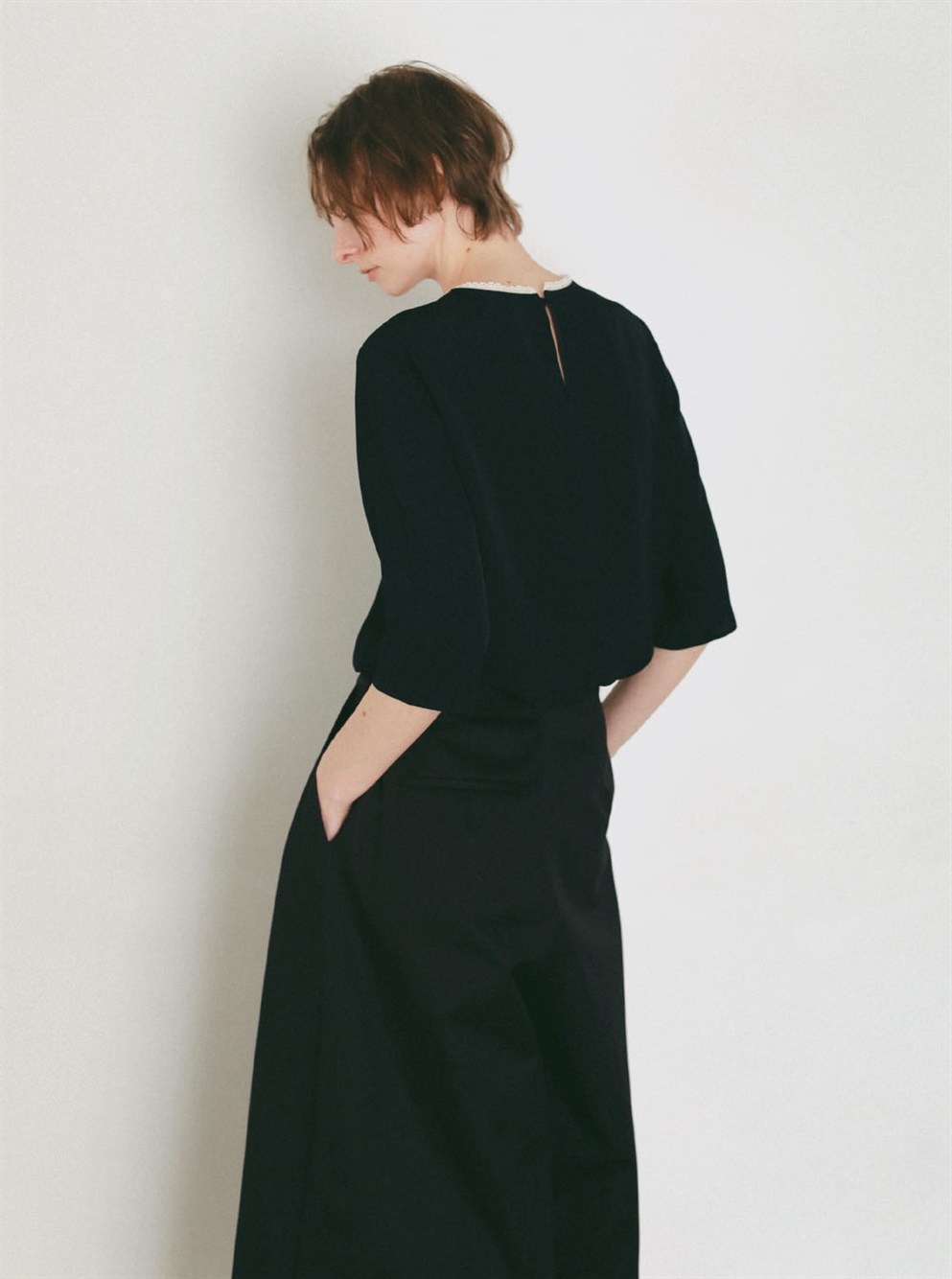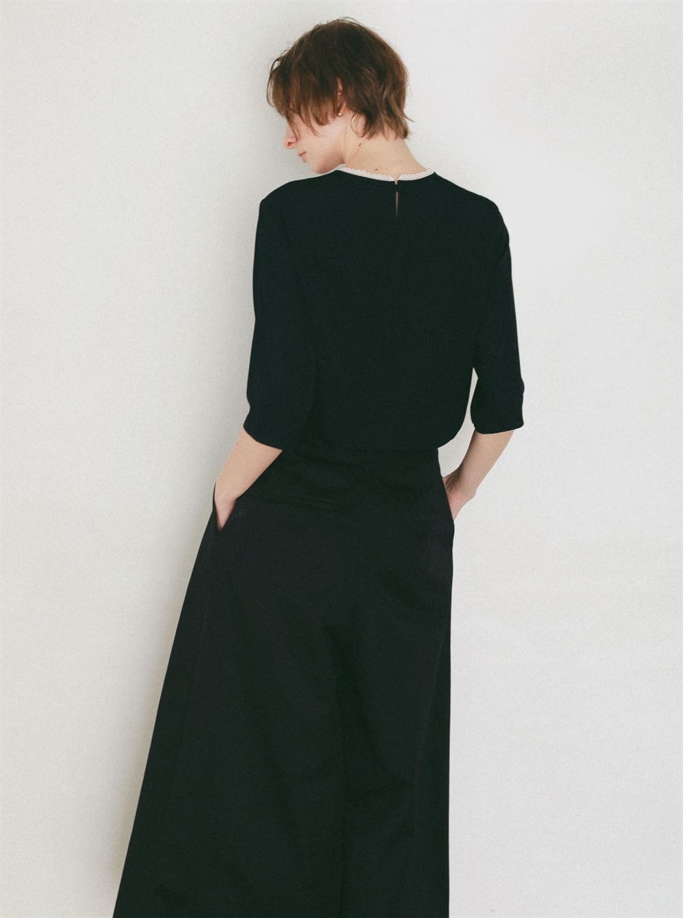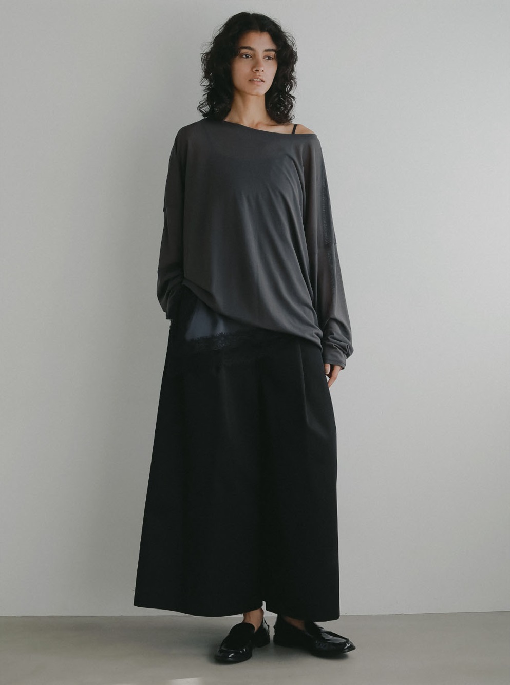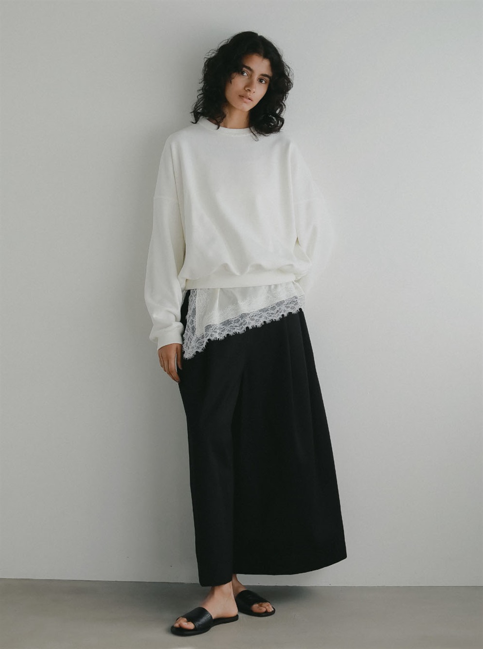 腰回りが大きく見えないサイジングと裾に向かってワイドに広がる裾幅はスカートの様な雰囲気でもご着用いただけます。