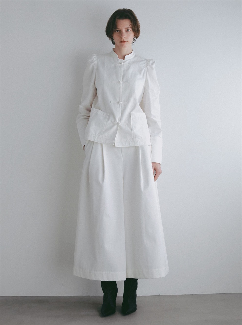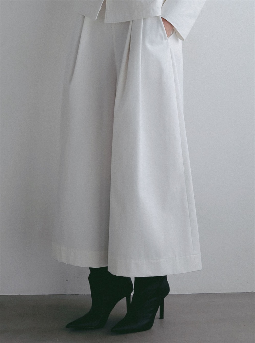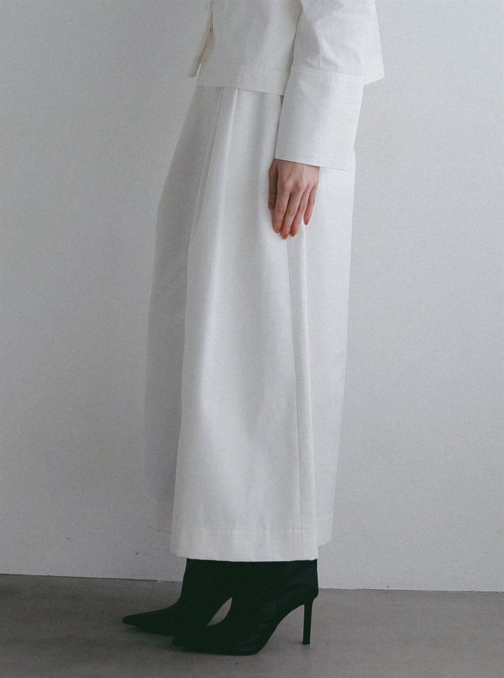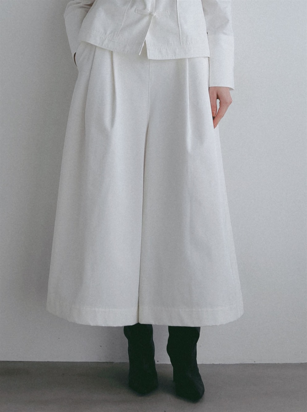 スッキリとした目が特徴のオーガニックコットンを使用したタックワイドパンツ。
