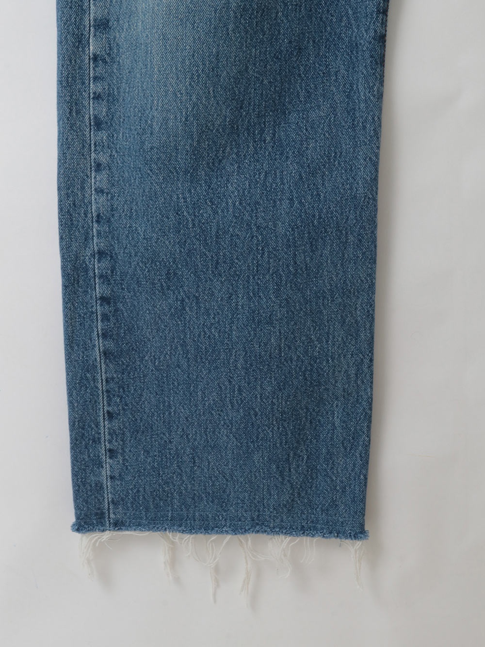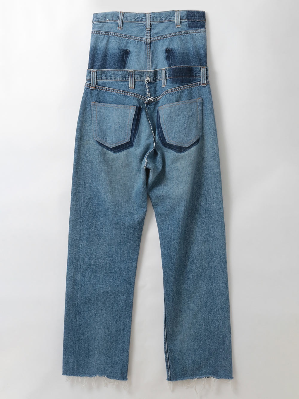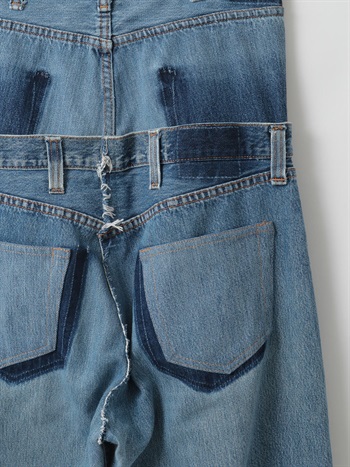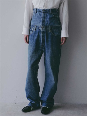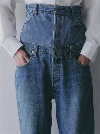 古着とデニム糸を使用し、オリジナルテキスタイルを組み合わせて作成した生地の、デニムパンツです。