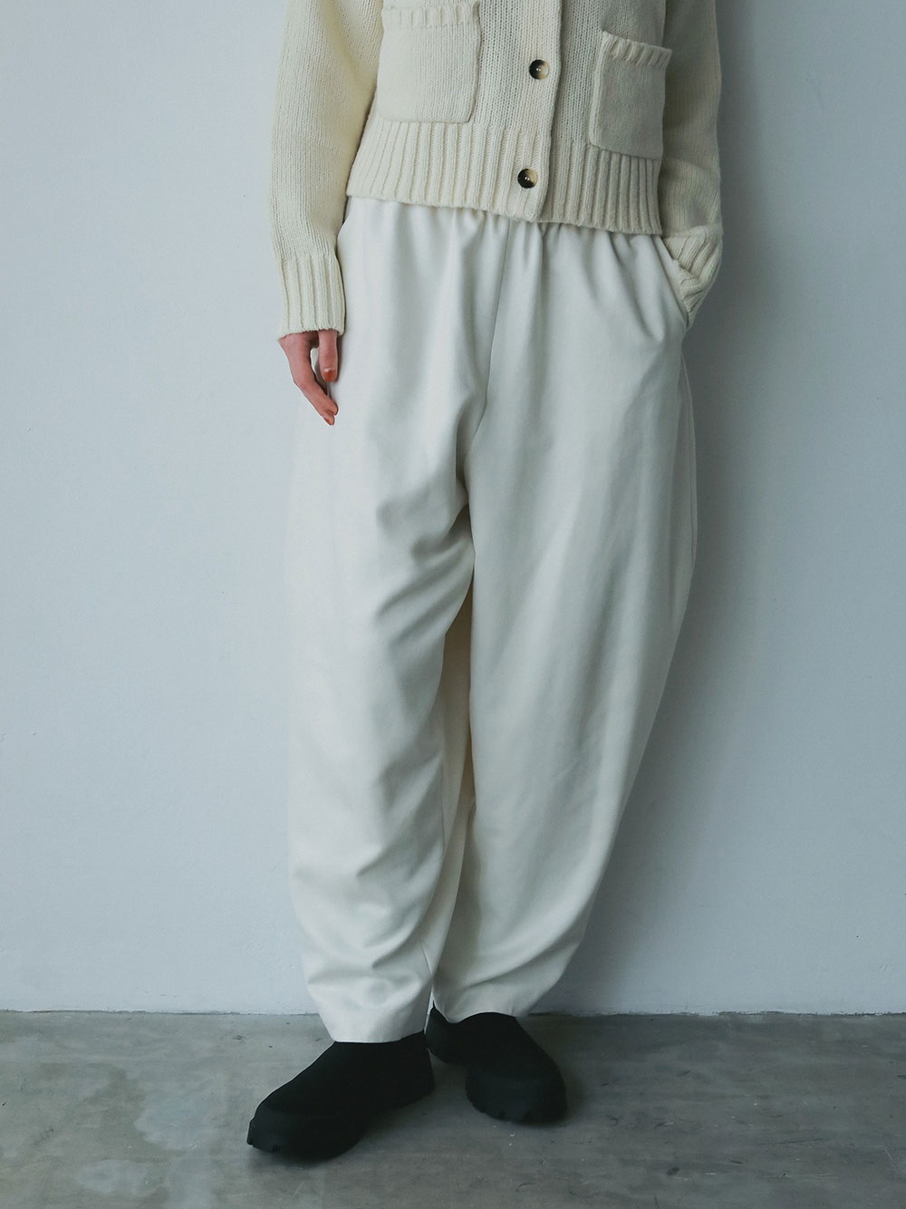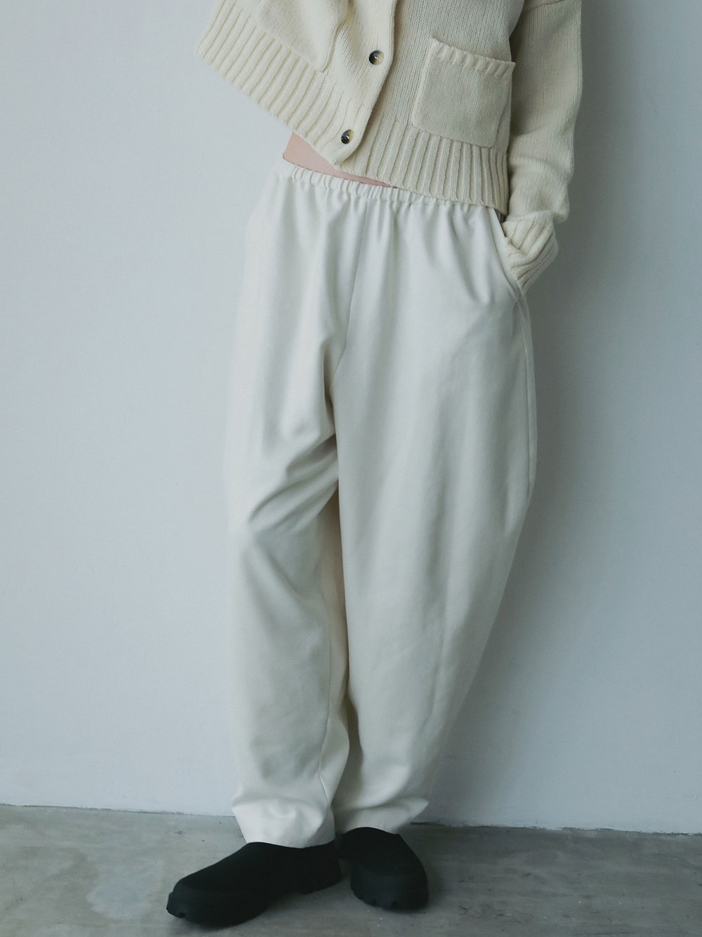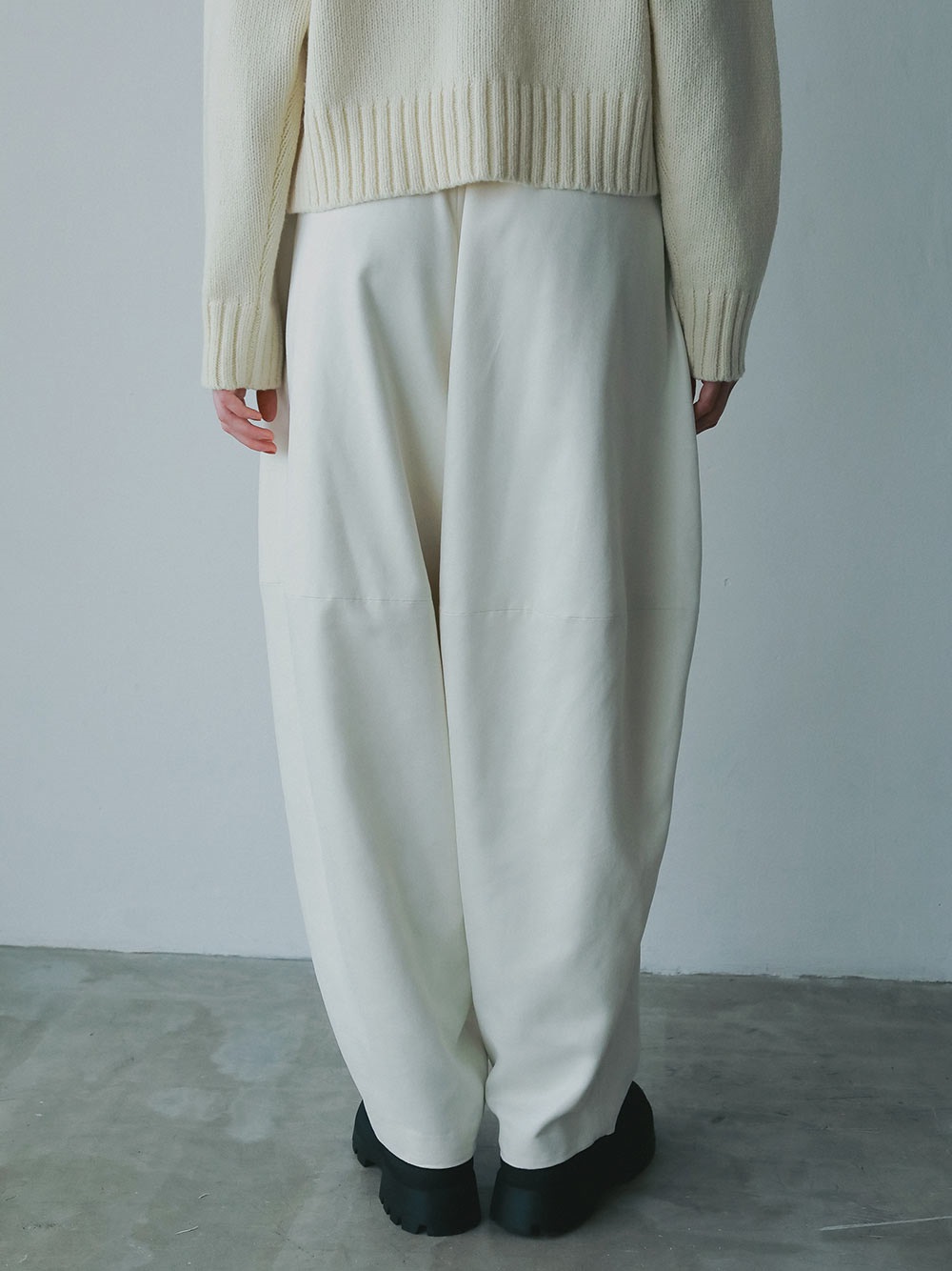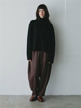 スウェードライクな素材を使用した今期らしい素材感のデザインイージーパンツ。後ろの膝辺りで切り替えることでフォルムが出るようにしました。冬のニットスタイリングをこなれた雰囲気に仕上げてくれル1枚。