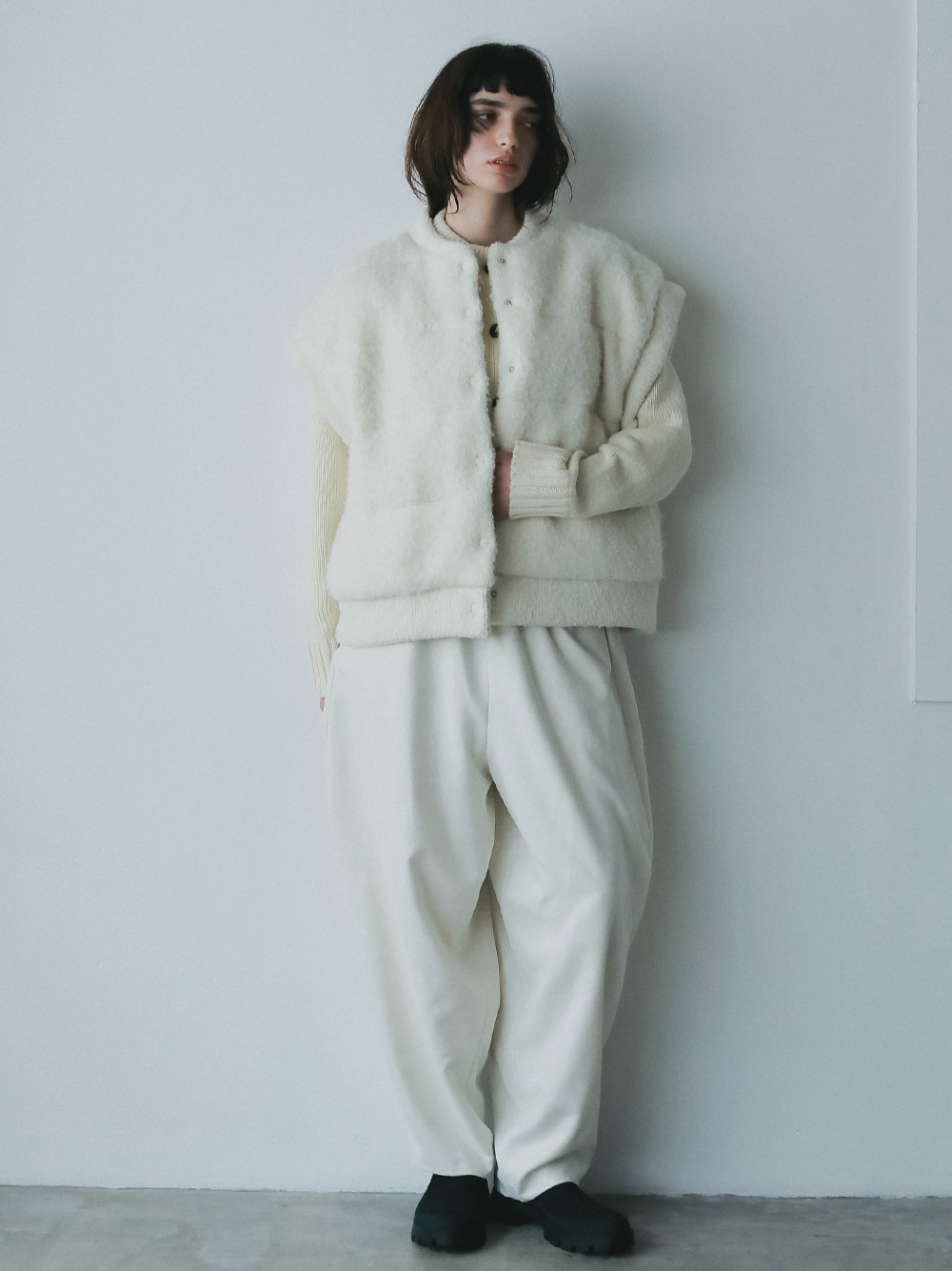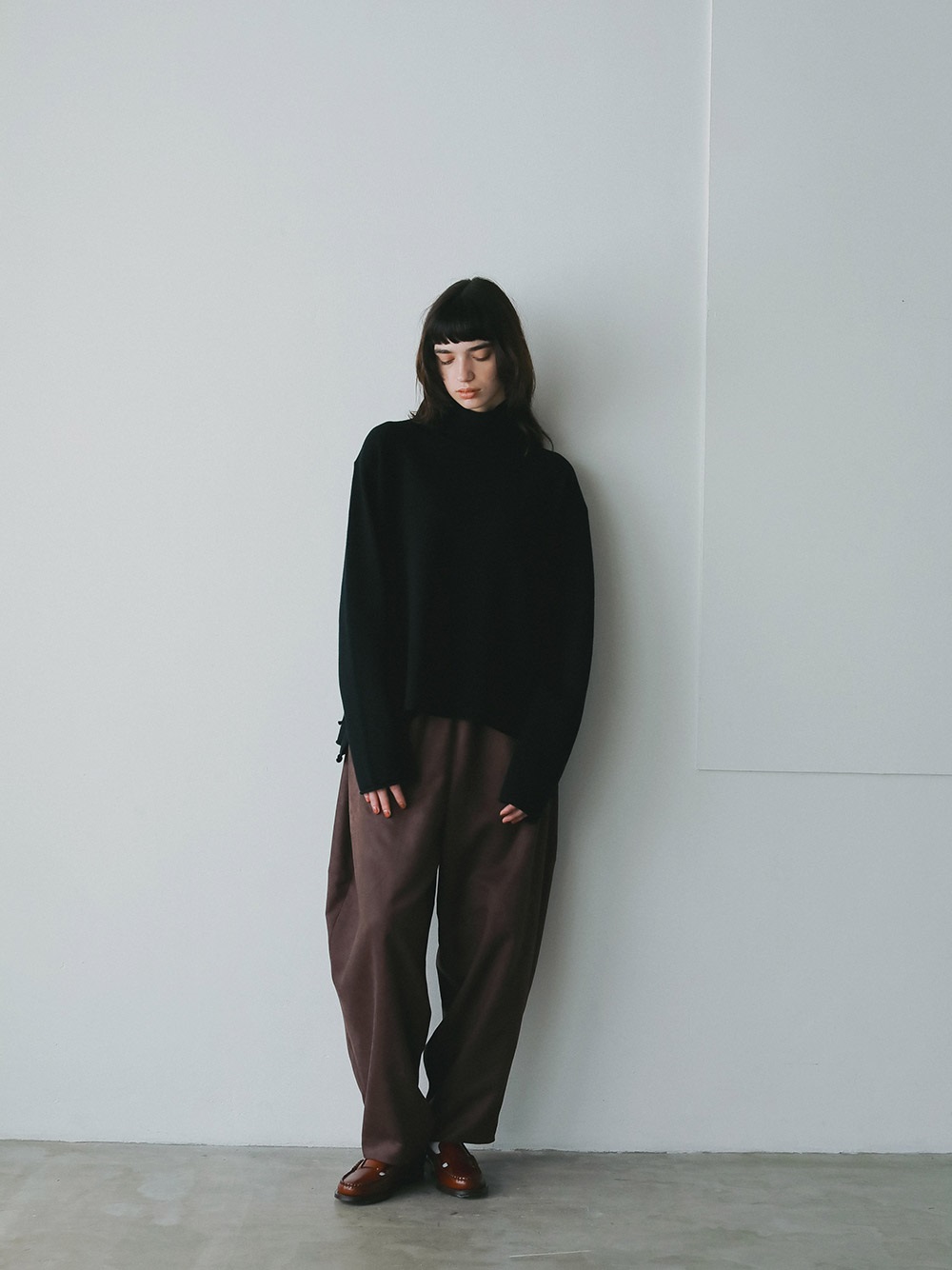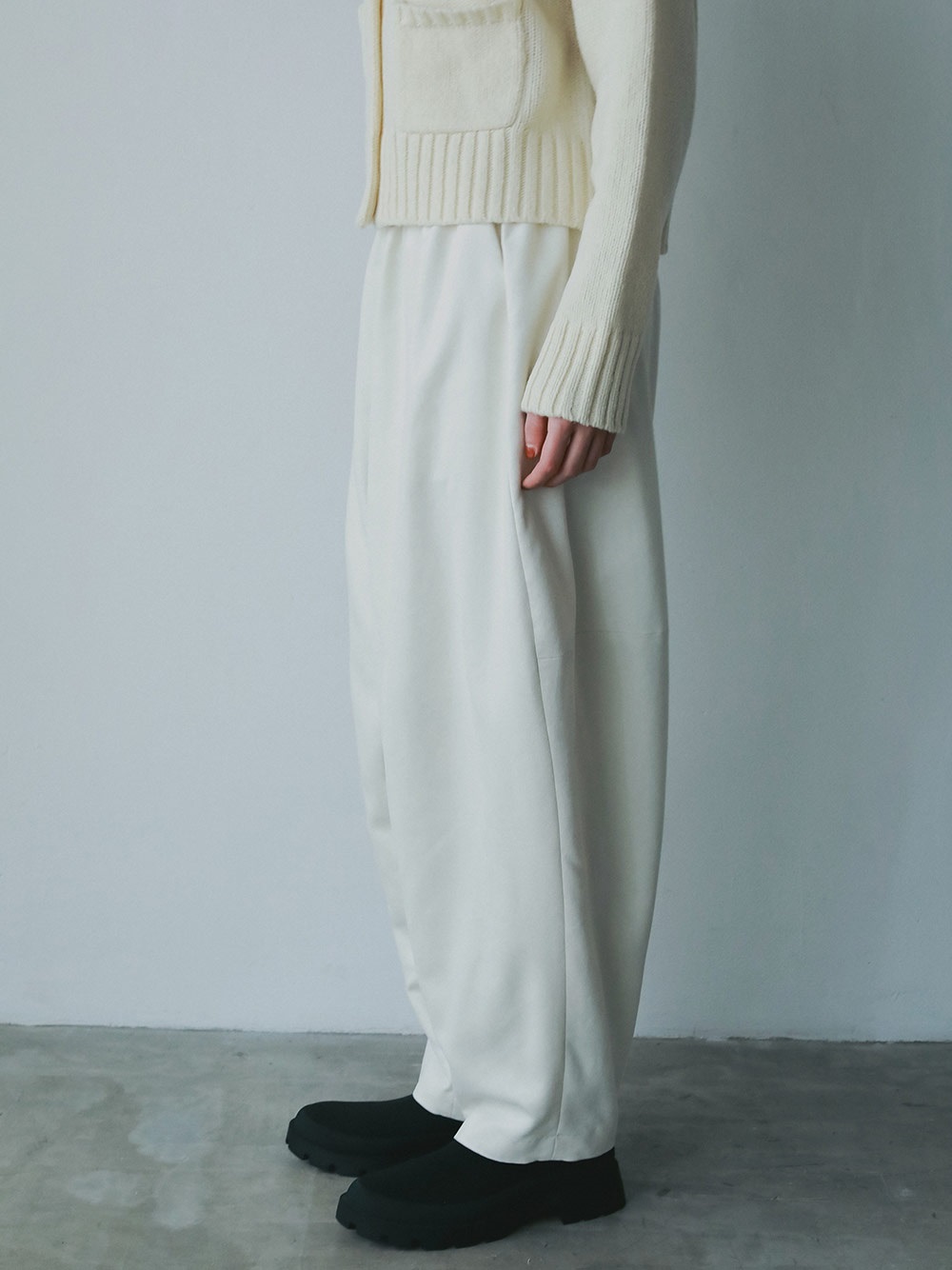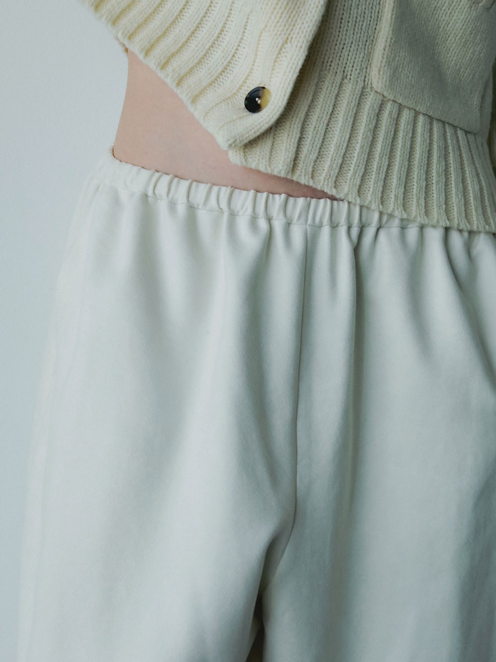 スウェードライクな素材を使用した今期らしい素材感のデザインイージーパンツ。後ろの膝辺りで切り替えることでフォルムが出るようにしました。冬のニットスタイリングをこなれた雰囲気に仕上げてくれル1枚。