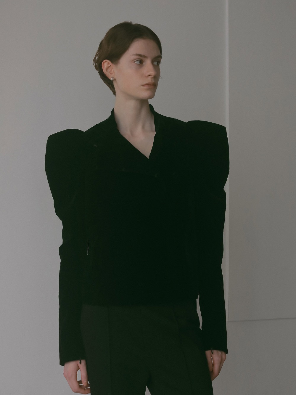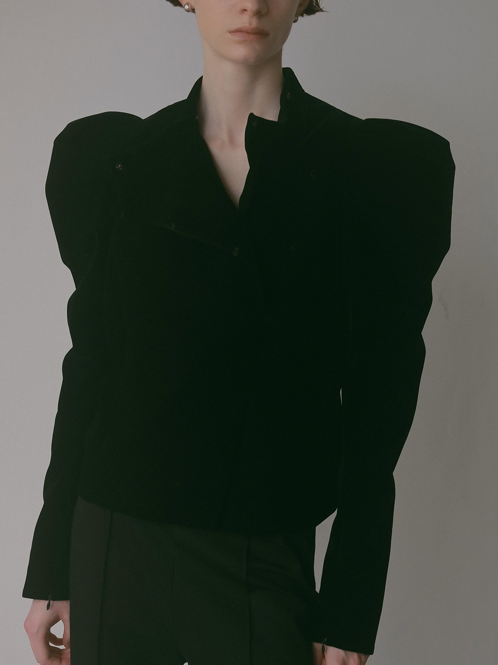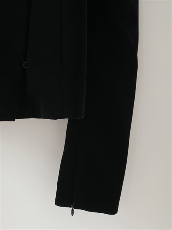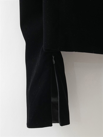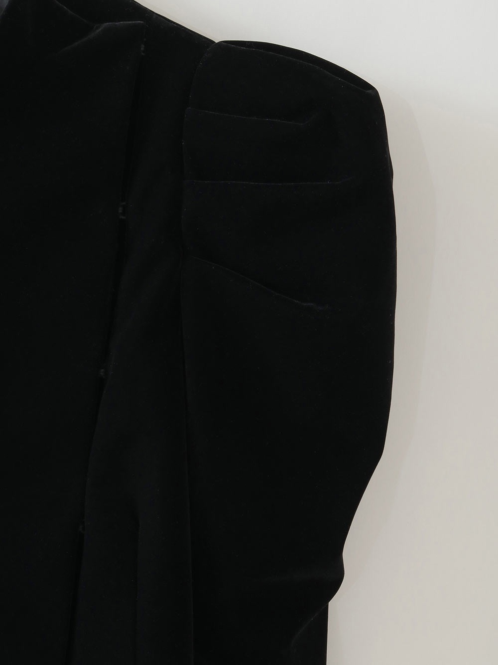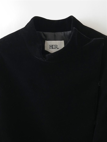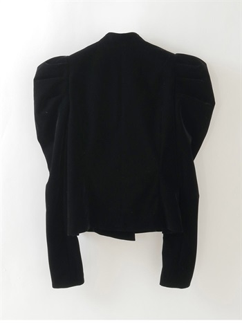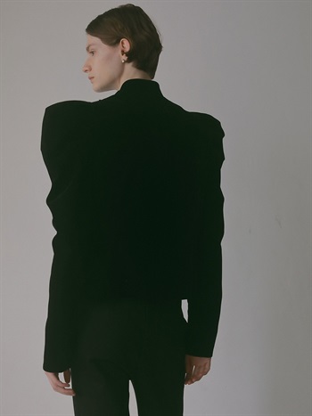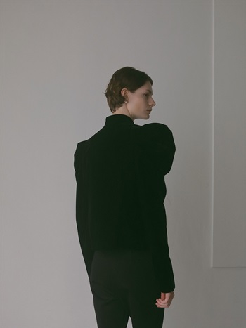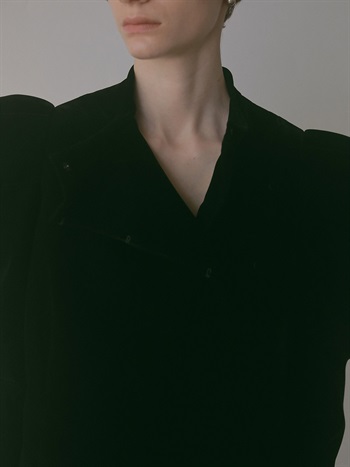 適度にハリのあるベロアを使用したデザインジャケット。コンパクトなサイズ感のボディに対してパワーショルダーデザインが特徴的な1枚。袖山の形を出すため仕様に拘りました。デニムなどカジュアルボトムとのスタイリングがおすすめです。