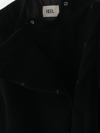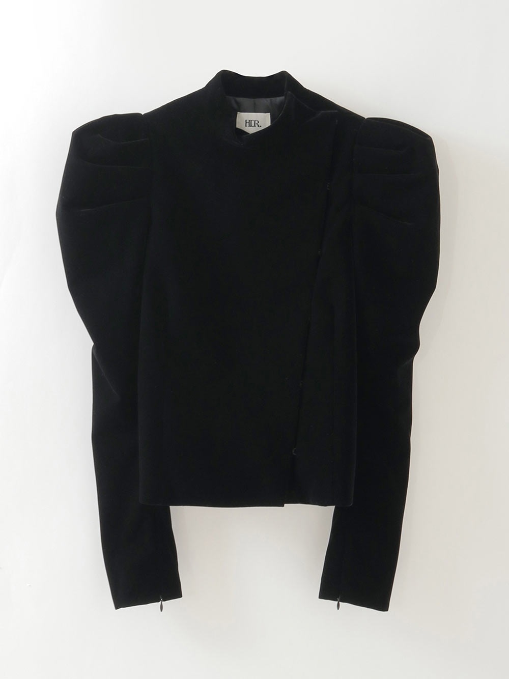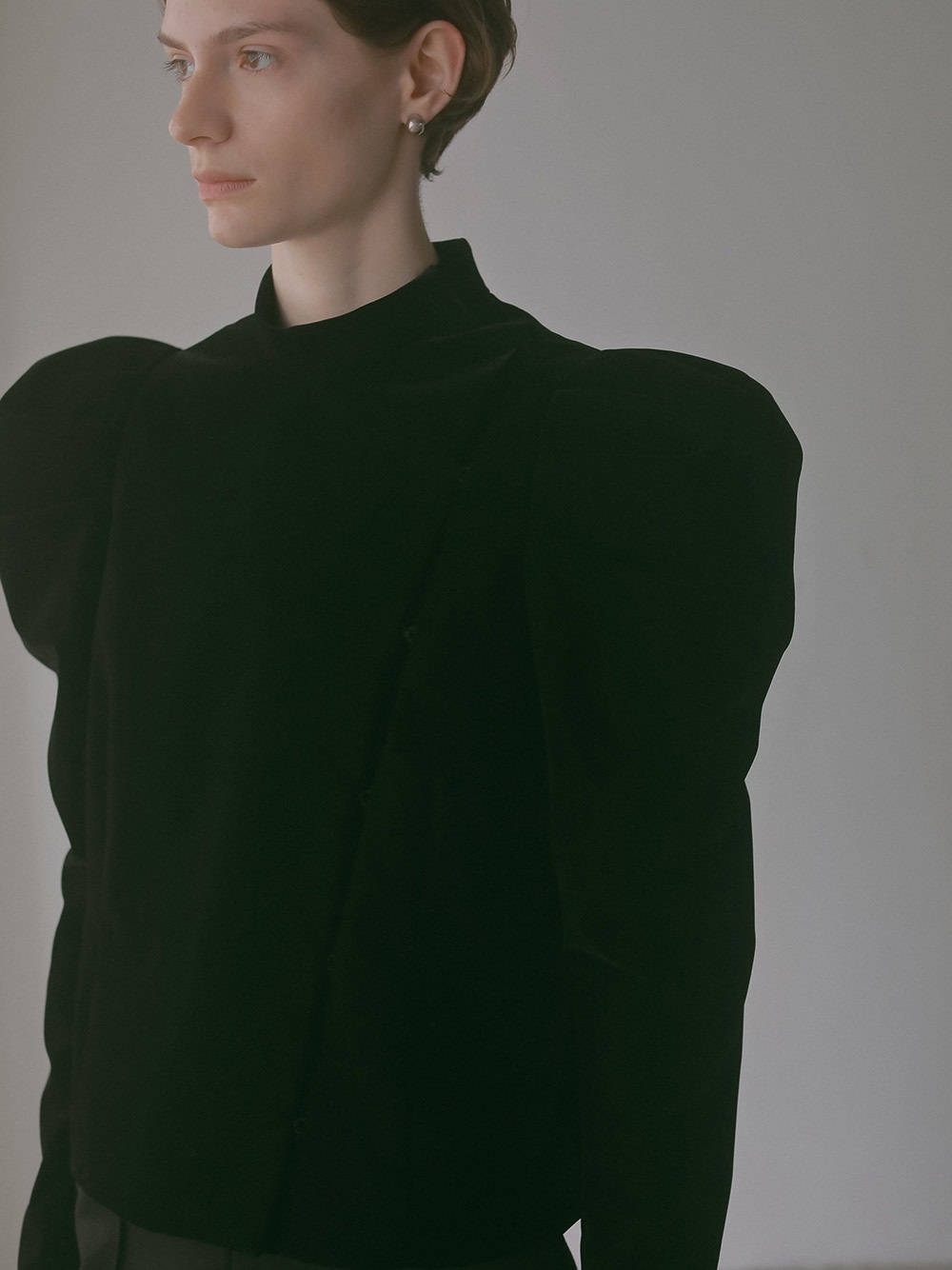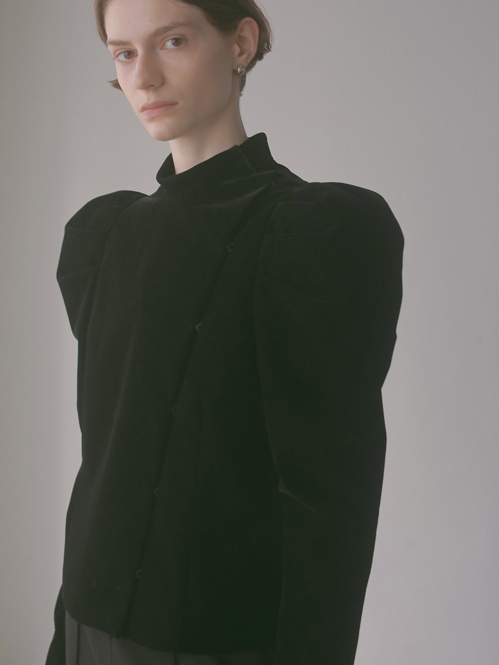 適度にハリのあるベロアを使用したデザインジャケット。コンパクトなサイズ感のボディに対してパワーショルダーデザインが特徴的な1枚。袖山の形を出すため仕様に拘りました。デニムなどカジュアルボトムとのスタイリングがおすすめです。