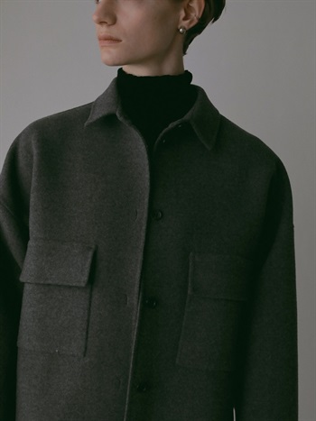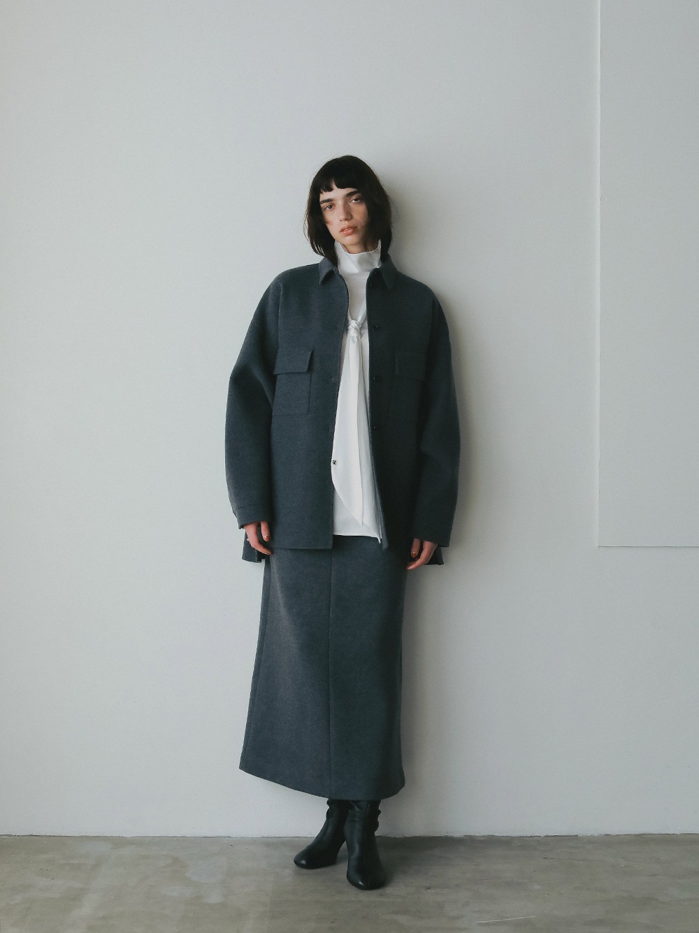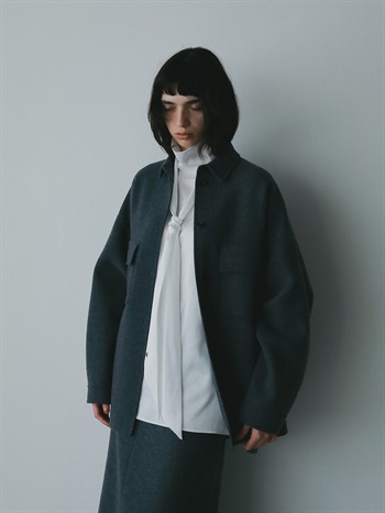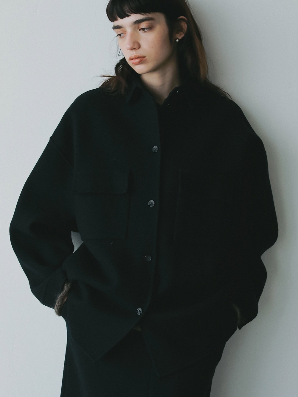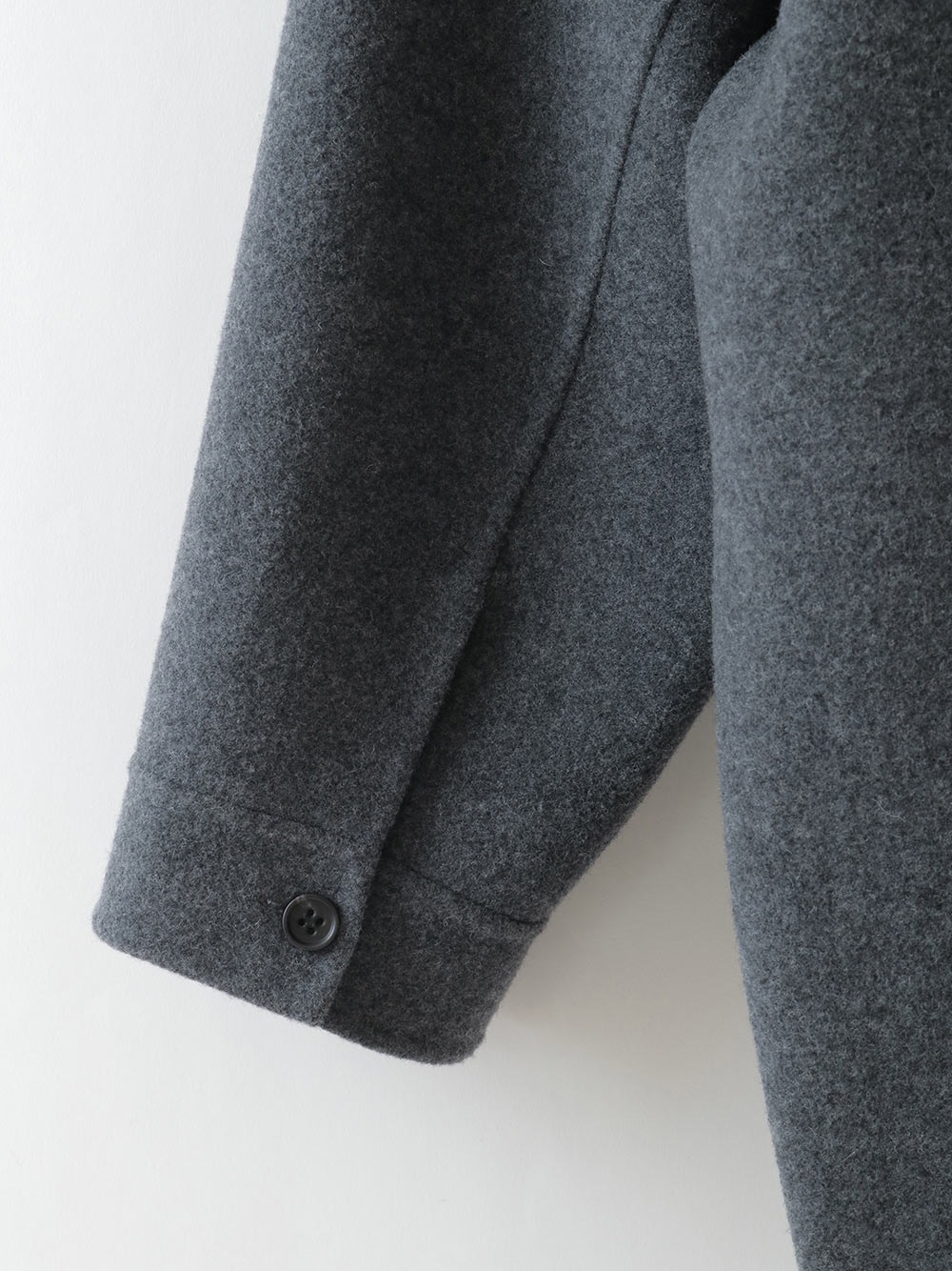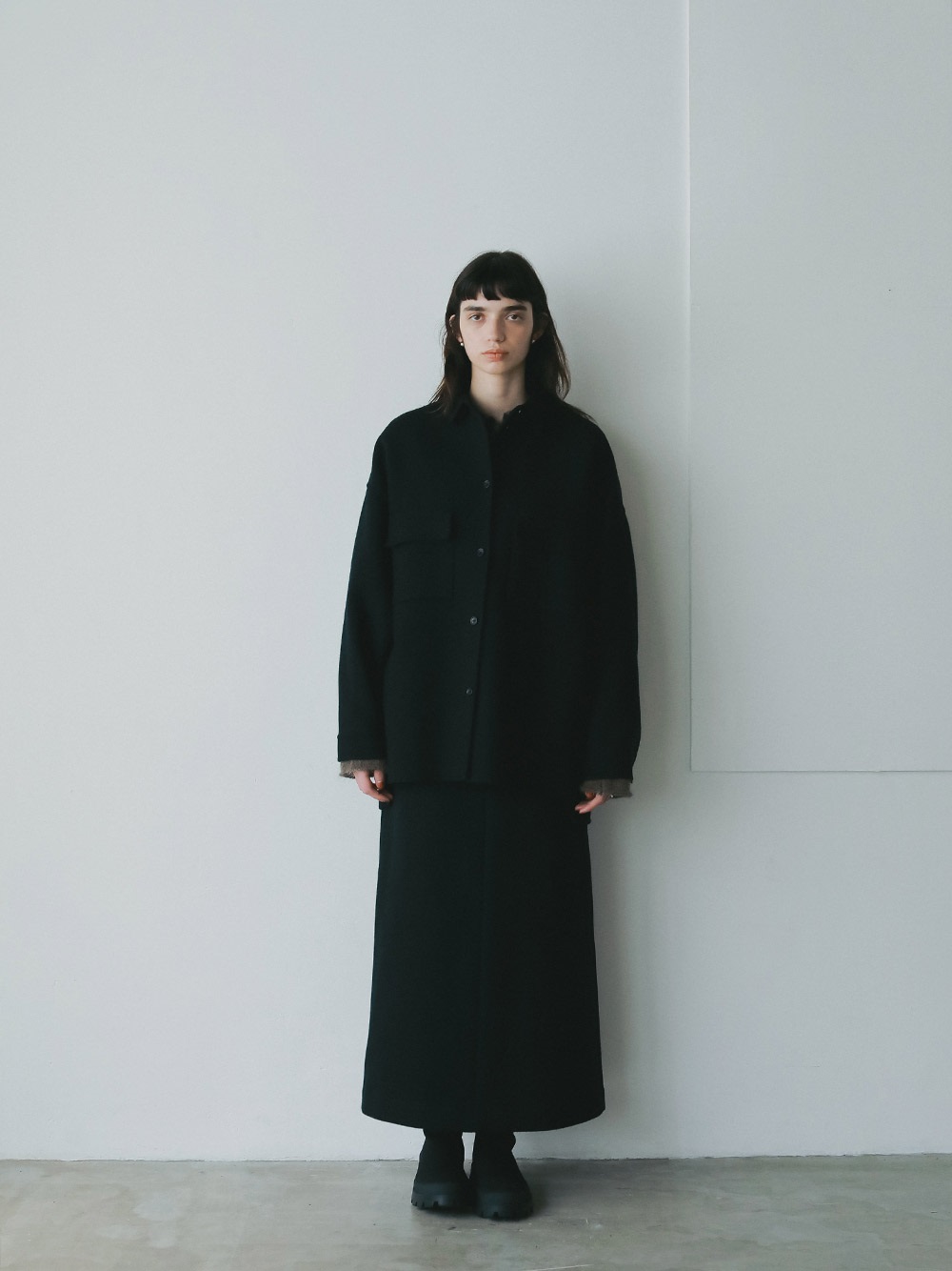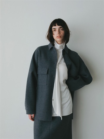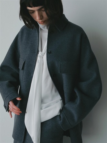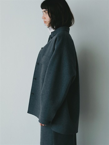 wool / nylon 混率のメルトンリバー素材を使用したオーバーシャツジャケット。ウールならではの温かみのある風合いに程良い光沢感のある素材で、二重織なので軽量なのに程よいハリ感もあります。オーバーサイズのシャツジャケットで軽く羽織っていただけます。同素材のスカートとのスタイリングもおすすめです。