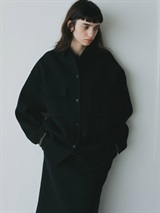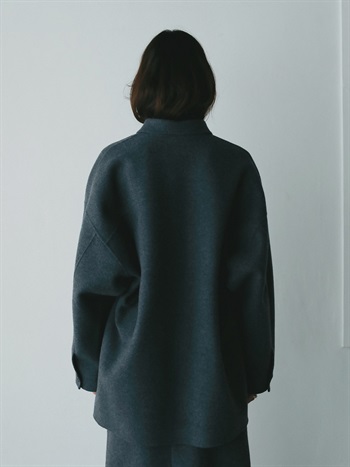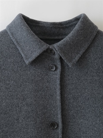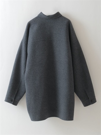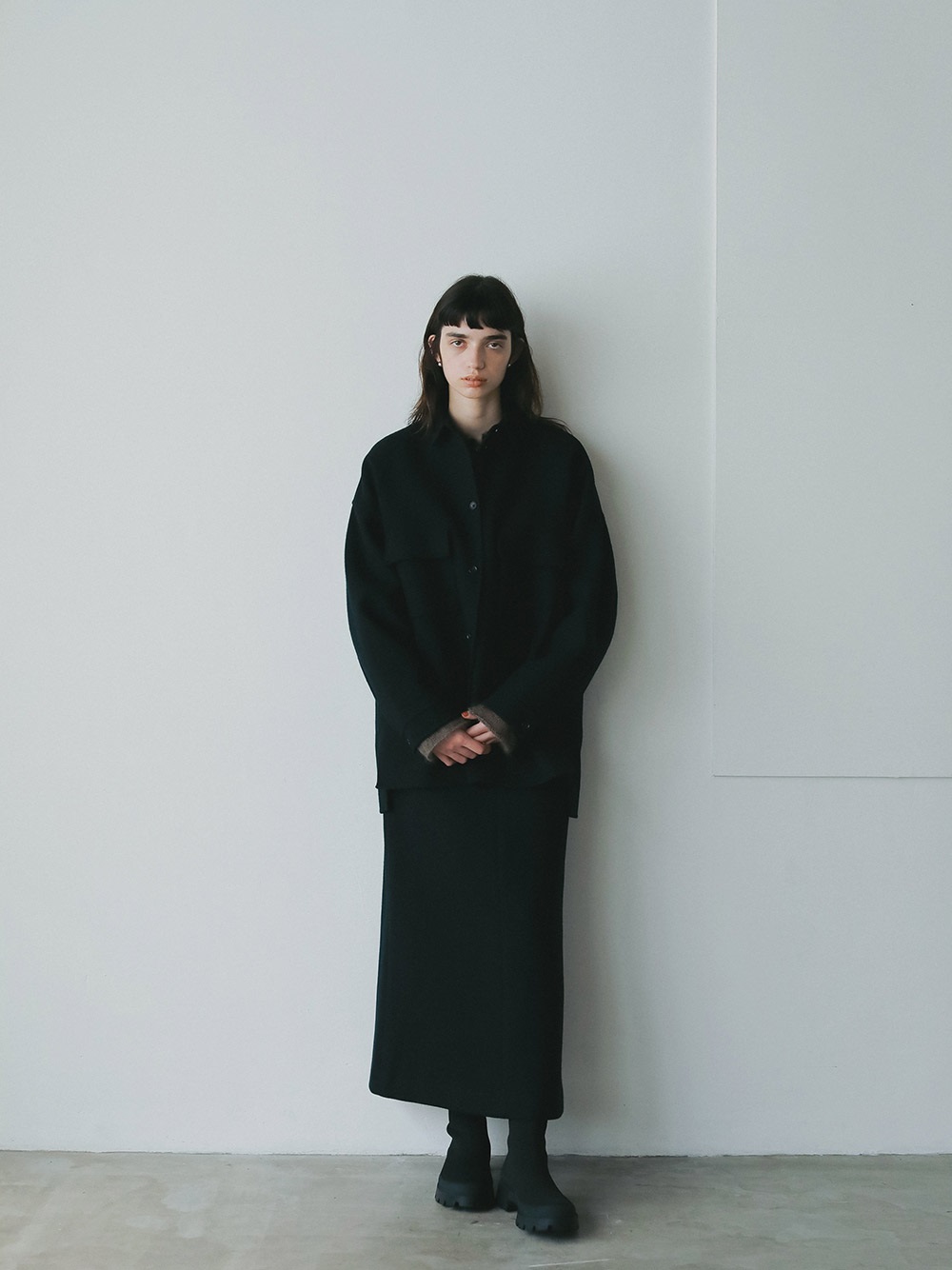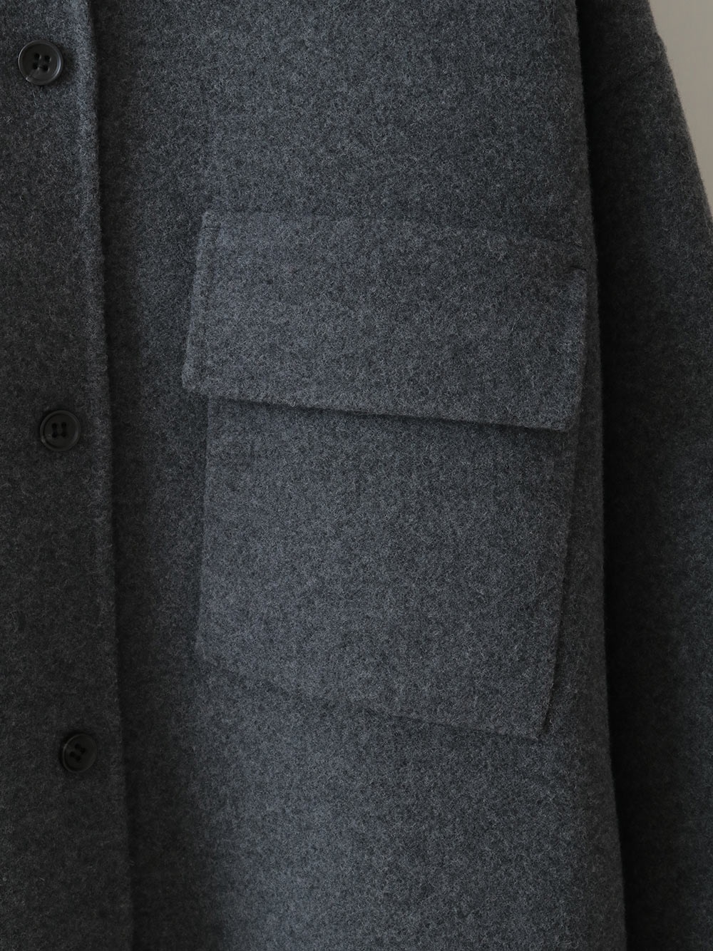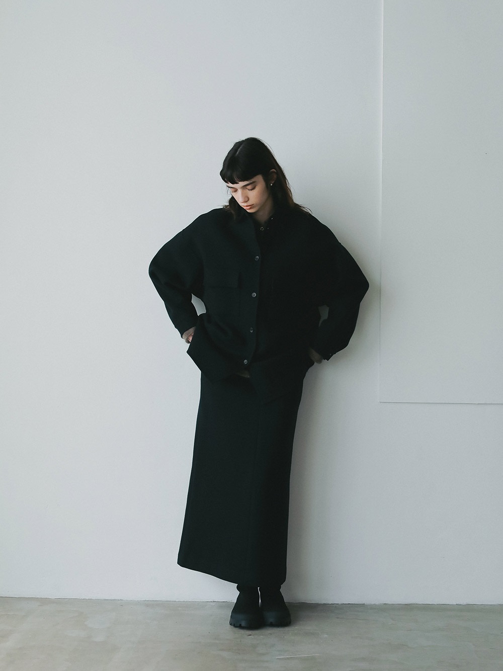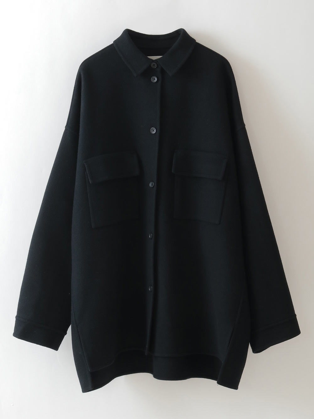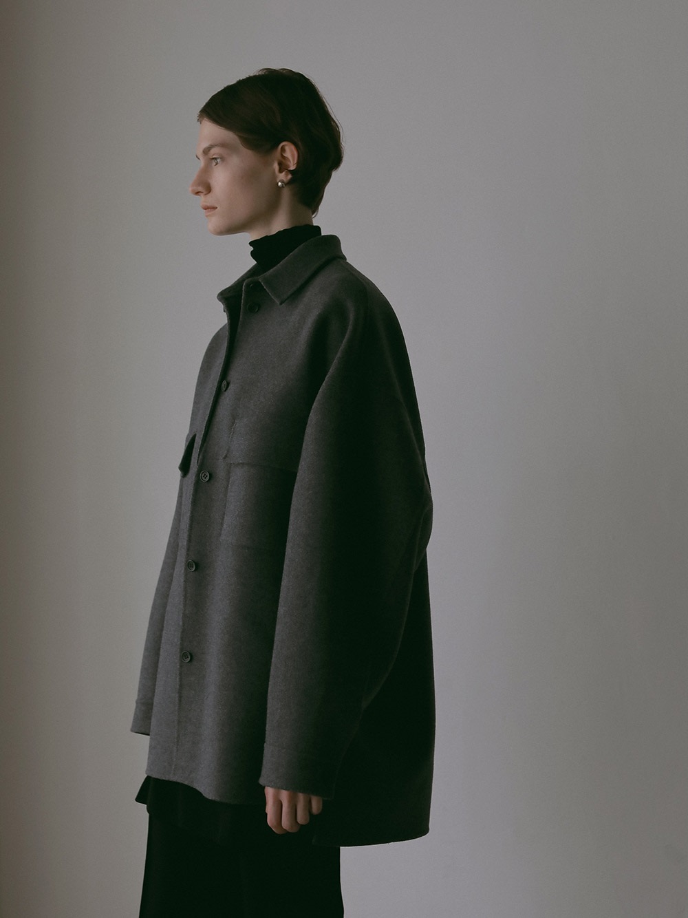 wool / nylon 混率のメルトンリバー素材を使用したオーバーシャツジャケット。ウールならではの温かみのある風合いに程良い光沢感のある素材で、二重織なので軽量なのに程よいハリ感もあります。オーバーサイズのシャツジャケットで軽く羽織っていただけます。同素材のスカートとのスタイリングもおすすめです。