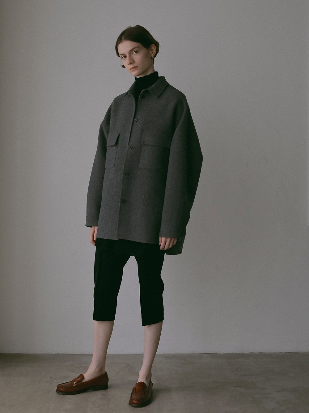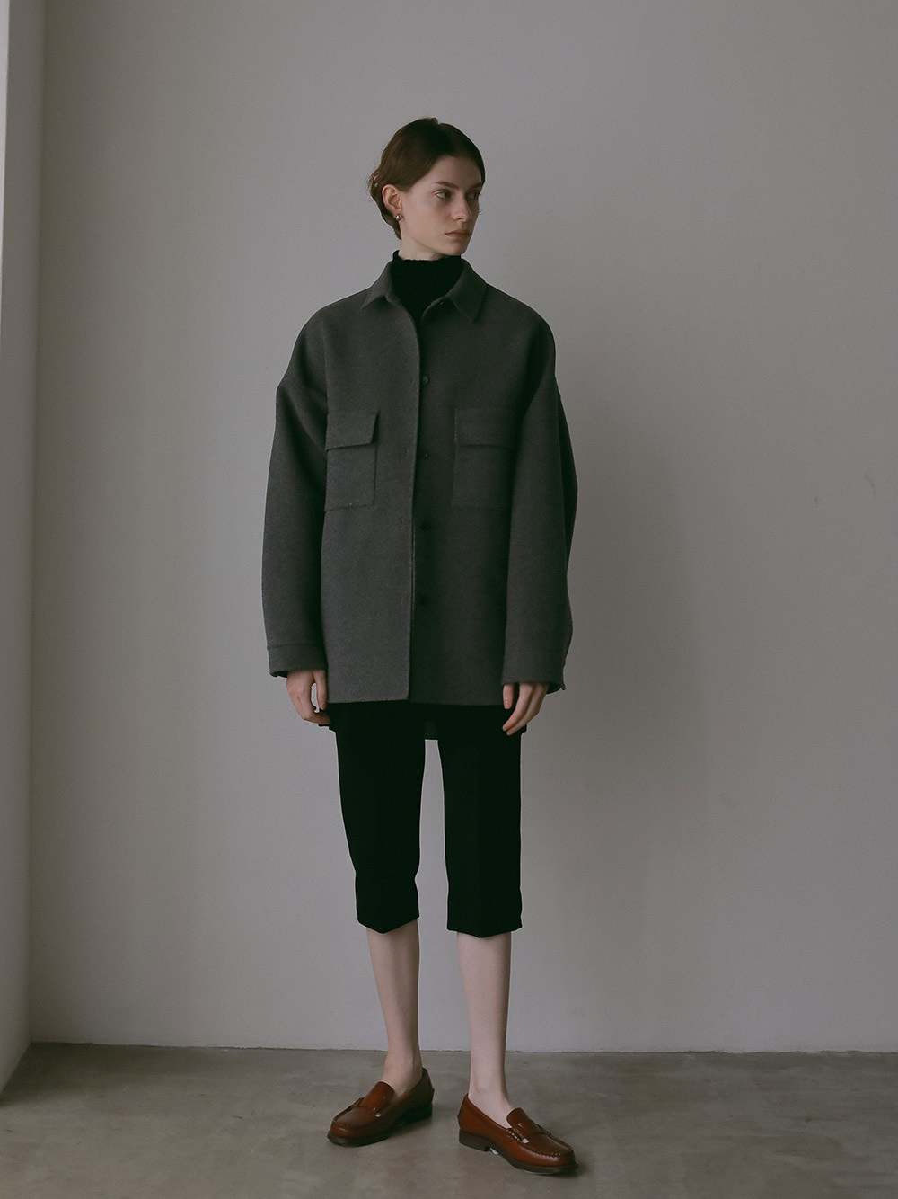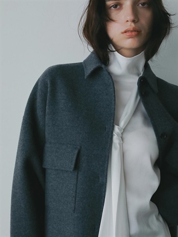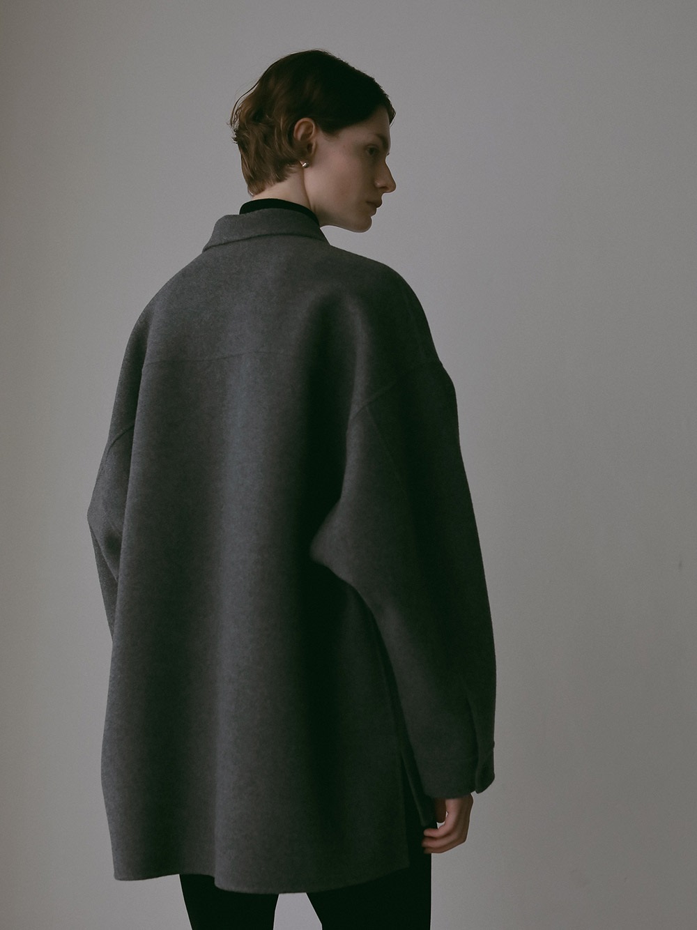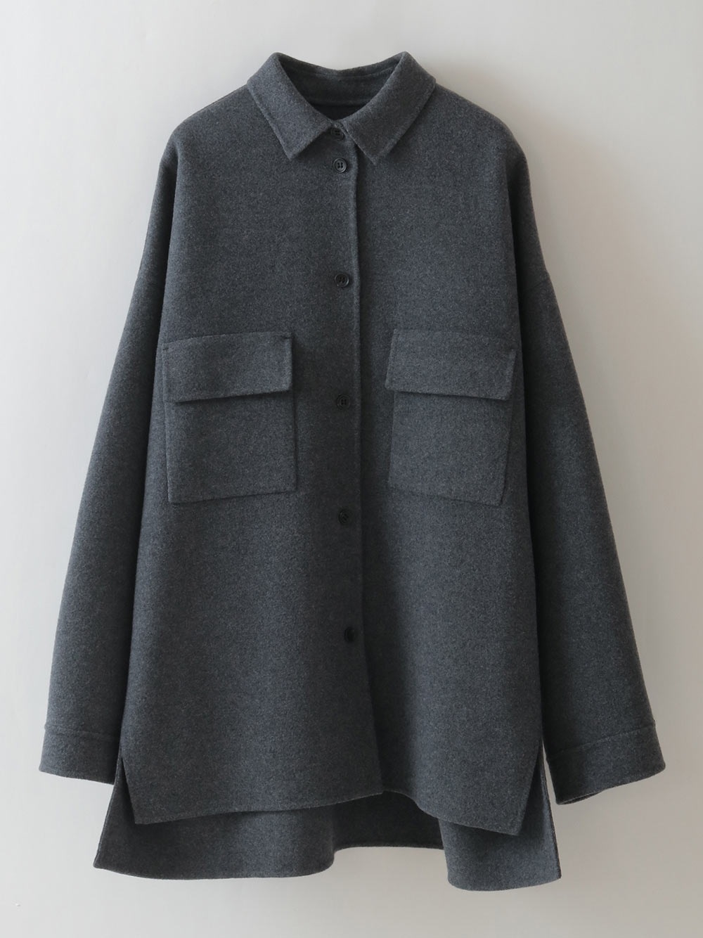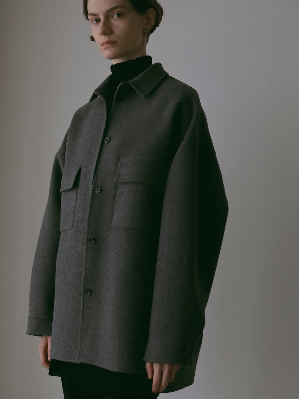 wool / nylon 混率のメルトンリバー素材を使用したオーバーシャツジャケット。ウールならではの温かみのある風合いに程良い光沢感のある素材で、二重織なので軽量なのに程よいハリ感もあります。オーバーサイズのシャツジャケットで軽く羽織っていただけます。同素材のスカートとのスタイリングもおすすめです。