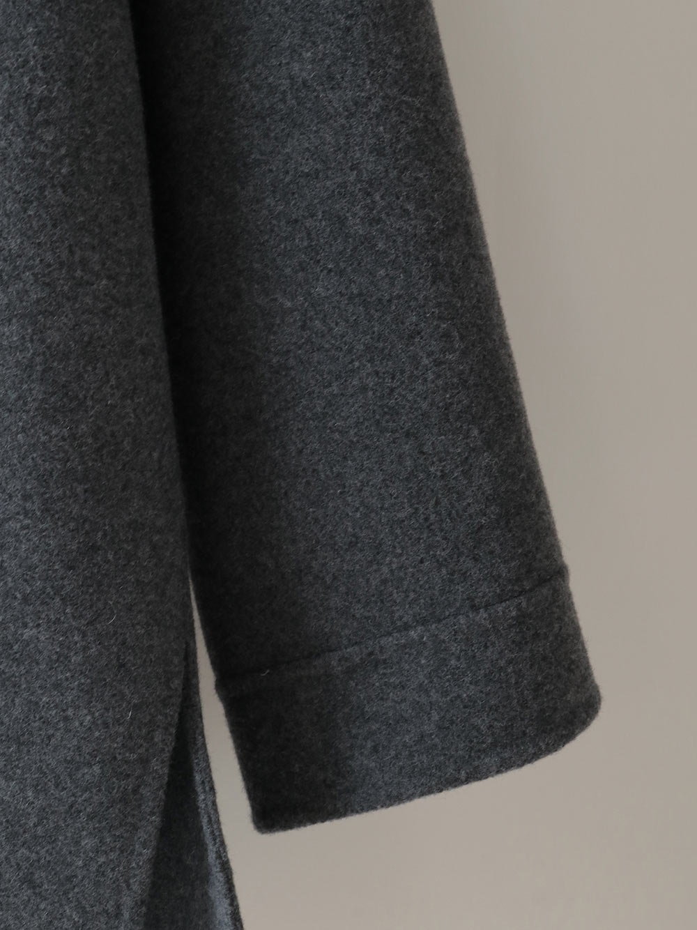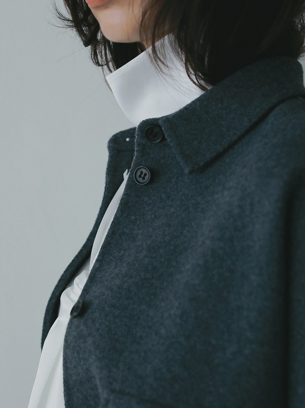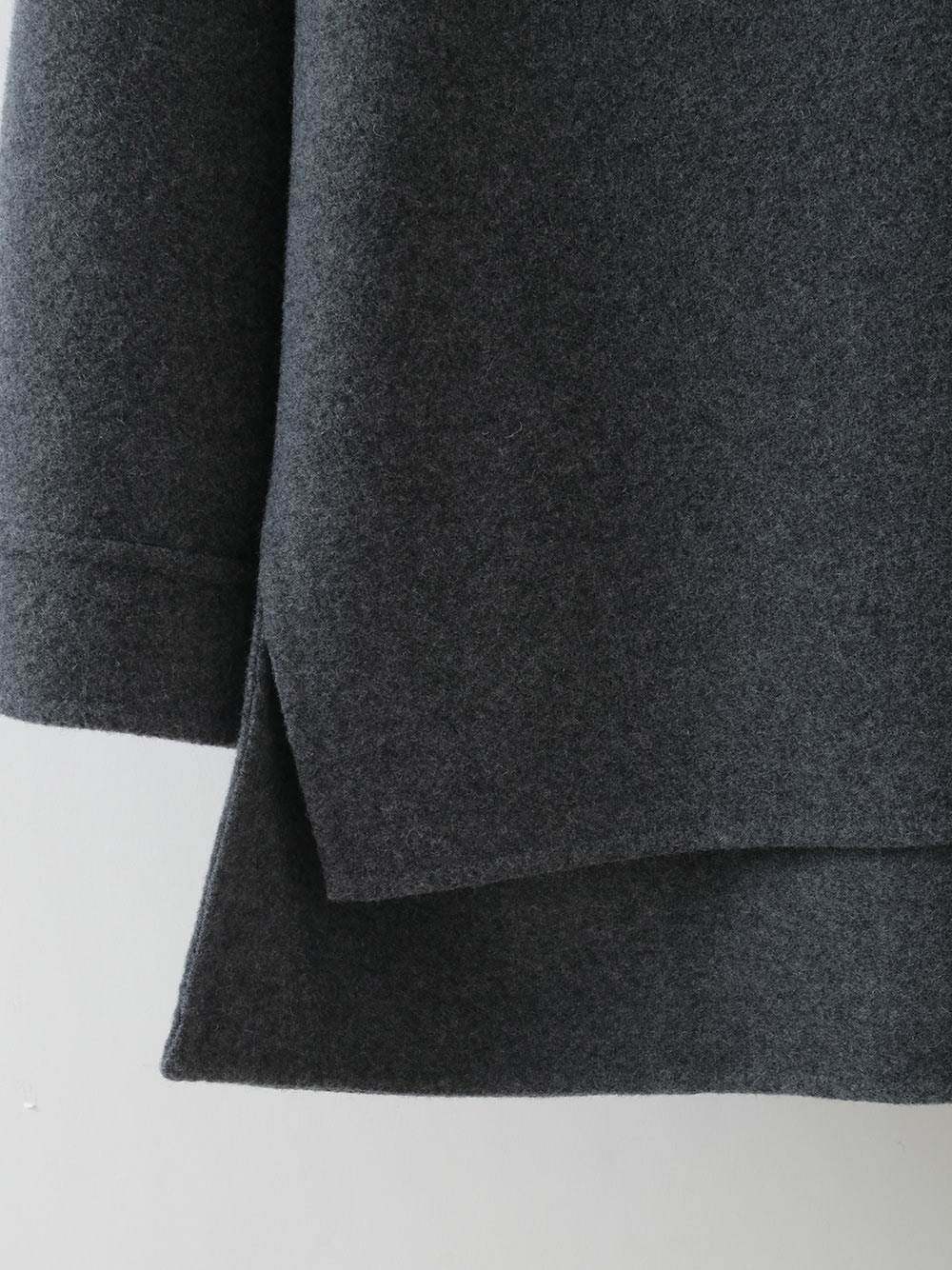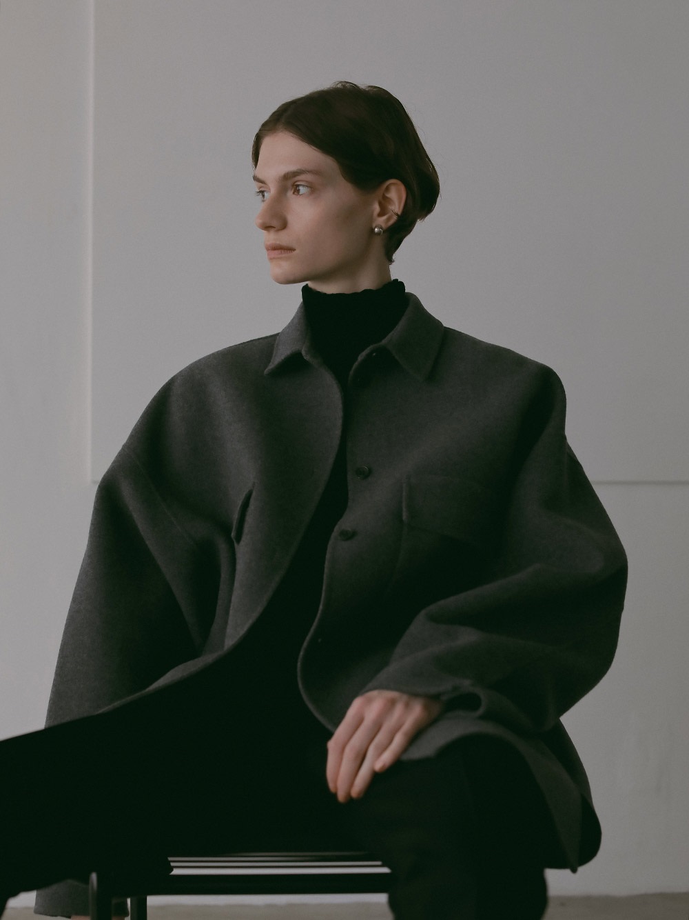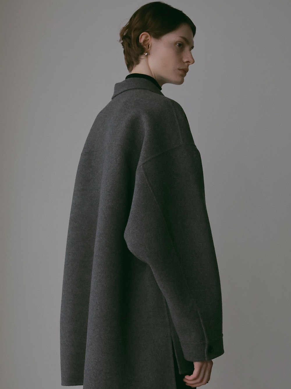 wool / nylon 混率のメルトンリバー素材を使用したオーバーシャツジャケット。ウールならではの温かみのある風合いに程良い光沢感のある素材で、二重織なので軽量なのに程よいハリ感もあります。オーバーサイズのシャツジャケットで軽く羽織っていただけます。同素材のスカートとのスタイリングもおすすめです。