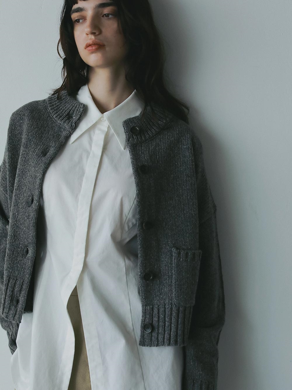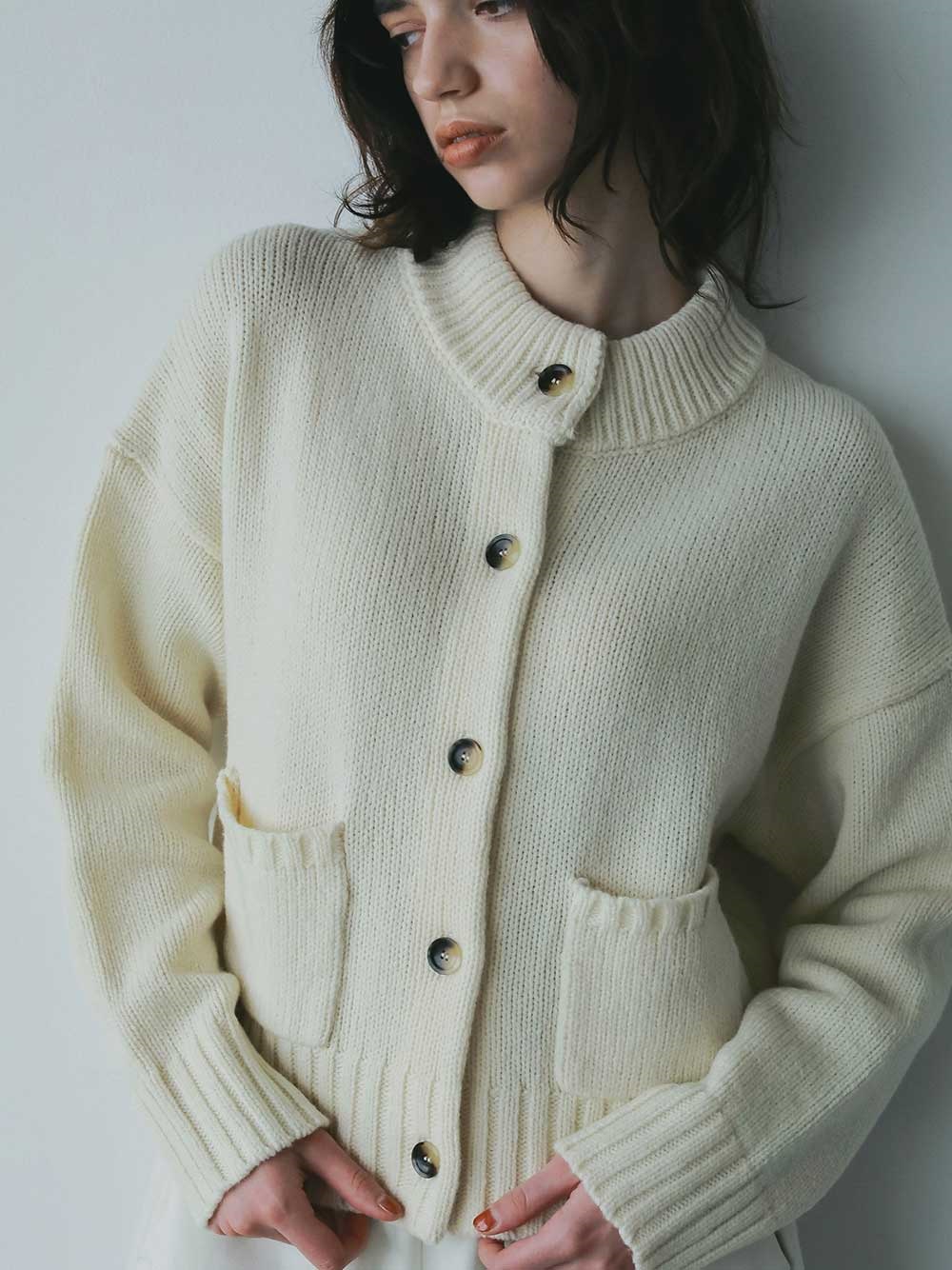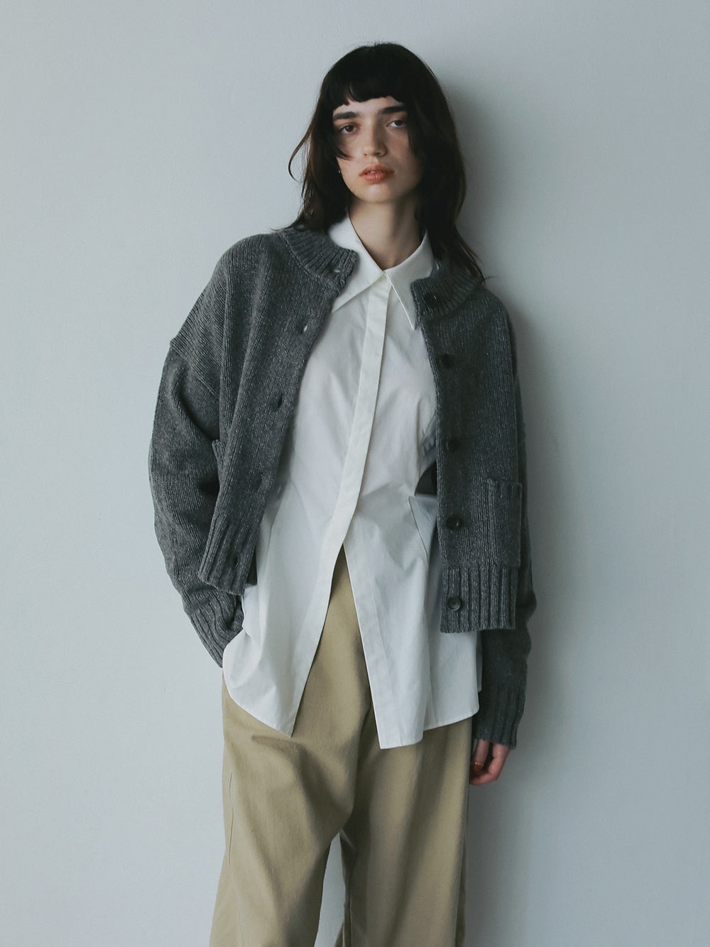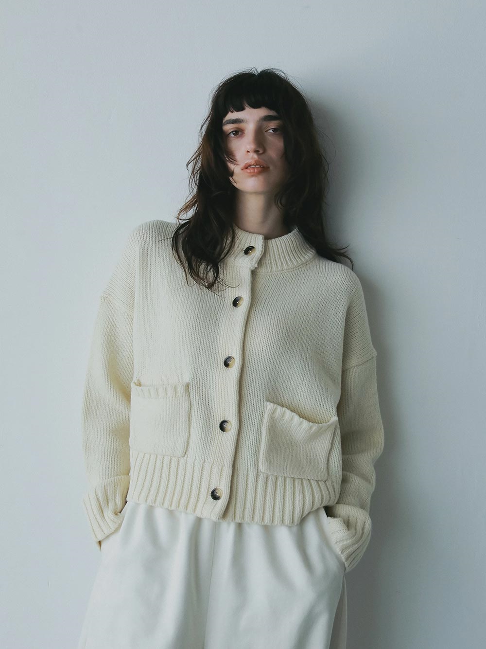 WOOL混率80%で温かみとナチュラルな表情感のある糸を使用したカーディガン。膨らみと肉感を出し程よくフォルムが出るよう編みたてました。すっきりとした丈感で見た目にも軽やかに羽織っていただけます。リブのスタンドカラーとポケットデザインのアクセントでカーデとブルゾンをミックスしたような仕上がりでアウター感覚でお召いただけるアイテムです。