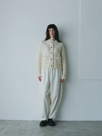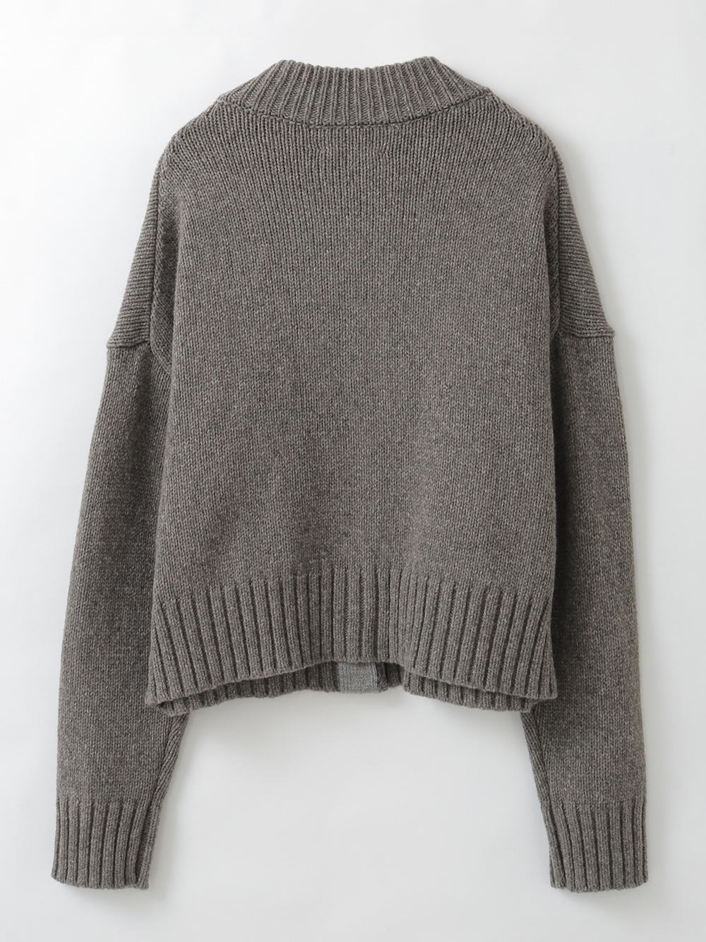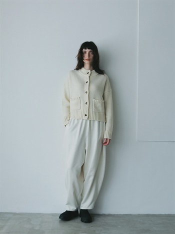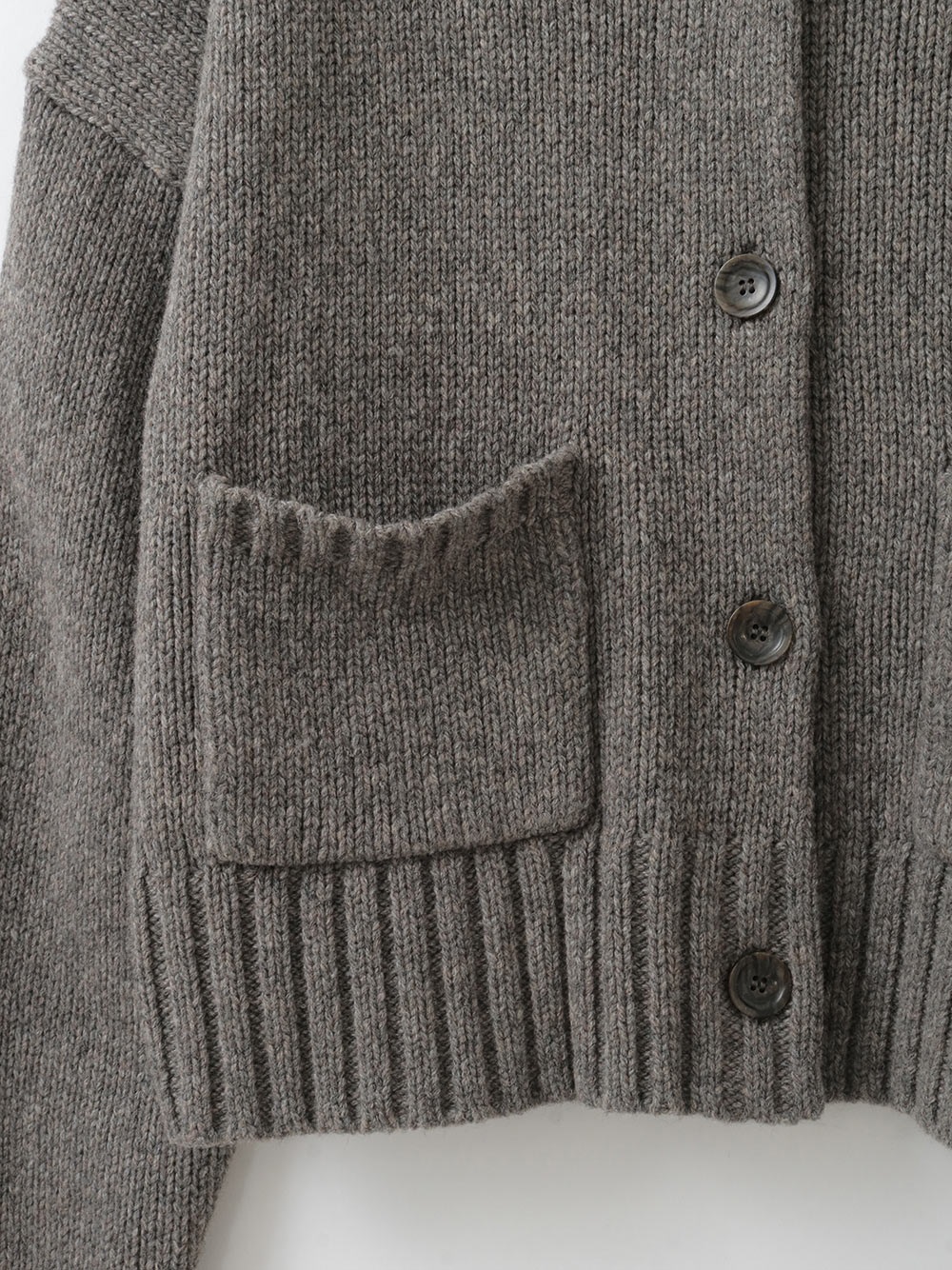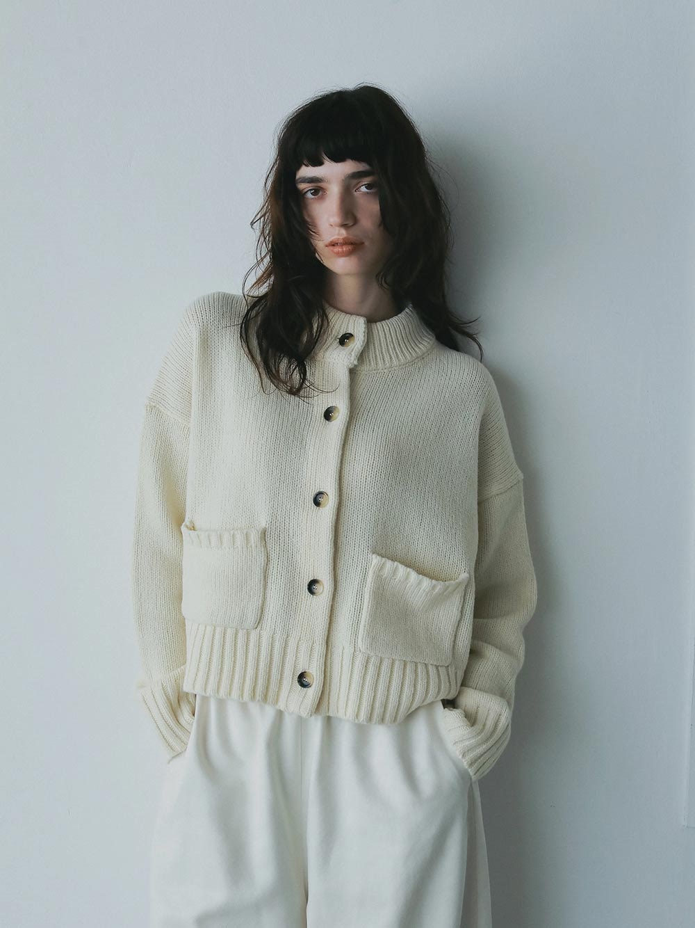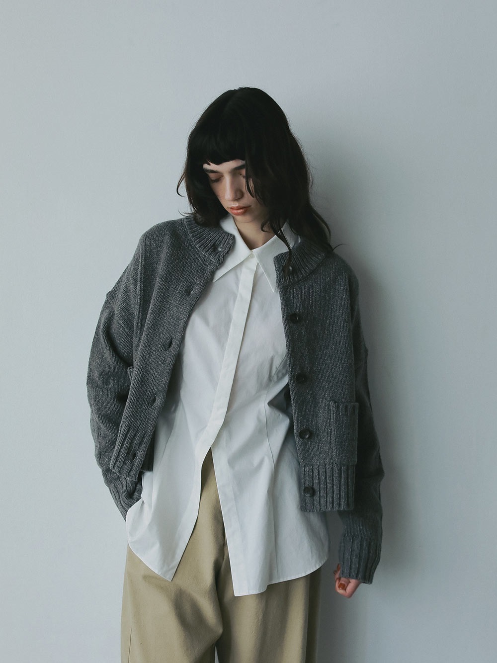 WOOL混率80%で温かみとナチュラルな表情感のある糸を使用したカーディガン。膨らみと肉感を出し程よくフォルムが出るよう編みたてました。すっきりとした丈感で見た目にも軽やかに羽織っていただけます。リブのスタンドカラーとポケットデザインのアクセントでカーデとブルゾンをミックスしたような仕上がりでアウター感覚でお召いただけるアイテムです。