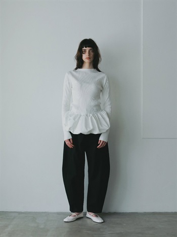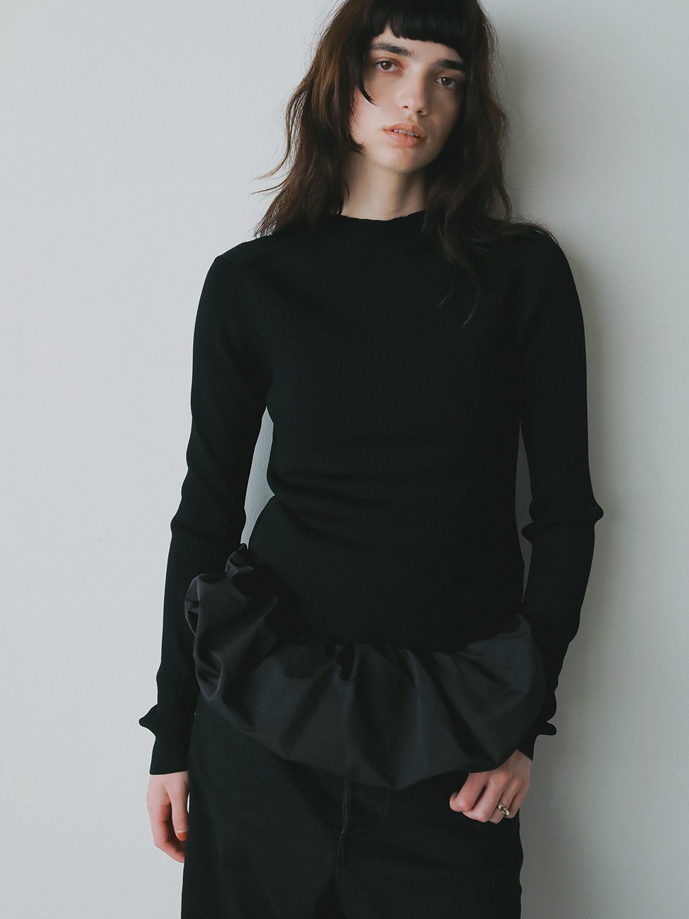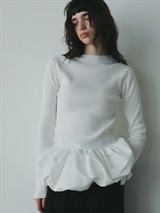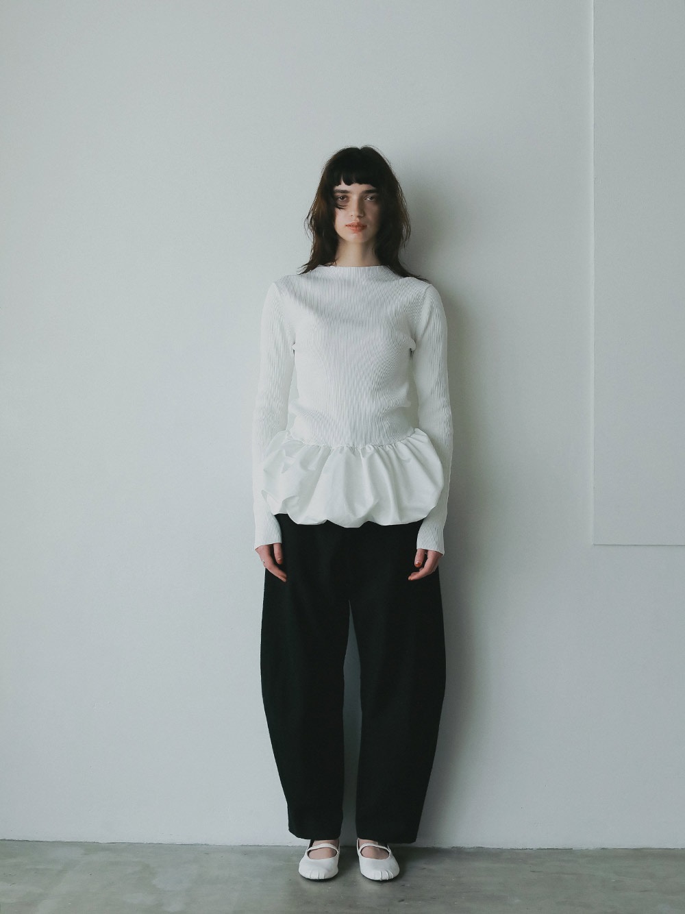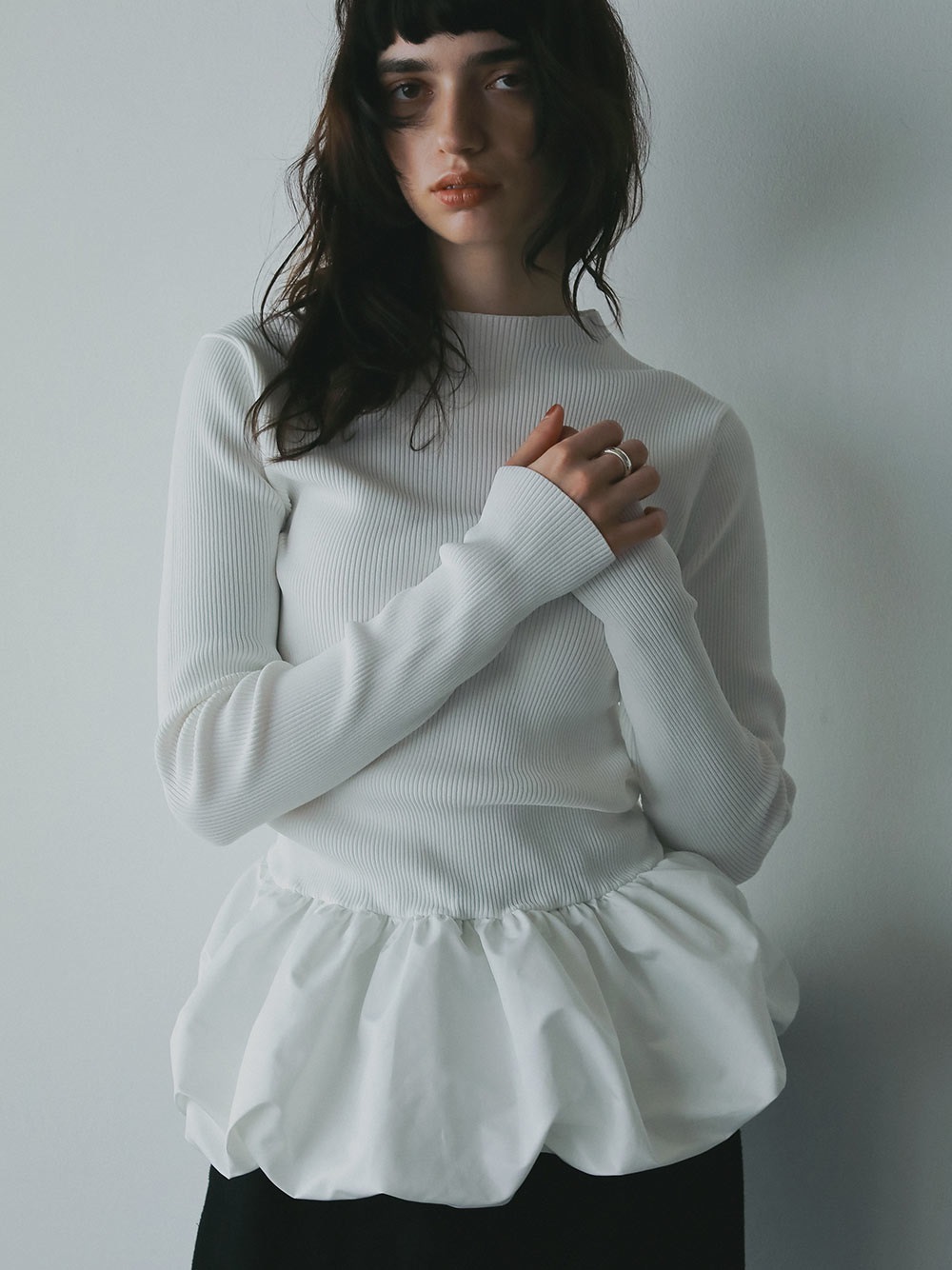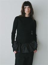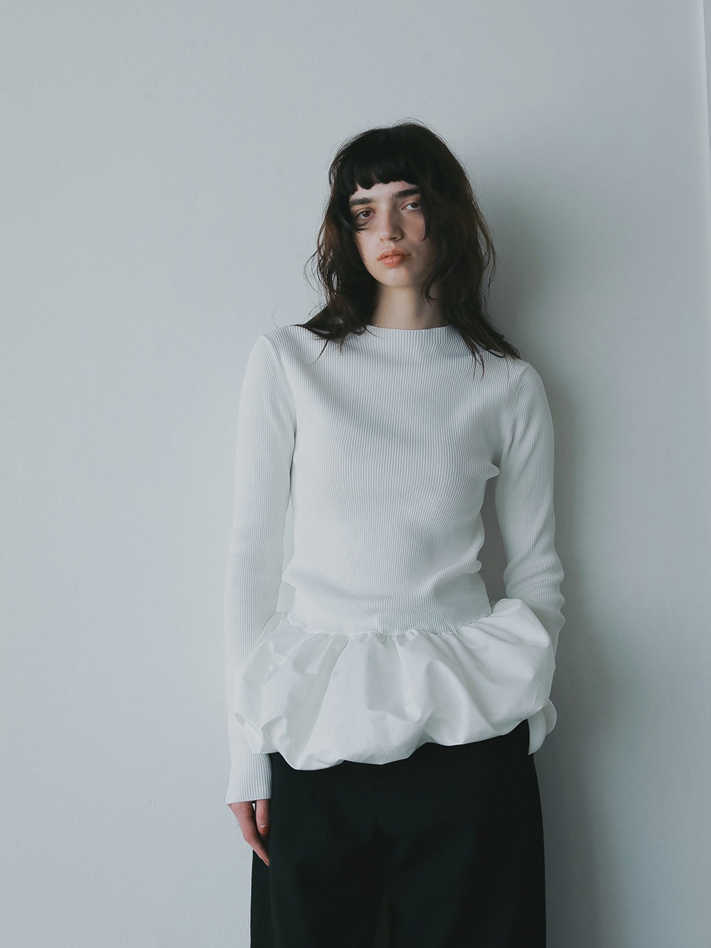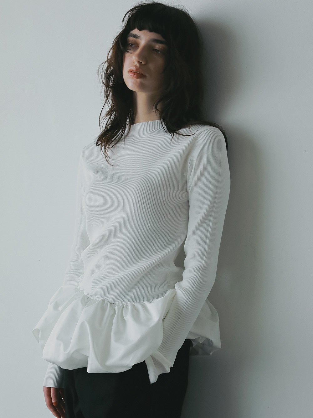 バルーンヘムが特徴のニットドッキングプルオーバー。ニット部分は細めのリブでスッキリ見えます。バルーン切替はギャザーの分量感と丈感にこだわり大人の女性が着られるサイジングに。ブラックはシンプルなパンツと合わせてパーティーシーンにも。