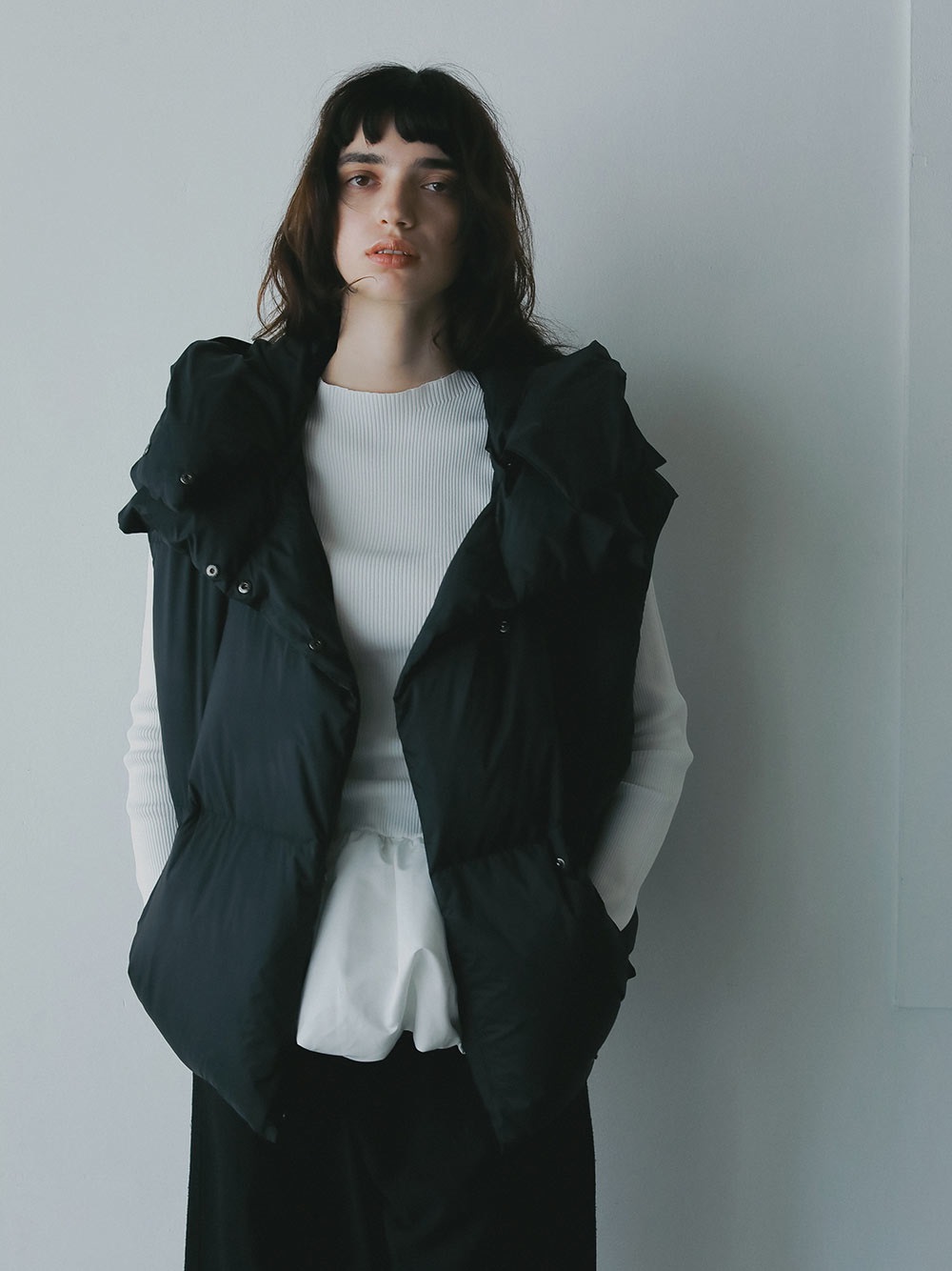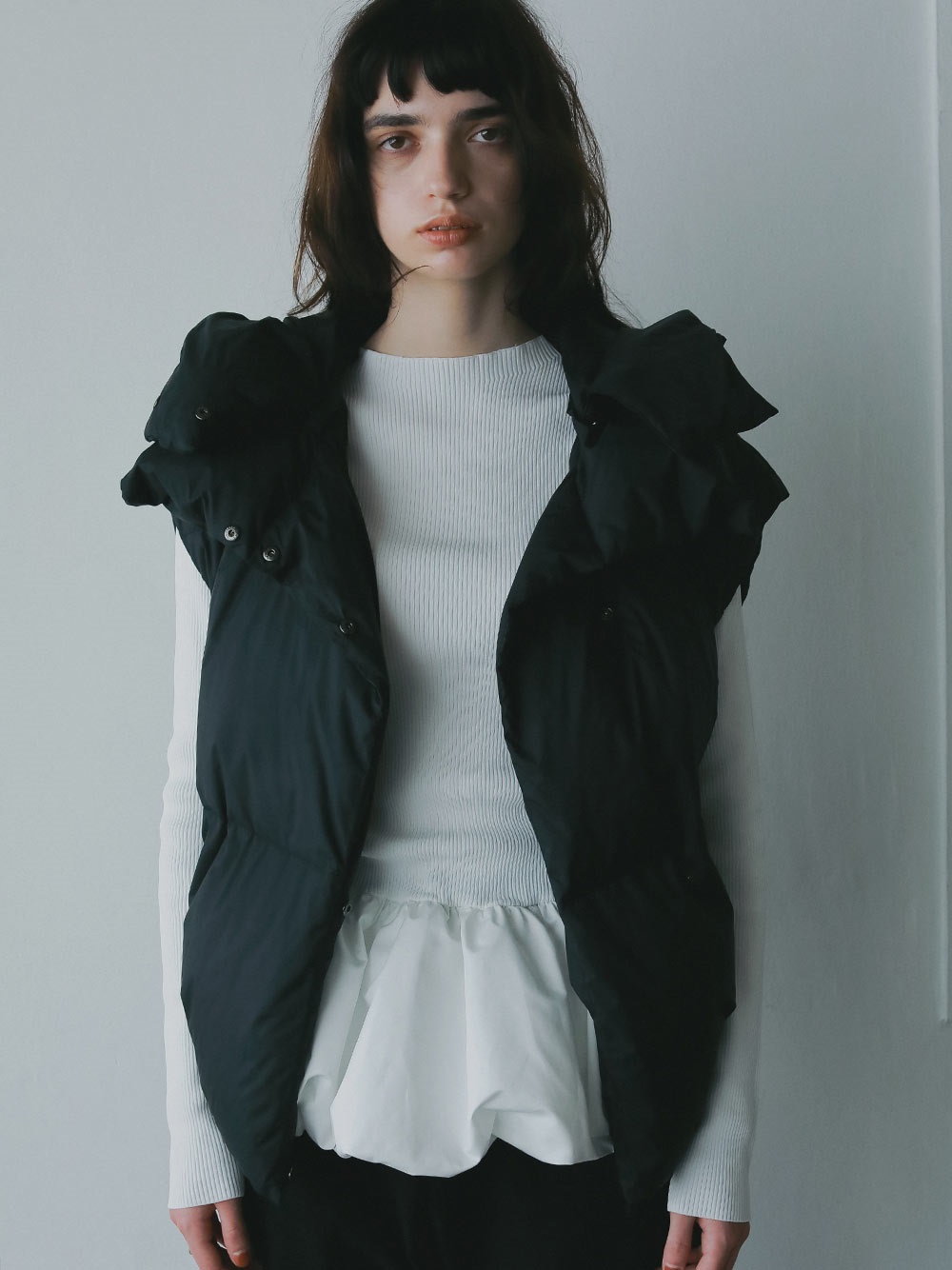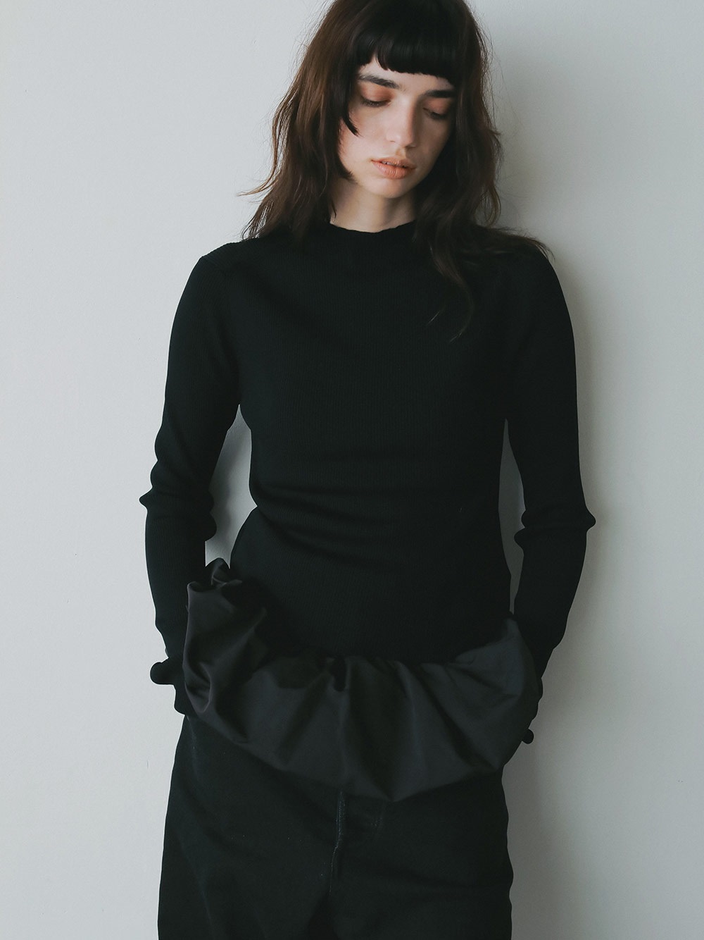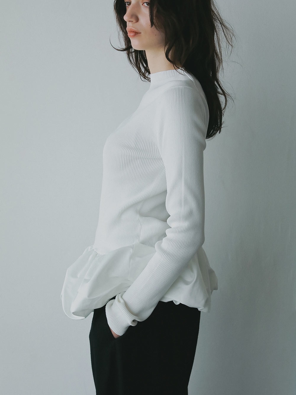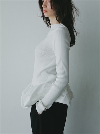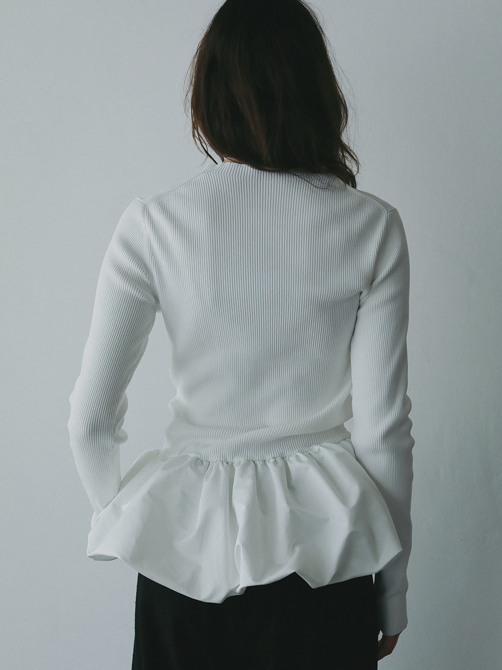 バルーンヘムが特徴のニットドッキングプルオーバー。ニット部分は細めのリブでスッキリ見えます。バルーン切替はギャザーの分量感と丈感にこだわり大人の女性が着られるサイジングに。ブラックはシンプルなパンツと合わせてパーティーシーンにも。