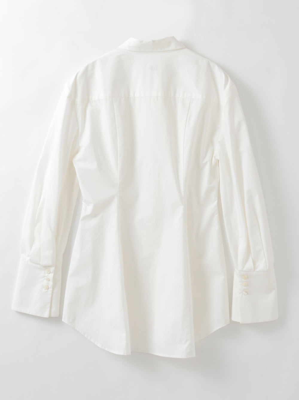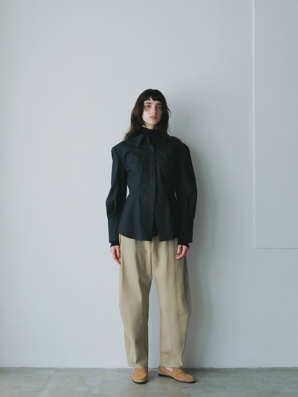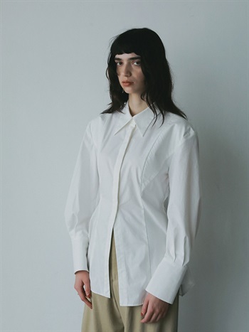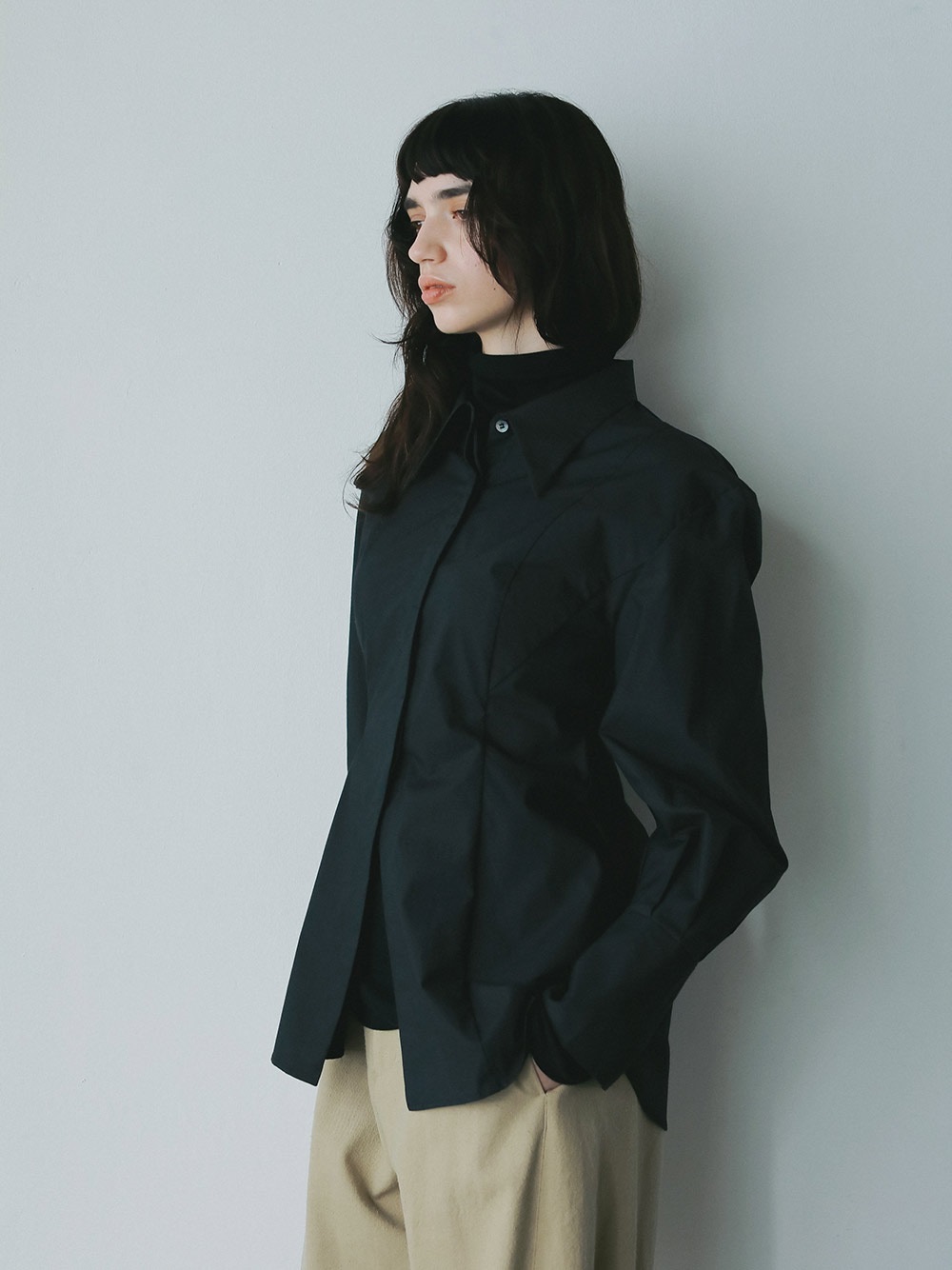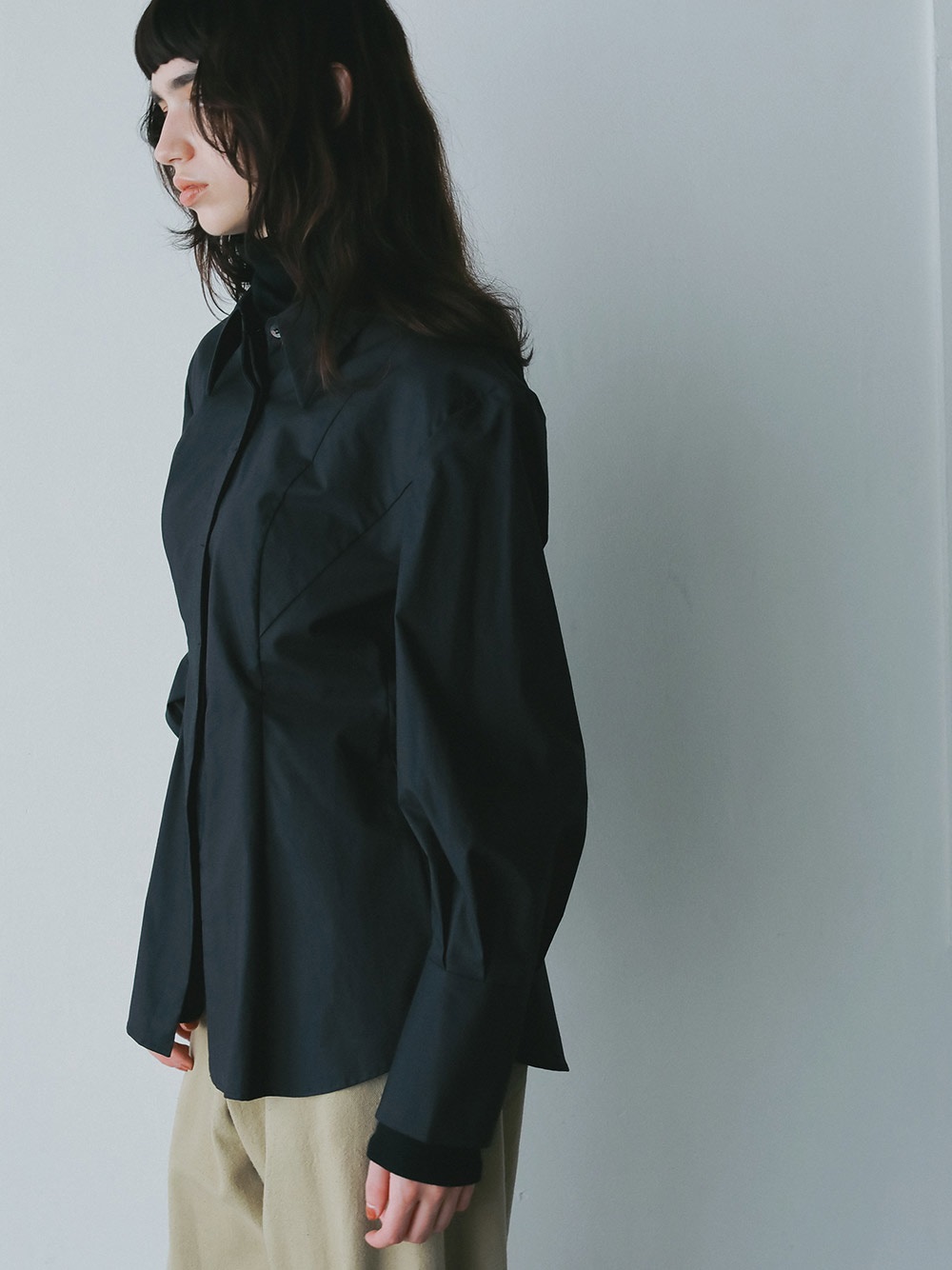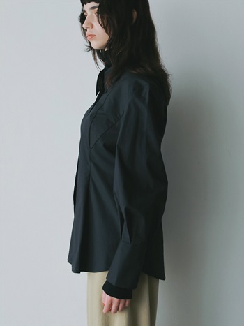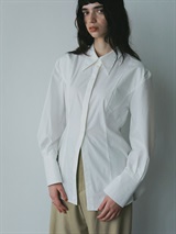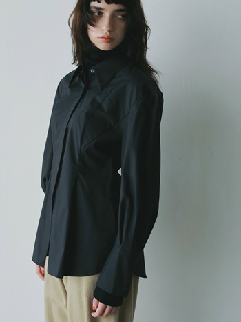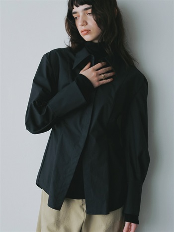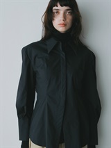 高密度に織られたコットン素材を使用したシャツブラウス。立体感のある型のデザインとすっきりシェイプしたウエストラインが特徴で、構築的なシルエットに仕上げました。モードにもエレガンスな雰囲気にもお召いただける1着です。ワッシャー加工を施した素材でナチュラルな膨らみ感とソフトな風合いが特徴でシーズンレスでお召頂ける素材感です。