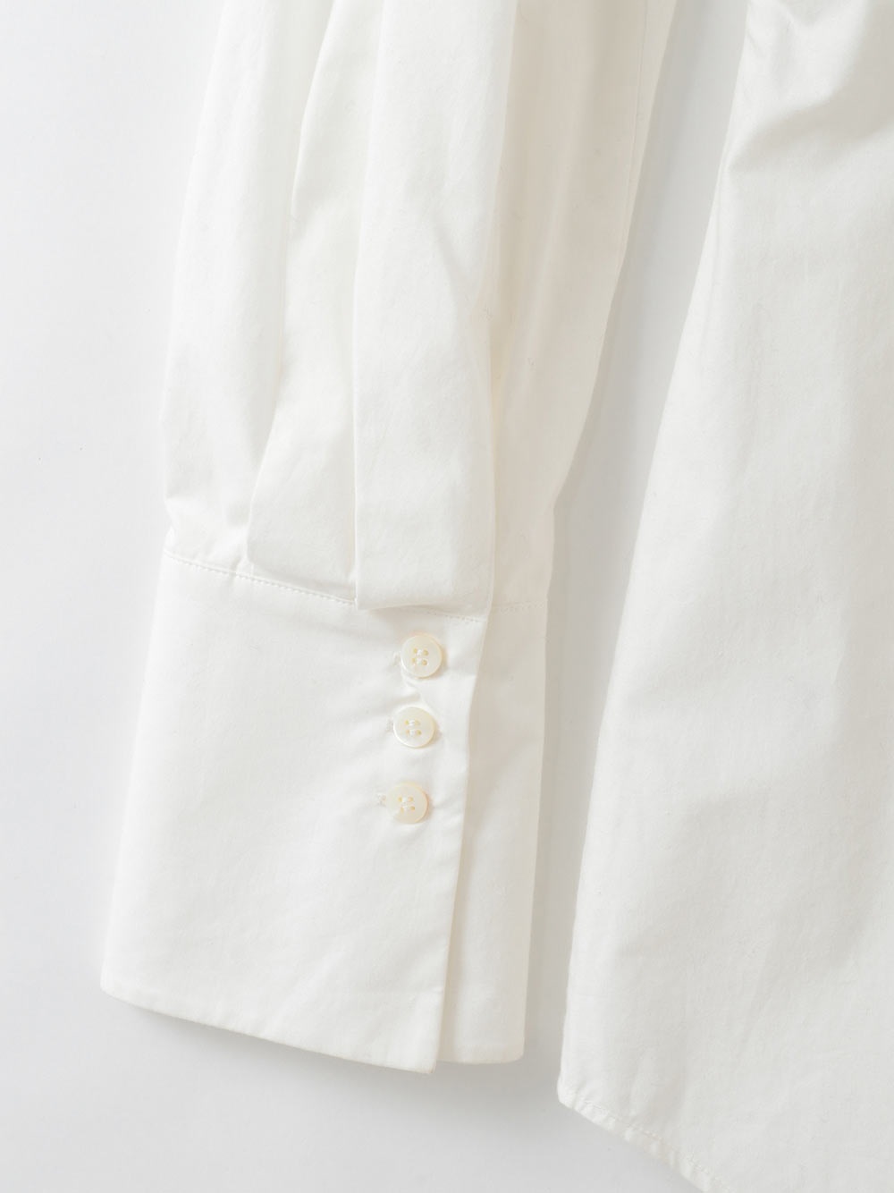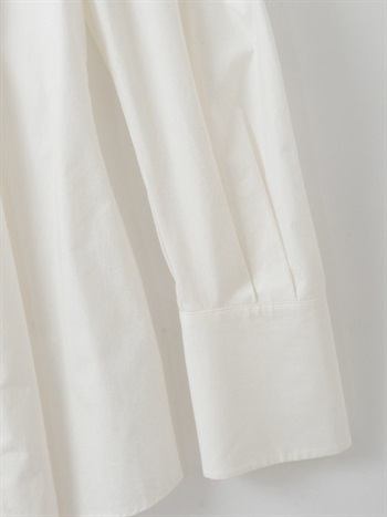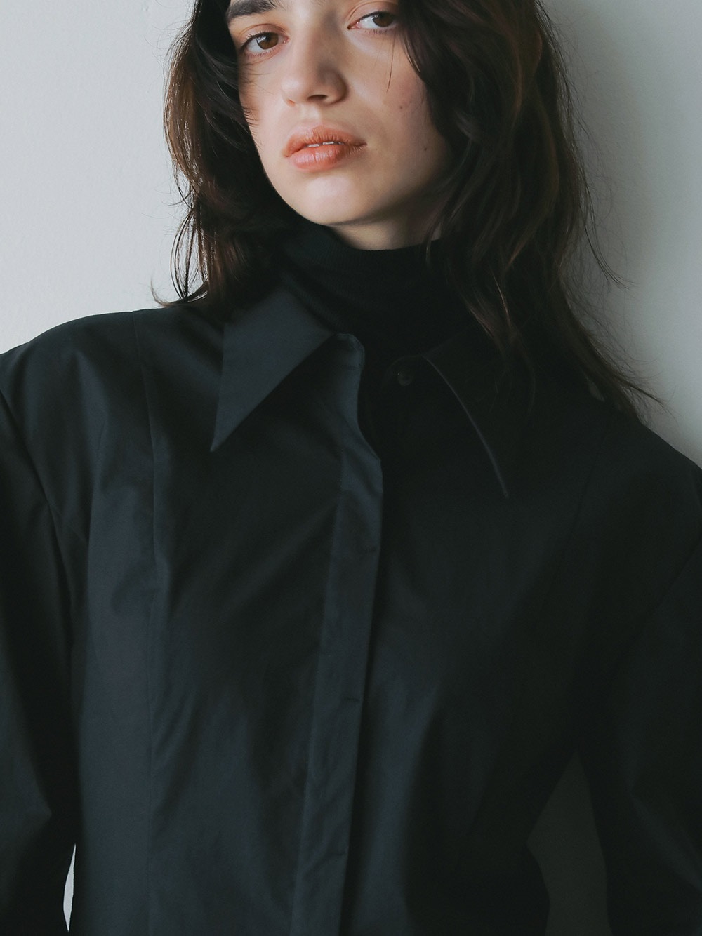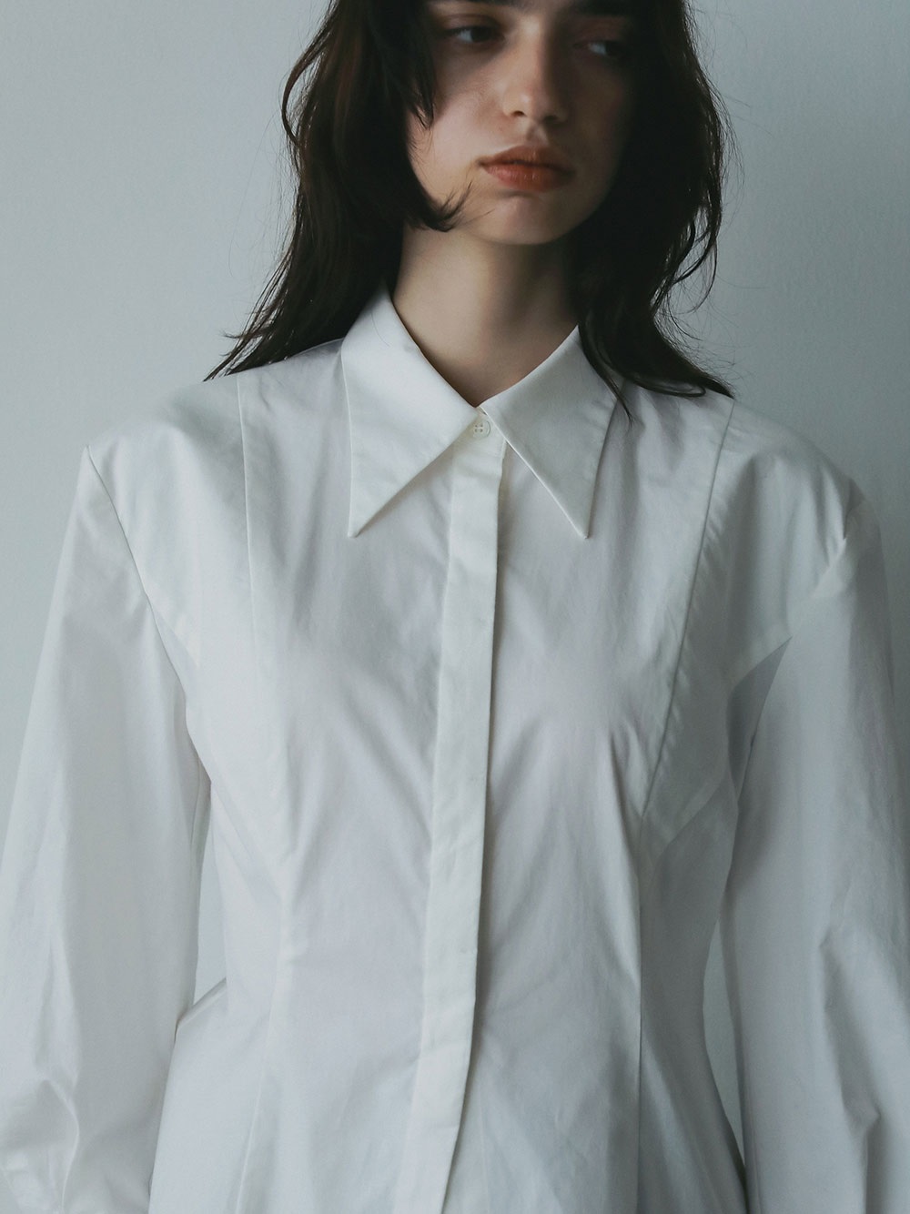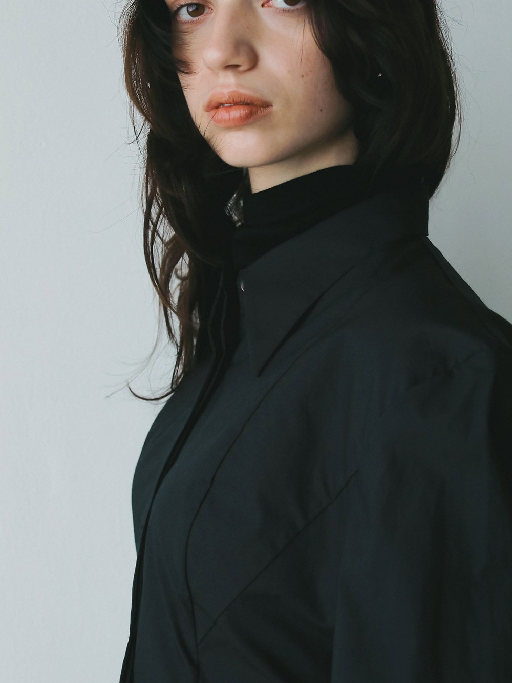 高密度に織られたコットン素材を使用したシャツブラウス。立体感のある型のデザインとすっきりシェイプしたウエストラインが特徴で、構築的なシルエットに仕上げました。モードにもエレガンスな雰囲気にもお召いただける1着です。ワッシャー加工を施した素材でナチュラルな膨らみ感とソフトな風合いが特徴でシーズンレスでお召頂ける素材感です。