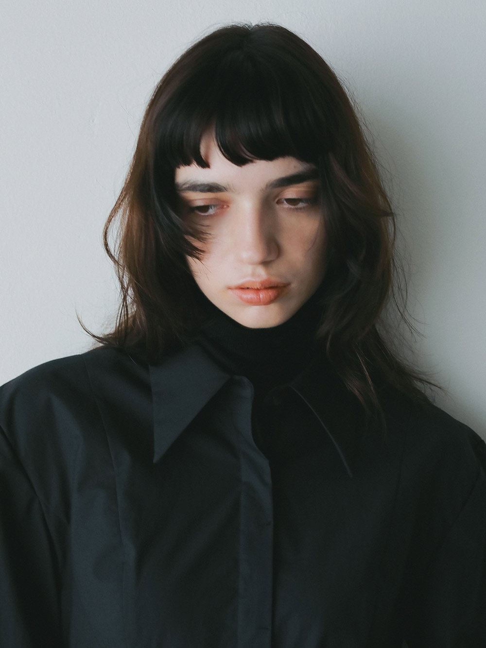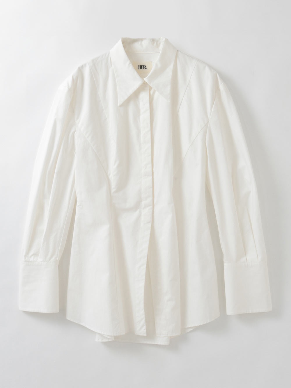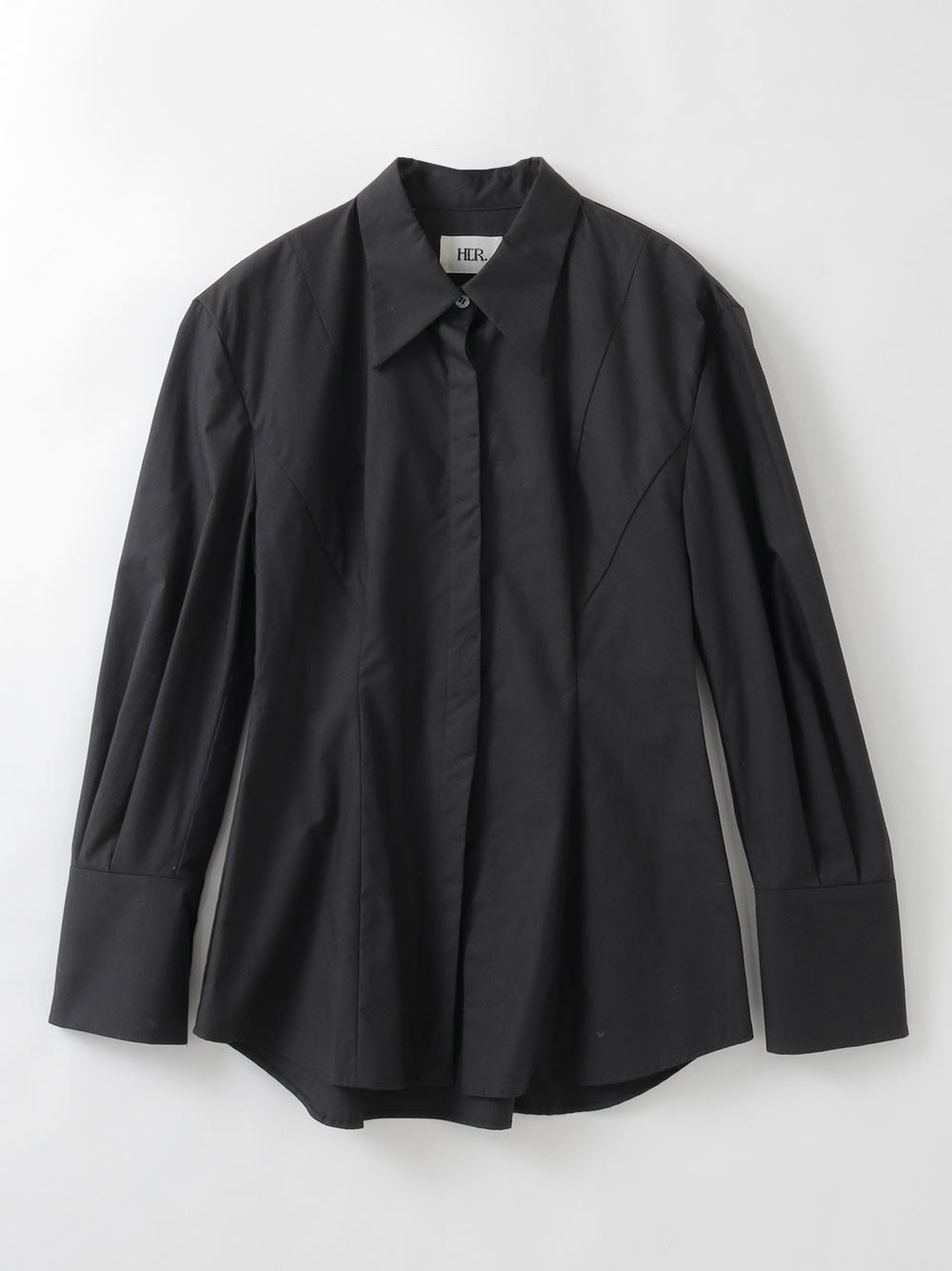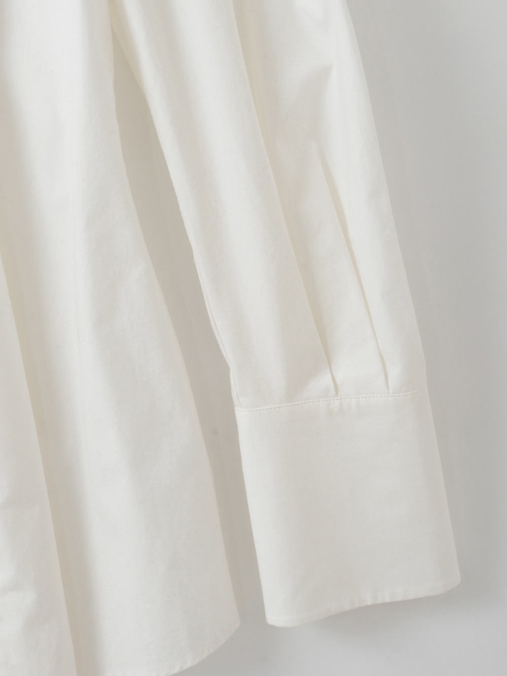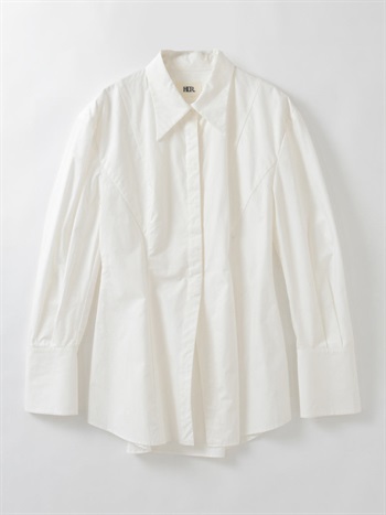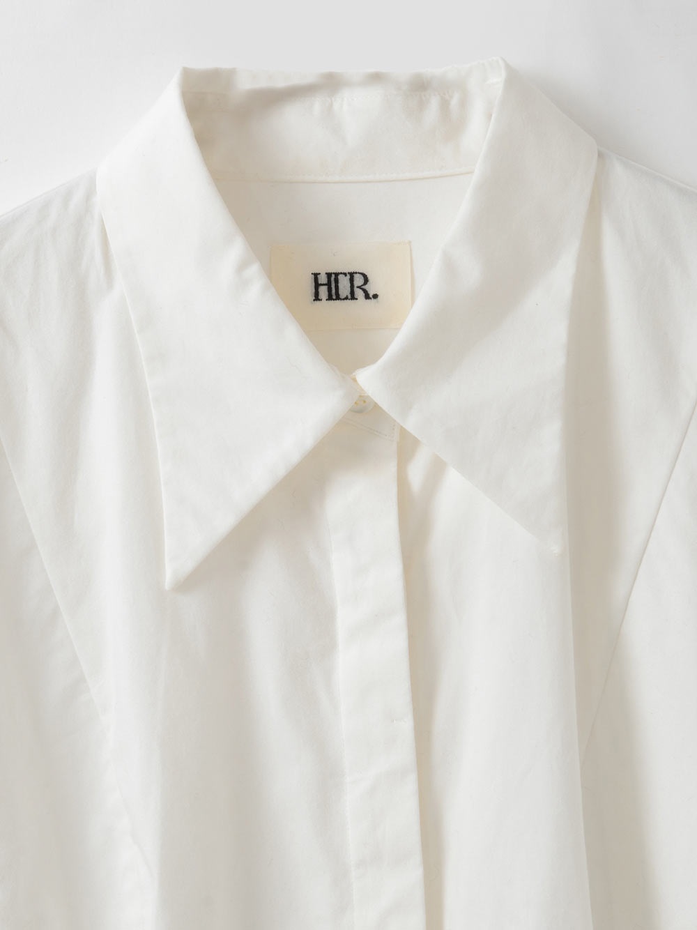 高密度に織られたコットン素材を使用したシャツブラウス。立体感のある型のデザインとすっきりシェイプしたウエストラインが特徴で、構築的なシルエットに仕上げました。モードにもエレガンスな雰囲気にもお召いただける1着です。ワッシャー加工を施した素材でナチュラルな膨らみ感とソフトな風合いが特徴でシーズンレスでお召頂ける素材感です。