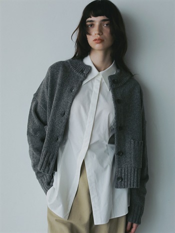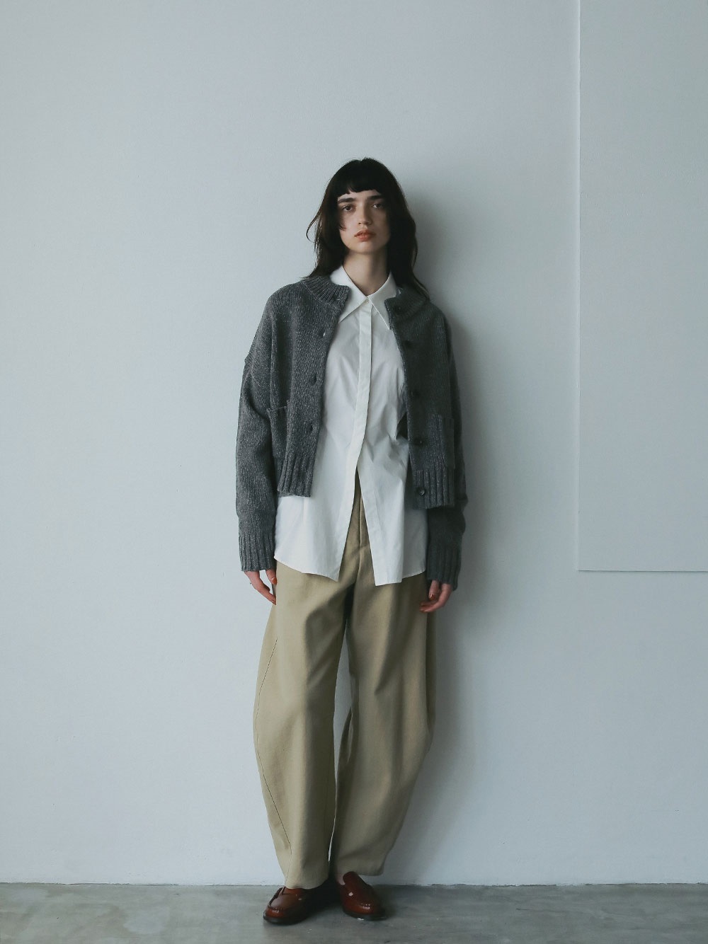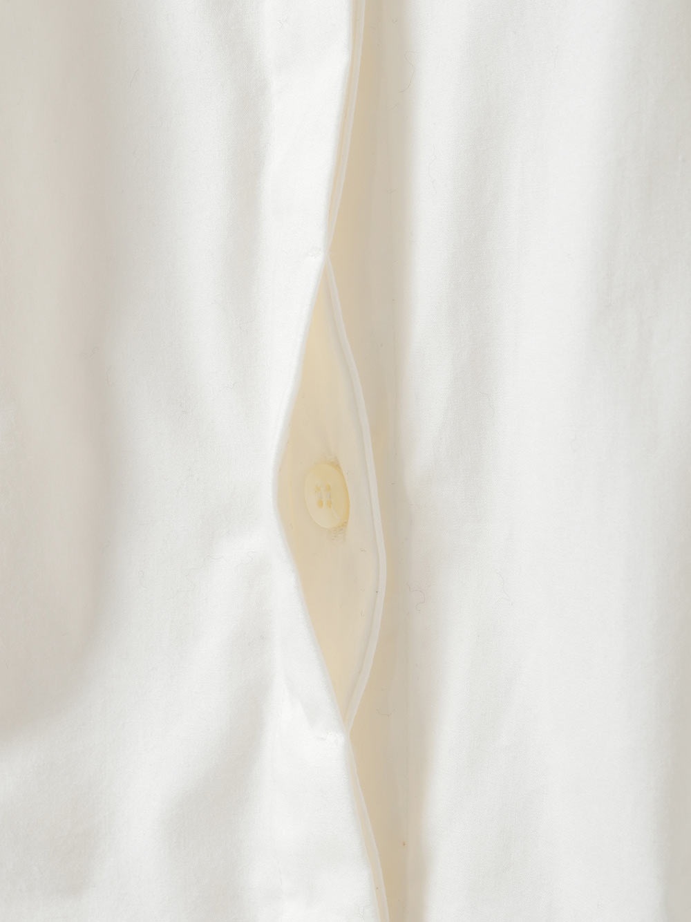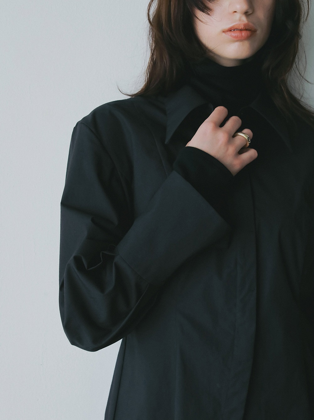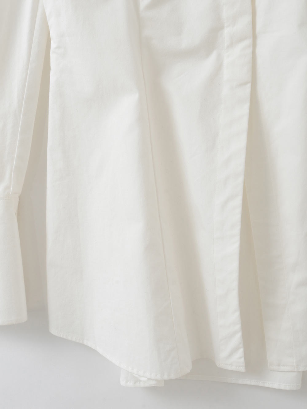 高密度に織られたコットン素材を使用したシャツブラウス。立体感のある型のデザインとすっきりシェイプしたウエストラインが特徴で、構築的なシルエットに仕上げました。モードにもエレガンスな雰囲気にもお召いただける1着です。ワッシャー加工を施した素材でナチュラルな膨らみ感とソフトな風合いが特徴でシーズンレスでお召頂ける素材感です。