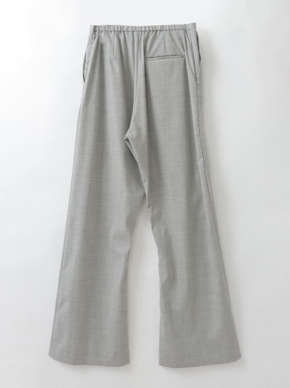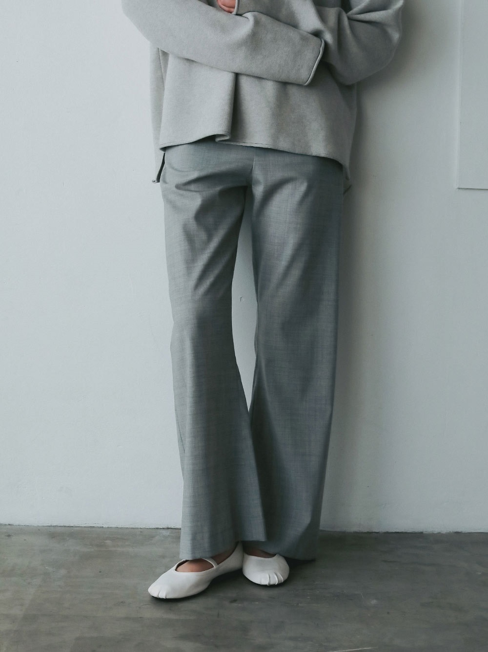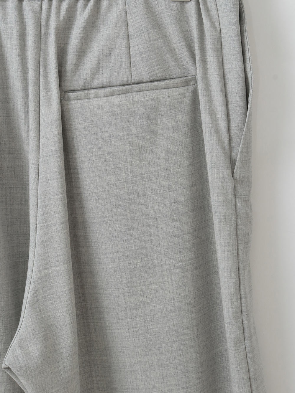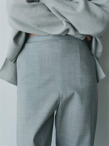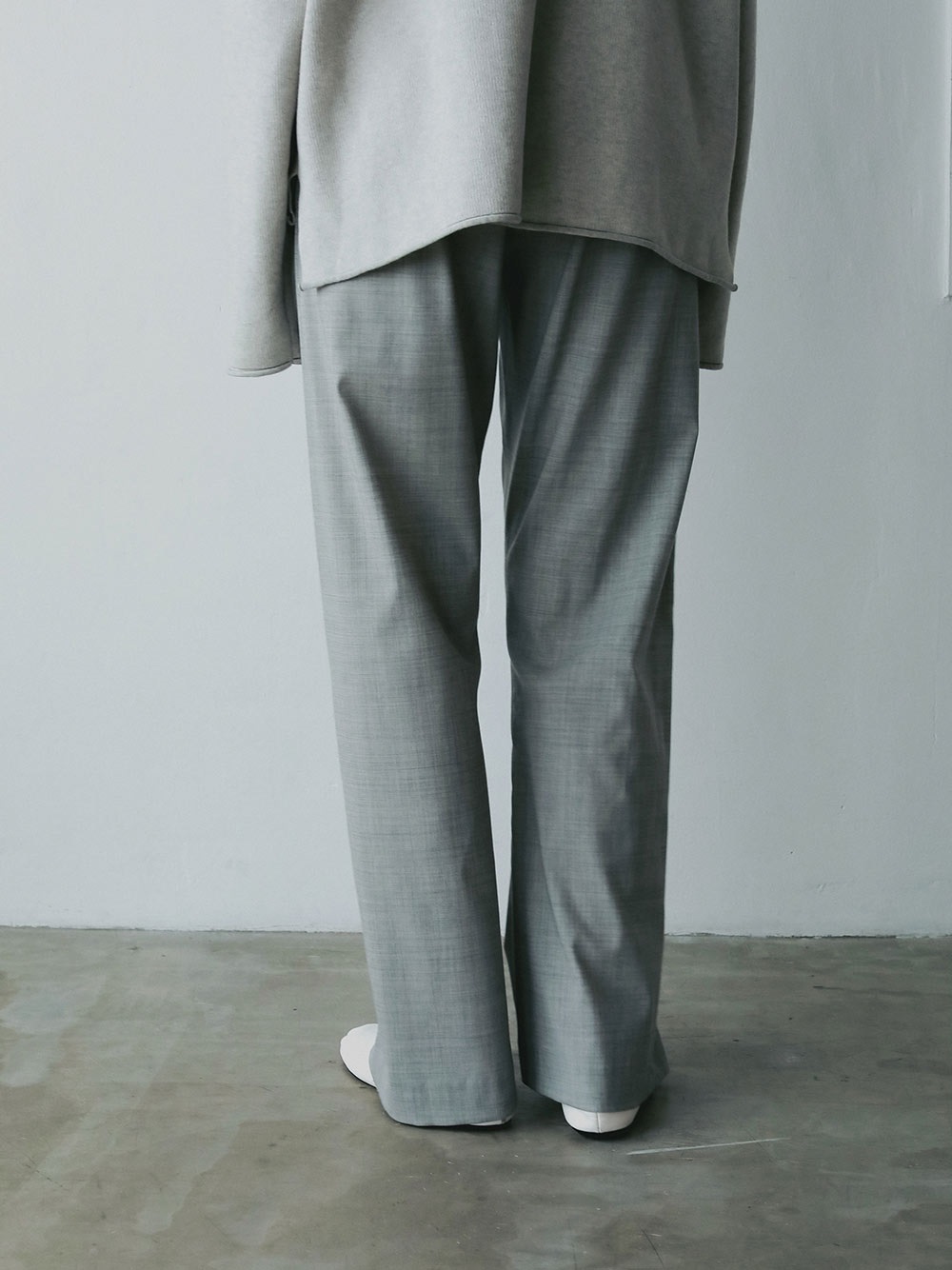 梳毛ウール混のイージーパンツ。なめらかで上品なウールの光沢と軽い仕上がりの生地はシーズンレスで着用できカジュアルにも綺麗めにも合わせられます。ウエストにタックやダーツがなくスッキリと着用できるだけでなく、ウエストの後ろはゴムなのできちんと見えてイージーな履き心地。適度なハりコシがあるのでシワになりにくい万能な1枚。
