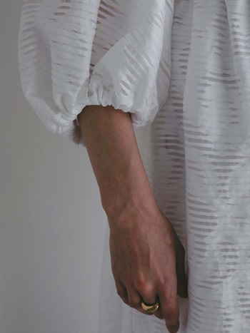 素材のハリ感を活かしたボリュームスリーブが特徴的な1枚。