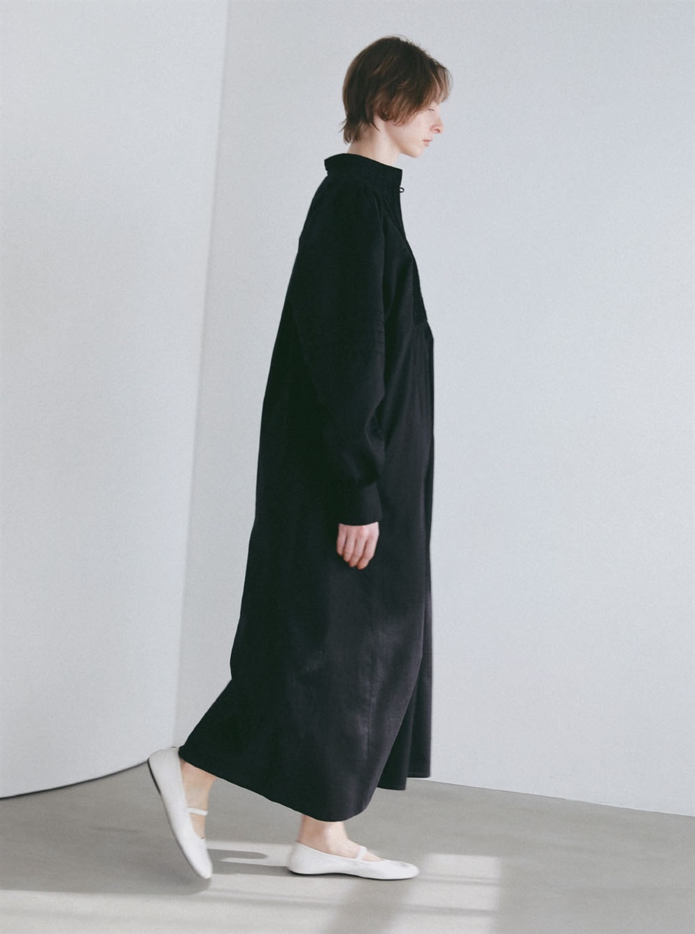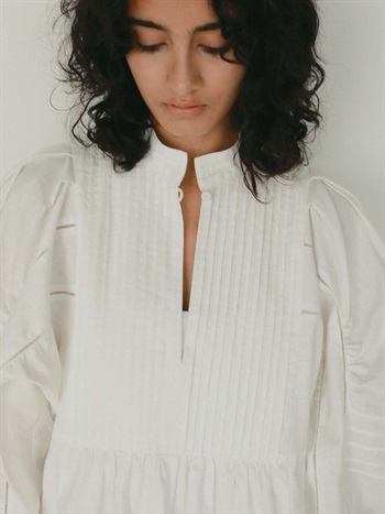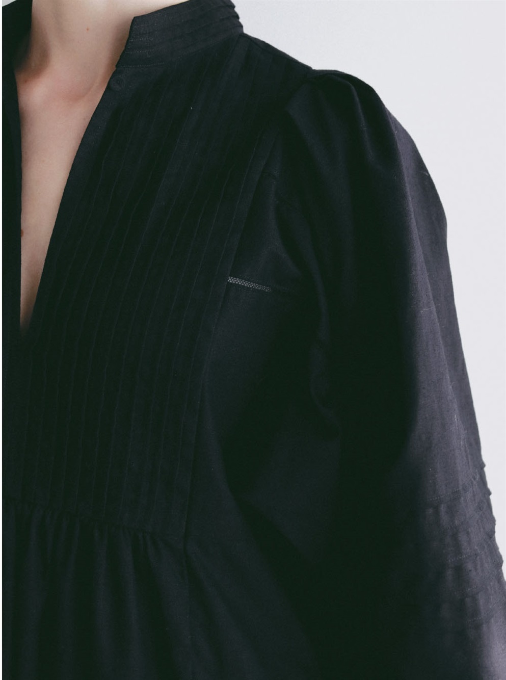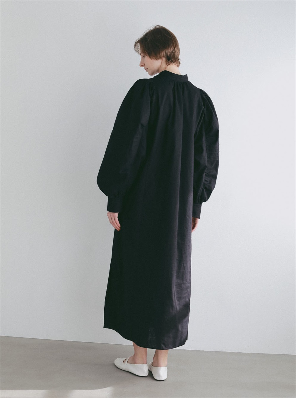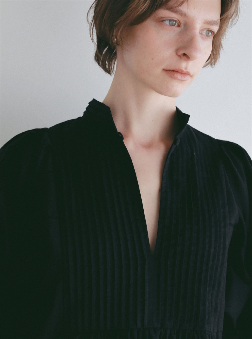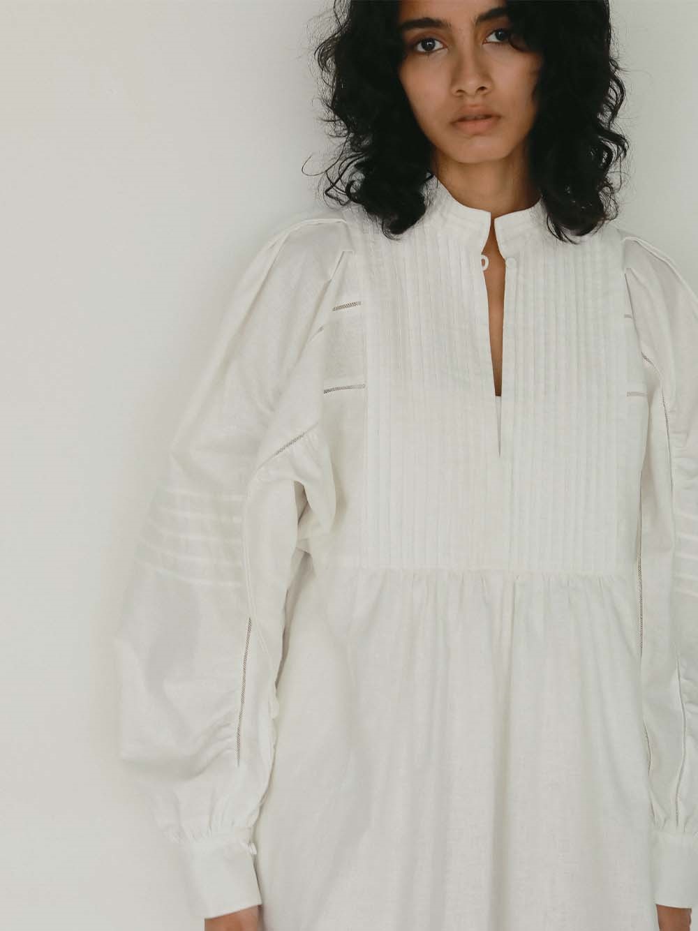 繊細なピンタックが幾重にも重なり目をひくボリュームドレス。