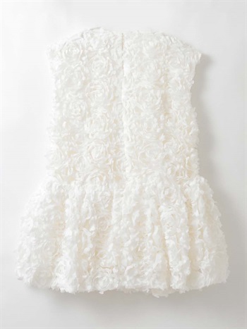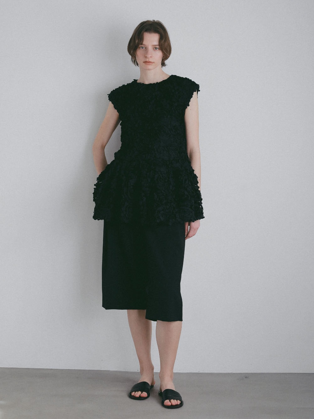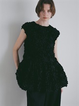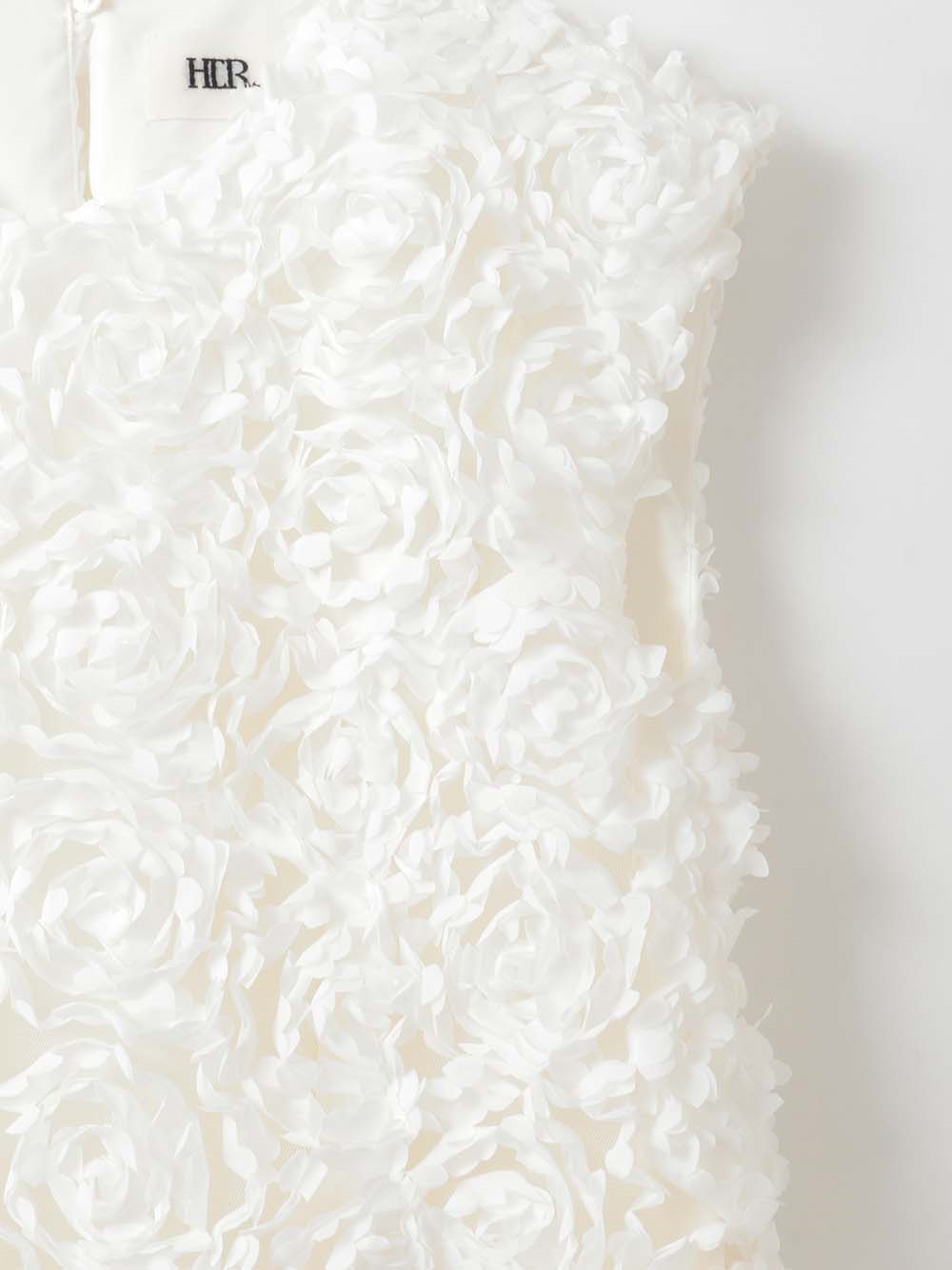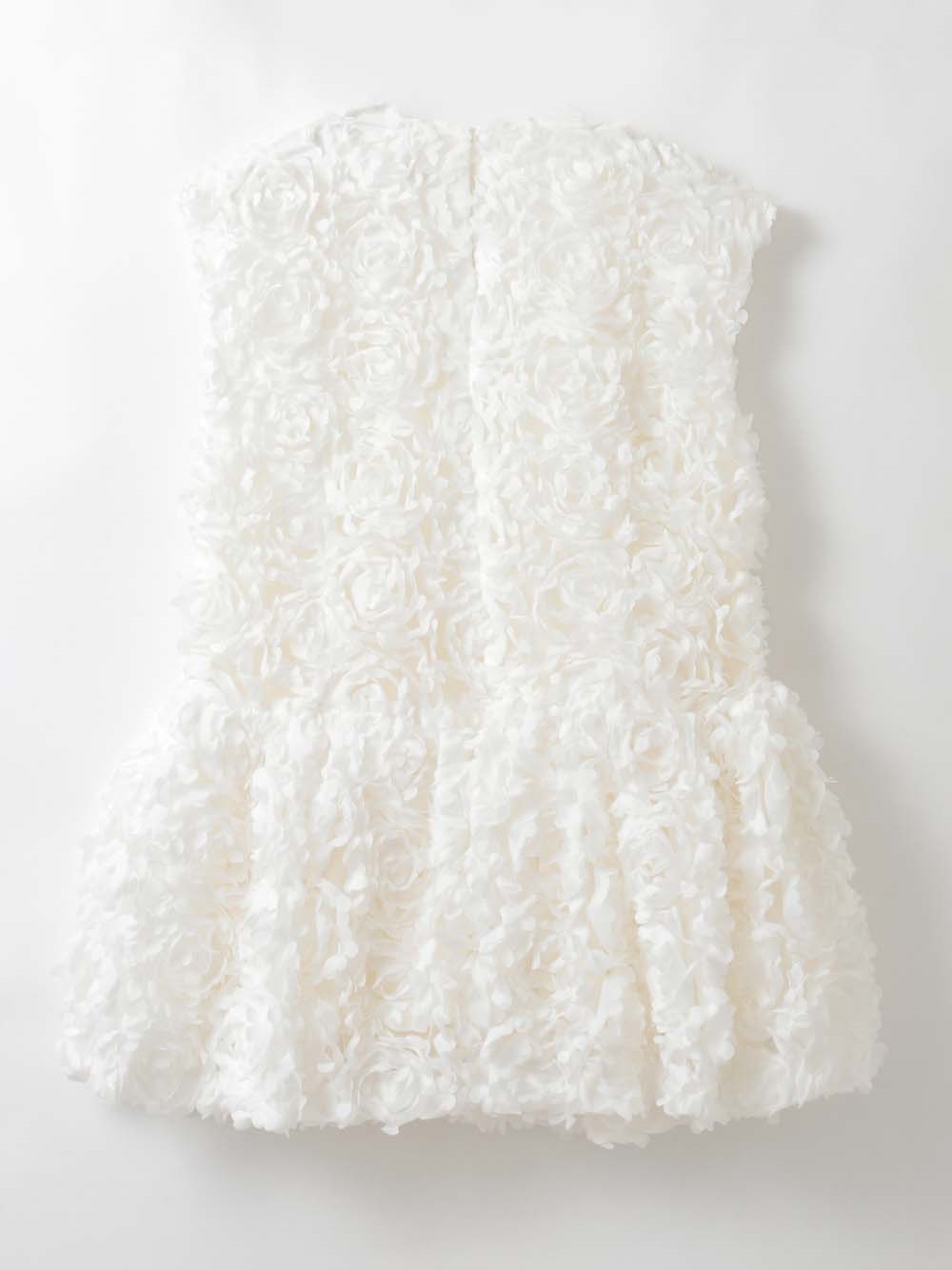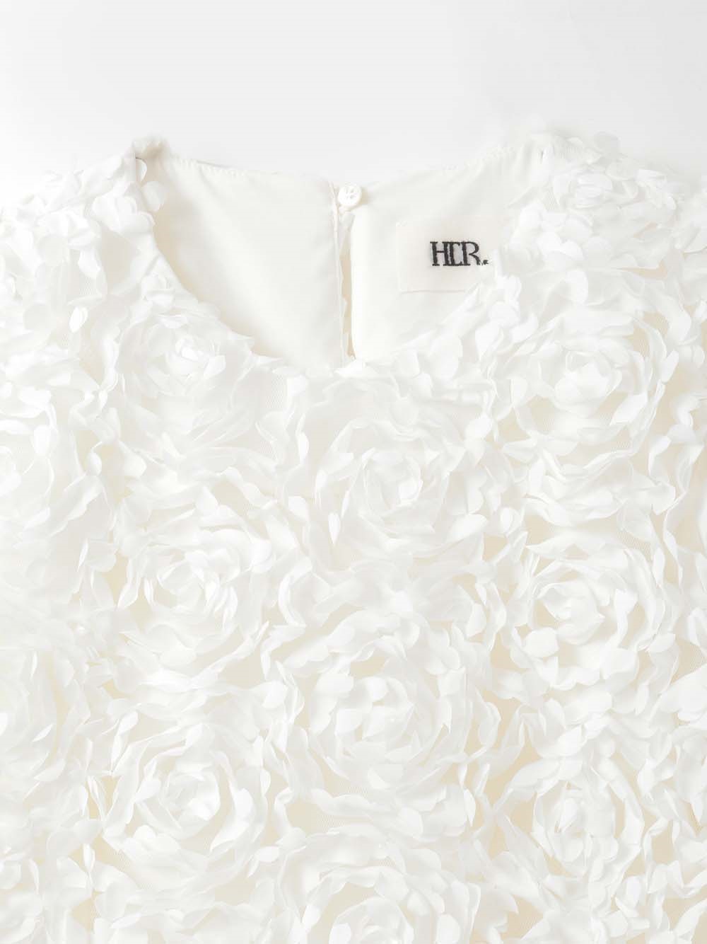 チュール素材に、花びらのような別素材のモチーフが全面刺繍されたリッチなレースを贅沢に