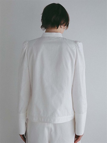 パワーショルダーの袖がデザインコンシャスな1枚。ブラウスですが素材の厚さやサイズ感も相まって、