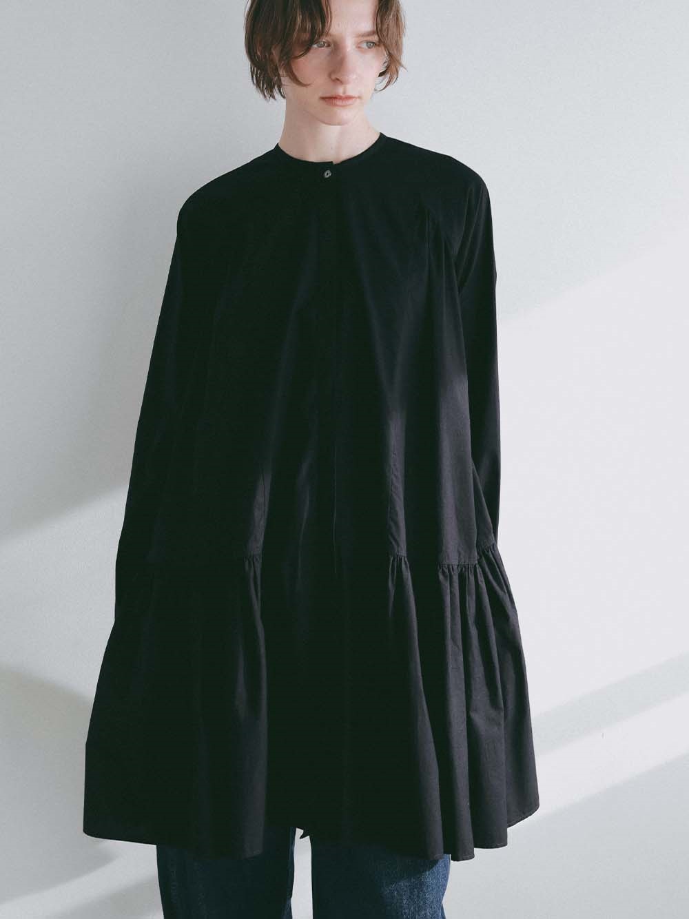 ローウエストで切替えたギャザーフレアが美しいチュニックブラウス。