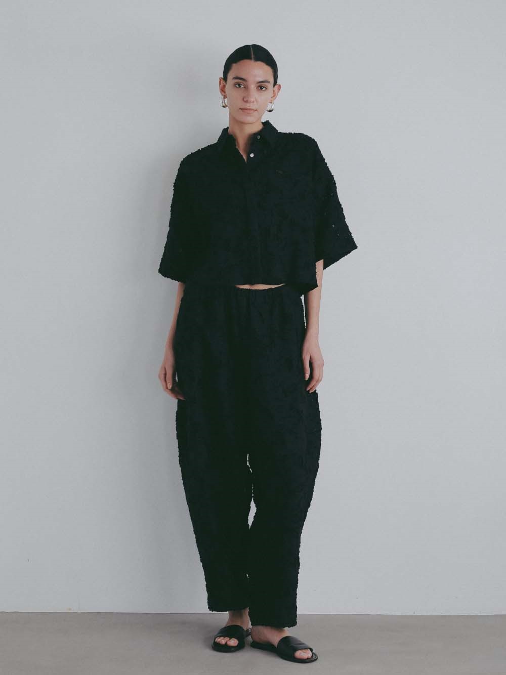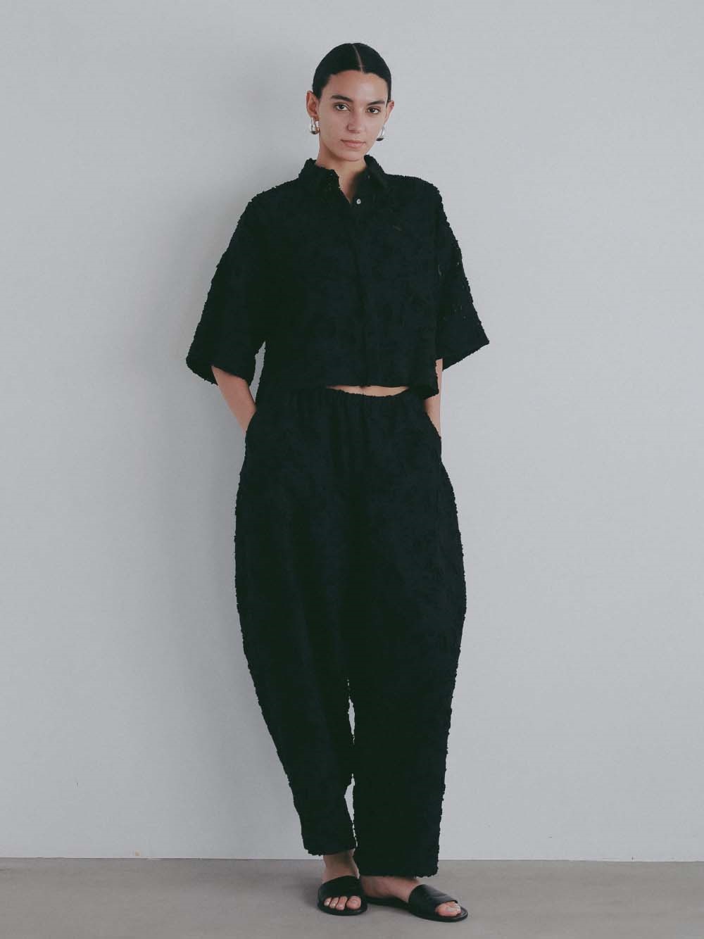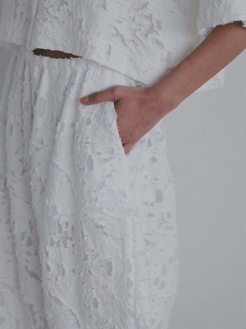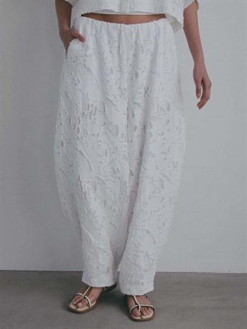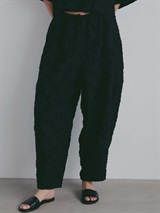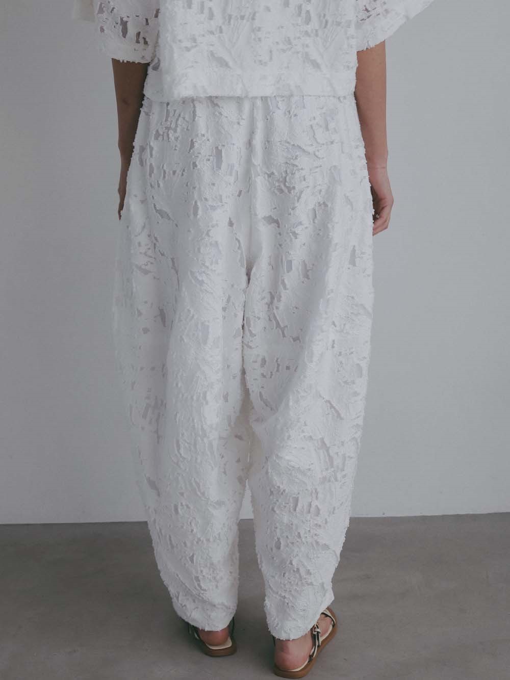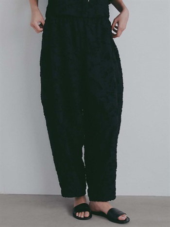 短い毛足による表情が特徴的なジャカードを使用したデザインパンツ。br> ヒップから膝辺りまでゆとりがあり、裾はすっきりとしためりはりのあるシルエット。br> 素材が華やかなのであえてイージーでラフにはけるデザインパンツにのせました。