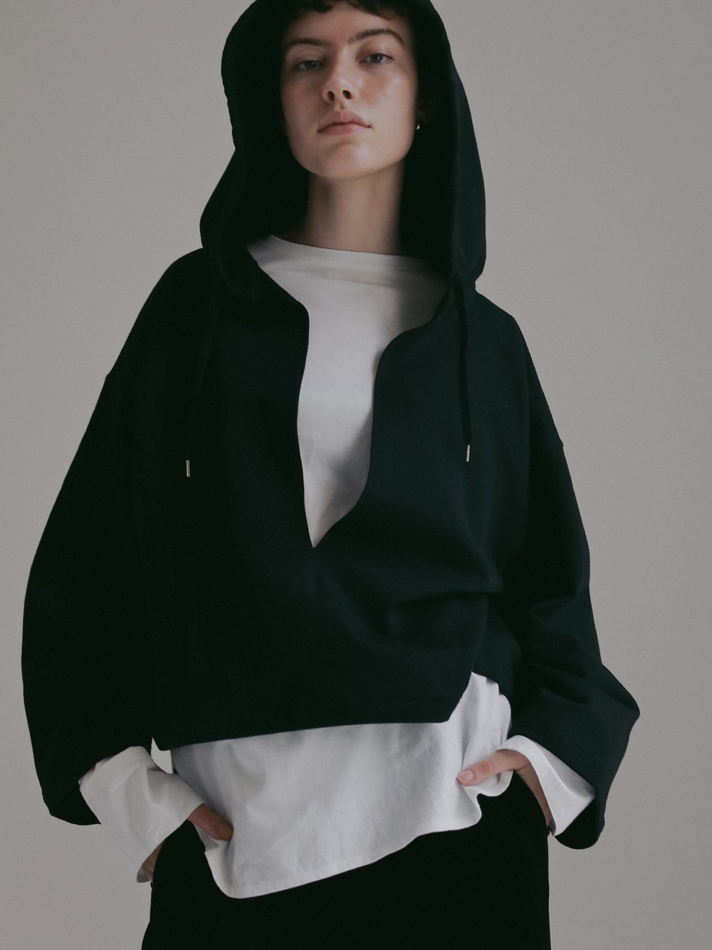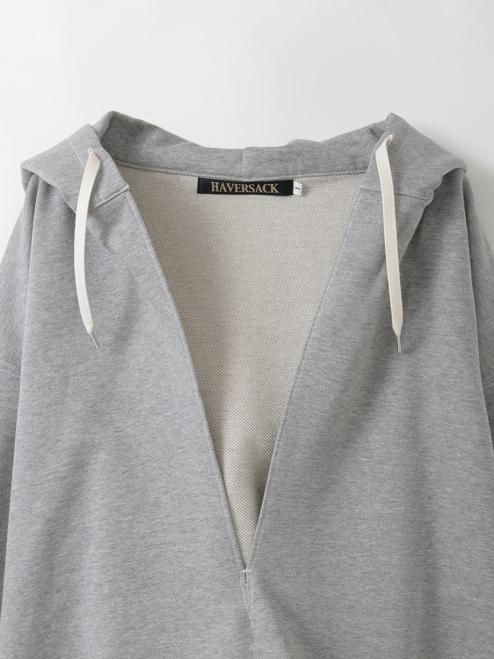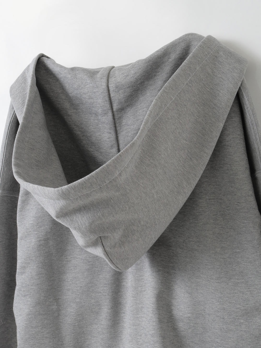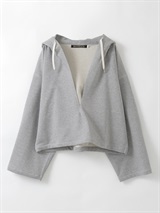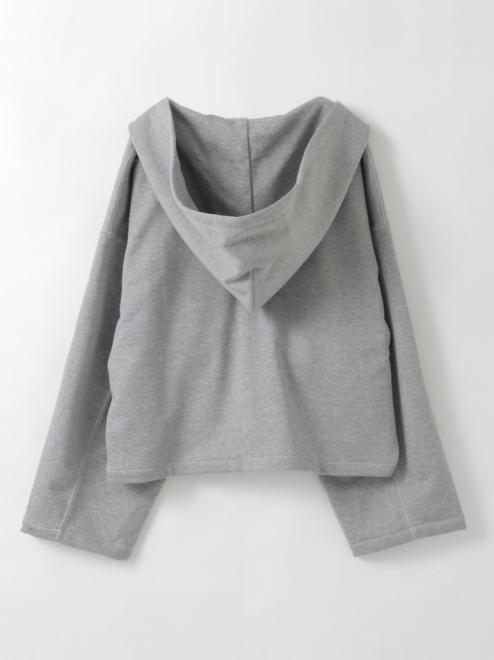前立ての深い切り込みが特徴のフーデットパーカー。