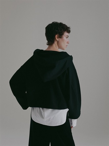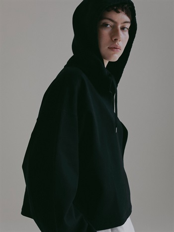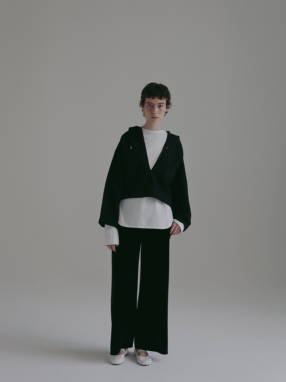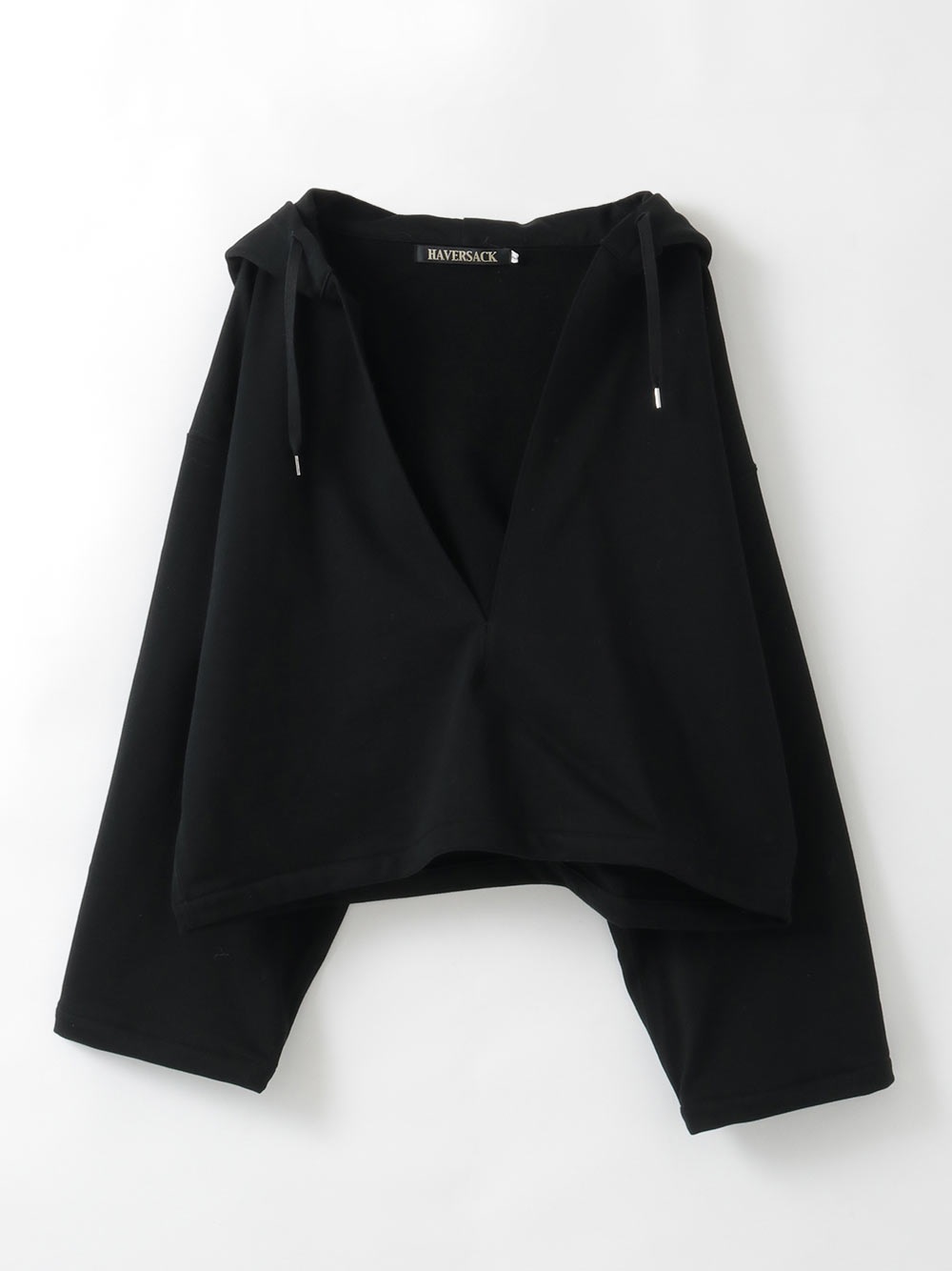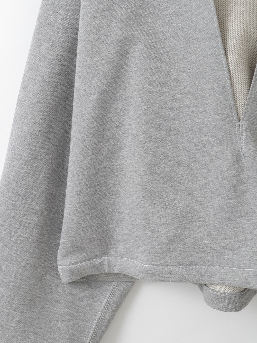 前立ての深い切り込みが特徴のフーデットパーカー。